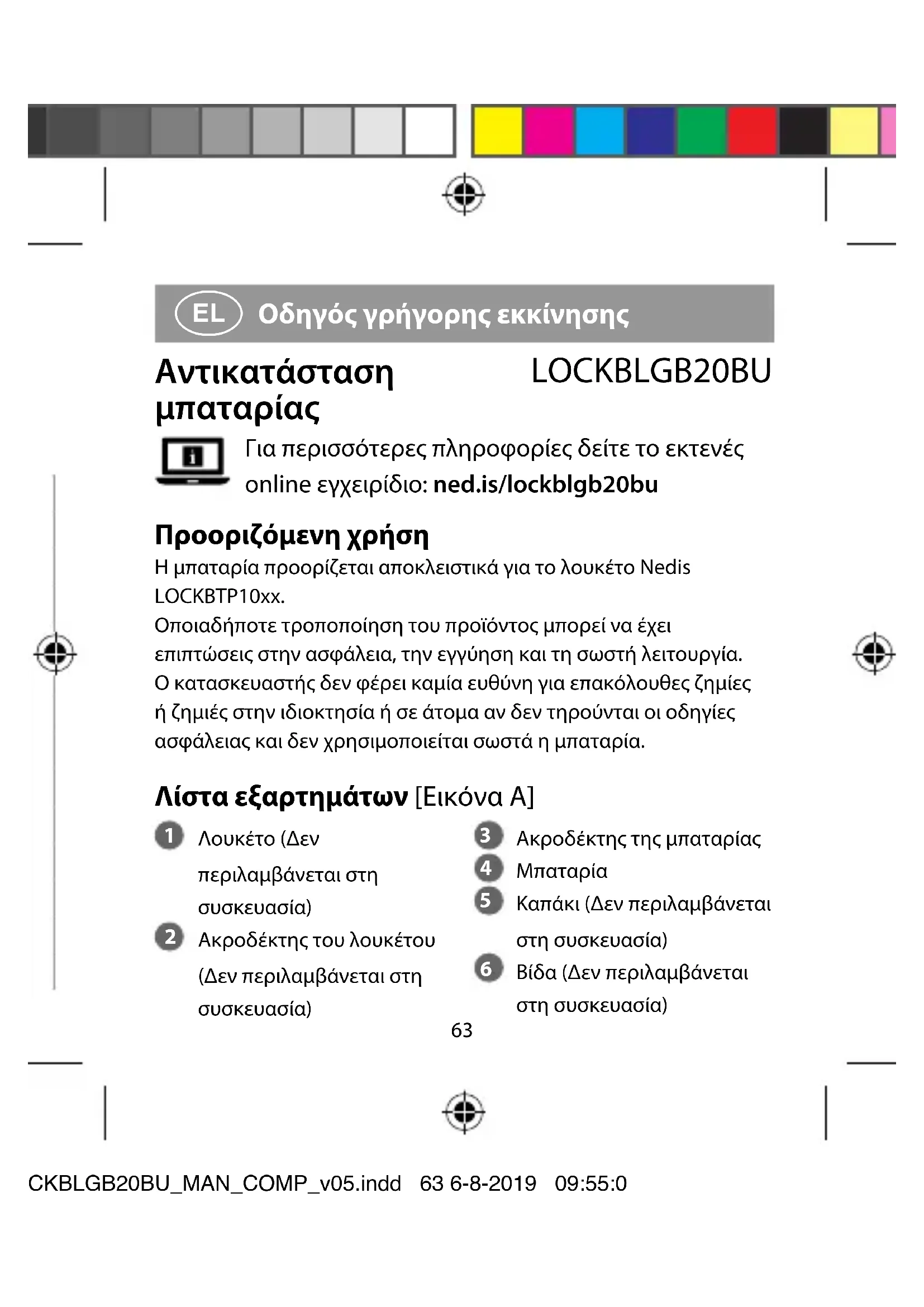 LOCKBLGB20BU Για περισσότερες πληροφορίες δείτε το εκτενές online εγχειρίδιο: ned.is/lockblgb20bu Προοριζόμενη χρήση Η μπαταρία προορίζεται αποκλειστικά για το λουκέτο Nedis LOCKBTP10xx. Οποιαδήποτε τροποποίηση του προϊόντος μπορεί να έχει επιπτώσεις στην ασφάλεια, την εγγύηση και τη σωστή λειτουργία. Ο κατασκευαστής δεν φέρει καμία ευθύνη για επακόλουθες ζημίες ή ζημιές στην ιδιοκτησία ή σε άτομα αν δεν τηρούνται οι οδηγίες ασφάλειας και δεν χρησιμοποιείται σωστά η μπαταρία. Λίστα εξαρτημάτων [Εικόνα A]