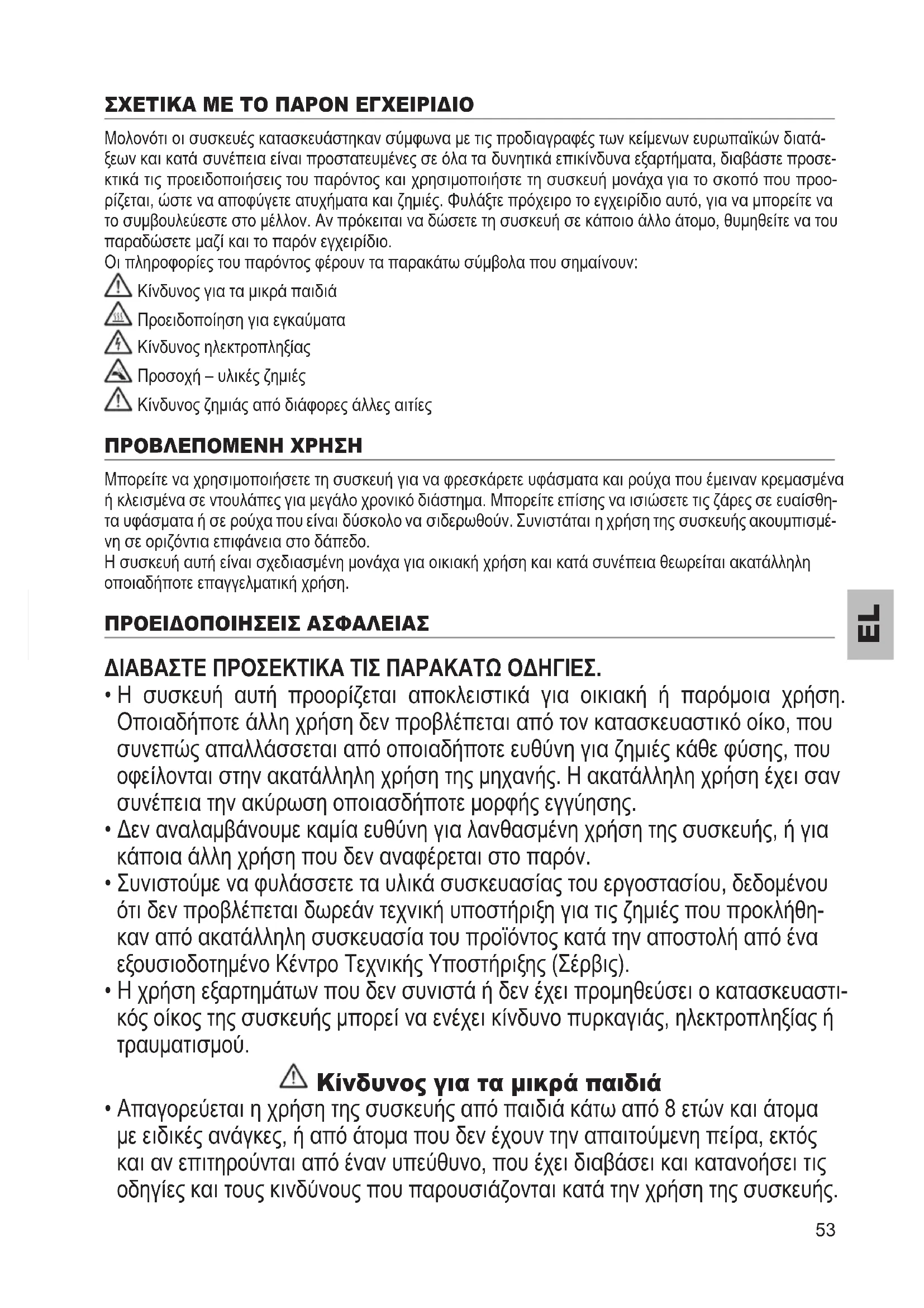 ΣΧΕΤΙΚΆ ΜΕ ΤΟ ΠΆΡΟΝ ΕΓΧΕΙΡΙΔΙΟ Μολονότι οι συσκευές κατασκευάστηκαν σύμφωνα με τις προδιαγραφές των κείμενων ευρωπαϊκών διατά- ξεων και κατά συνέπεια είναι προστατευμένες σε όλα τα δυνητικά επικίνδυνα εξαρτήματα, διαβάστε προσε- κτικά τις προειδοποιήσεις του παρόντος και χρησιμοποιήστε τη συσκευή μονάχα για το σκοπό που προο- ρίζεται, ώστε να αποφύγετε ατυχήματα και ζημιές. Φυλάξτε πρόχειρο το εγχειρίδιο αυτό, για να μπορείτε να το συμβουλεύεστε στο μέλλον. Αν πρόκειται να δώσετε τη συσκευή σε κάποιο άλλο άτομο, θυμηθείτε να του παραδώσετε μαζί και το παρόν εγχειρίδιο. Οι πληροφορίες του παρόντος φέρουν τα παρακάτω σύμβολα που σημαίνουν: Κίνδυνος για τα μικρά παιδιά Προειδοποίηση για εγκαύματα Κίνδυνος ηλεκτροπληξίας Προσοχή – υλικές ζημιές Κίνδυνος ζημιάς από διάφορες άλλες αιτίες ΠΡΟΒΛΕΠΟΜΕΝΗ ΧΡΗΣΗ Μπορείτε να χρησιμοποιήσετε τη συσκευή για να φρεσκάρετε υφάσματα και ρούχα που έμειναν κρεμασμένα ή κλεισμένα σε ντουλάπες για μεγάλο χρονικό διάστημα. Μπορείτε επίσης να ισιώσετε τις ζάρες σε ευαίσθη- τα υφάσματα ή σε ρούχα που είναι δύσκολο να σιδερωθούν. Συνιστάται η χρήση της συσκευής ακουμπισμέ- νη σε οριζόντια επιφάνεια στο δάπεδο. Η συσκευή αυτή είναι σχεδιασμένη μονάχα για οικιακή χρήση και κατά συνέπεια θεωρείται ακατάλληλη οποιαδήποτε επαγγελματική χρήση. ΠΡΟΕΙΔΟΠΟΙΗΣΕΙΣ ΆΣΦΆΛΕΙΆΣ ΔΙΑΒΑΣΤΕ ΠΡΟΣΕΚΤΙΚΑ ΤΙΣ ΠΑΡΑΚΑΤΩ ΟΔΗΓΙΕΣ.