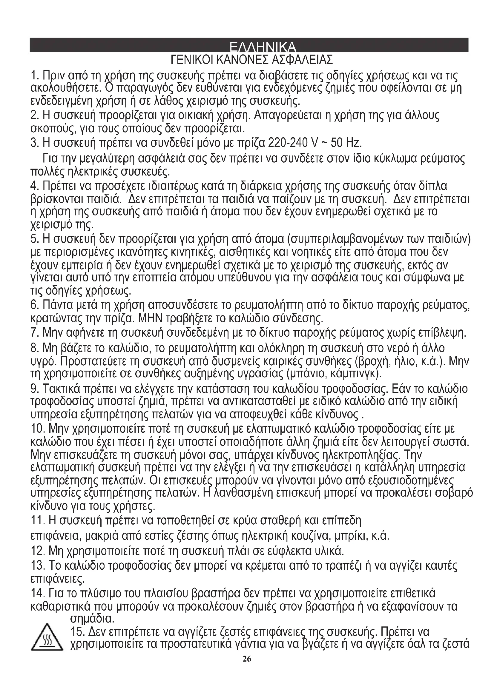 15. Δεν επιτρέπετε να αγγίζετε ζεστές επιφάνειες της συσκευής. Πρέπει να