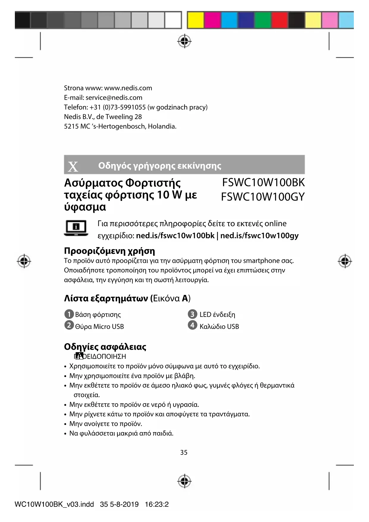 , το οποίο κατασκευάζεται στην Κίνα, έχει ελεγχθεί σύμφωνα με όλα τα σχετικά πρότυπα και κανονισμούς της ΕΚ και ότι όλοι οι έλεγχοι έχει ολοκληρωθεί με επιτυχία. Η δήλωση συμμόρφωσης περιλαμβάνει αλλά δεν περιορίζεται στον κανονισμό RED 2014/53/EU. Το πλήρες κείμενο της δήλωσης συμμόρφωσης (και το δελτίο ασφάλεια όπου ισχύει) υπάρχει και είναι διαθέσιμο προς λήψη στο: webshop.nedis.com/FSWC10W100BK#support webshop.nedis.com/FSWC10W100GY#support Για περισσότερες πληροφορίες σχετικά με τη δήλωση συμμόρφωσης, επικοινωνήστε με την υπηρεσία εξυπηρέτησης πελατών: Web: www.nedis.com E-mail: service@nedis.com Τηλ.: +31 (0)73-5991055 (ώρες γραφείου) Nedis B.V., de Tweeling 28 5215 MC ’s-Hertogenbosch, the Netherlands