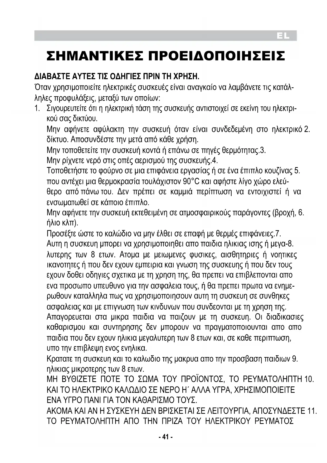 Προσέξτε ώστε το καλώδιο να μην έλθει σε επαφή με θερμές επιφάνειες.7. Αυτη η συσκευη μπορει να χρησιμοποιηθει απο παιδια ηλικιας ισης ή μεγα-8. λυτερης των 8 ετων. Ατομα με μειωμενες φυσικες, αισθητηριες ή νοητικες ικανοτητες ή που δεν εχουν εμπειρια και γνωση της συσκευης ή που δεν τους εχουν δοθει οδηγιες σχετικα με τη χρηση της, θα πρεπει να επιβλεπονται απο ενα προσωπο υπευθυνο για την ασφαλεια τους, ή θα πρεπει πρωτα να ενημε- ρωθουν καταλληλα πως να χρησιμοποιησουν αυτη τη συσκευη σε συνθηκες ασφαλειας και με επιγνωση των κινδυνων που συνδεονται με τη χρηση της. Απαγορευεται στα μικρα παιδια να παιζουν με τη συσκευη. Οι διαδικασιες καθαρισμου και συντηρησης δεν μπορουν να πραγματοποιουνται απο απο παιδια που δεν εχουν ηλικια μεγαλυτερη των 8 ετων και, σε καθε περιπτωση, υπο την επιβλεψη ενος ενηλικα. Κρατατε τη συσκευη και το καλωδιο της μακρυα απο την προσβαση παιδιων 9. ηλικιας μικροτερης των 8 ετων. ΜΗ ΒΥΘΙΖΕΤΕ ΠΟΤΕ ΤΟ ΣΩΜΑ ΤΟΥ ΠΡΟΪΟΝΤΟΣ, ΤΟ ΡΕΥΜΑΤΟΛΗΠΤΗ 10. ΚΑΙ ΤΟ ΗΛΕΚΤΡΙΚΟ ΚΑΛΩΔΙΟ ΣΕ ΝΕΡΟ Η΄ ΑΛΛΑ ΥΓΡΑ, ΧΡΗΣΙΜΟΠΟΙΕΙΤΕ ΕΝΑ ΥΓΡΟ ΠΑΝΙ ΓΙΑ ΤΟΝ ΚΑΘΑΡΙΣΜΟ ΤΟΥΣ. ΑΚΟΜΑ ΚΑΙ ΑΝ Η ΣΥΣΚΕΥΗ ΔΕΝ ΒΡΙΣΚΕΤΑΙ ΣΕ ΛΕΙΤΟΥΡΓΙΑ, ΑΠΟΣΥΝΔΕΣΤΕ 11. ΤΟ ΡΕΥΜΑΤΟΛΗΠΤΗ ΑΠΟ ΤΗΝ ΠΡΙΖΑ ΤΟΥ ΗΛΕΚΤΡΙΚΟΥ ΡΕΥΜΑΤΟΣEL