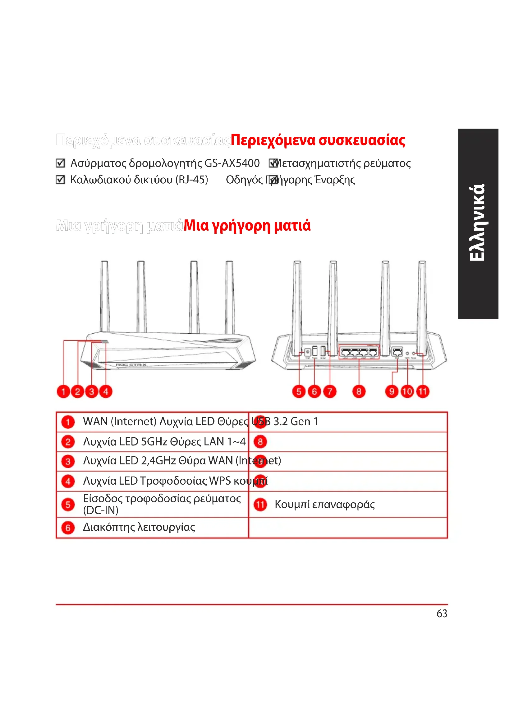 Μια γρήγορη ματιάΜια γρήγορη ματιά Περιεχόμενα συσκευασίαςΠεριεχόμενα συσκευασίας Ασύρματος δρομολογητής GS-AX5400 Μετασχηματιστής ρεύματος Καλωδιακού δικτύου (RJ-45) Οδηγός Γρήγορης Έναρξης WAN (Internet) Λυχνία LED Θύρες USB 3.2 Gen 1 Λυχνία LED 5GHz Θύρες LAN 1~4 Λυχνία LED 2,4GHz Θύρα WAN (Internet) Λυχνία LED Τροφοδοσίας WPS κουμπί Είσοδος τροφοδοσίας ρεύματος (DC-IN) Κουμπί επαναφοράς Διακόπτης λειτουργίας64