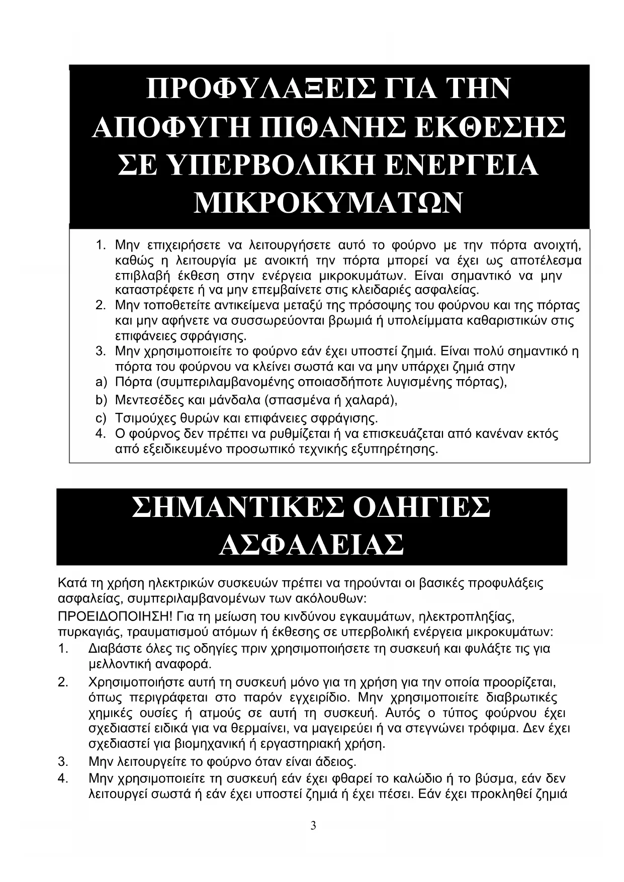 Κατά τη χρήση ηλεκτρικών συσκευών πρέπει να τηρούνται οι βασικές προφυλάξεις ασφαλείας, συμπεριλαμβανομένων των ακόλουθων: ΠΡΟΕΙΔΟΠΟΙΗΣΗ! Για τη μείωση του κινδύνου εγκαυμάτων, ηλεκτροπληξίας, πυρκαγιάς, τραυματισμού ατόμων ή έκθεσης σε υπερβολική ενέργεια μικροκυμάτων: