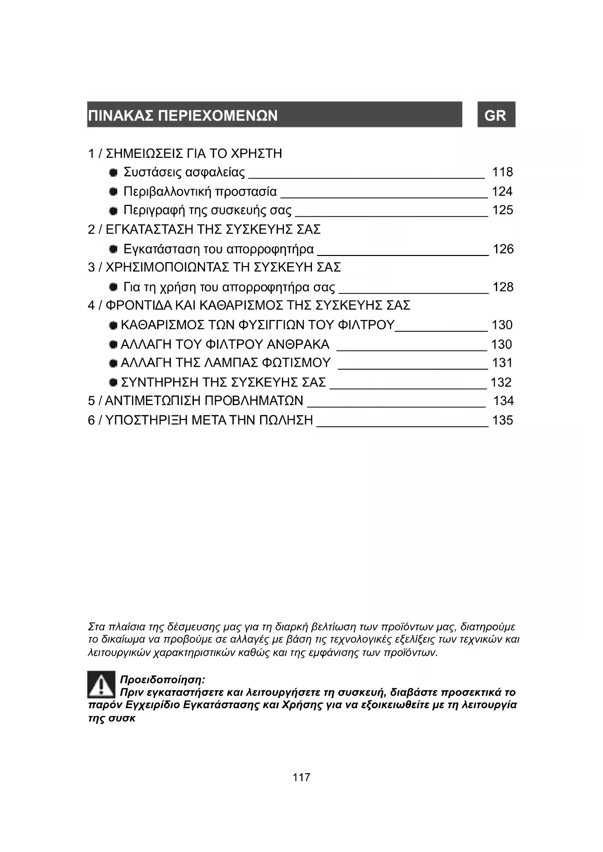 1 / ΣΗΜΕΙΩΣΕΙΣ ΓΙΑ ΤΟ ΧΡΗΣΤΗ Συστάσεις ασφαλείας _________________________________ 118 Περιβαλλοντική προστασία _____________________________ 124 Περιγραφή της συσκευής σας ___________________________ 125 2 / ΕΓΚΑΤΑΣΤΑΣΗ ΤΗΣ ΣΥΣΚΕΥΗΣ ΣΑΣ Εγκατάσταση του απορροφητήρα ________________________ 126 3 / ΧΡΗΣΙΜΟΠΟΙΩΝΤΑΣ ΤΗ ΣΥΣΚΕΥΗ ΣΑΣ Για τη χρήση του απορροφητήρα σας _____________________ 128 4 / ΦΡΟΝΤΙΔΑ ΚΑΙ ΚΑΘΑΡΙΣΜΟΣ ΤΗΣ ΣΥΣΚΕΥΗΣ ΣΑΣ ΚΑΘΑΡΙΣΜΟΣ ΤΩΝ ΦΥΣΙΓΓΙΩΝ ΤΟΥ ΦΙΛΤΡΟΥ_____________ 130 ΑΛΛΑΓΗ ΤΟΥ ΦΙΛΤΡΟΥ ΑΝΘΡΑΚΑ _____________________ 130 ΑΛΛΑΓΗ ΤΗΣ ΛΑΜΠΑΣ ΦΩΤΙΣΜΟΥ _____________________ 131 ΣΥΝΤΗΡΗΣΗ ΤΗΣ ΣΥΣΚΕΥΗΣ ΣΑΣ ______________________ 132 5 / ΑΝΤΙΜΕΤΩΠΙΣΗ ΠΡΟΒΛΗΜΑΤΩΝ _________________________ 134 6 / ΥΠΟΣΤΗΡΙΞΗ ΜΕΤΑ ΤΗΝ ΠΩΛΗΣΗ ________________________ 135