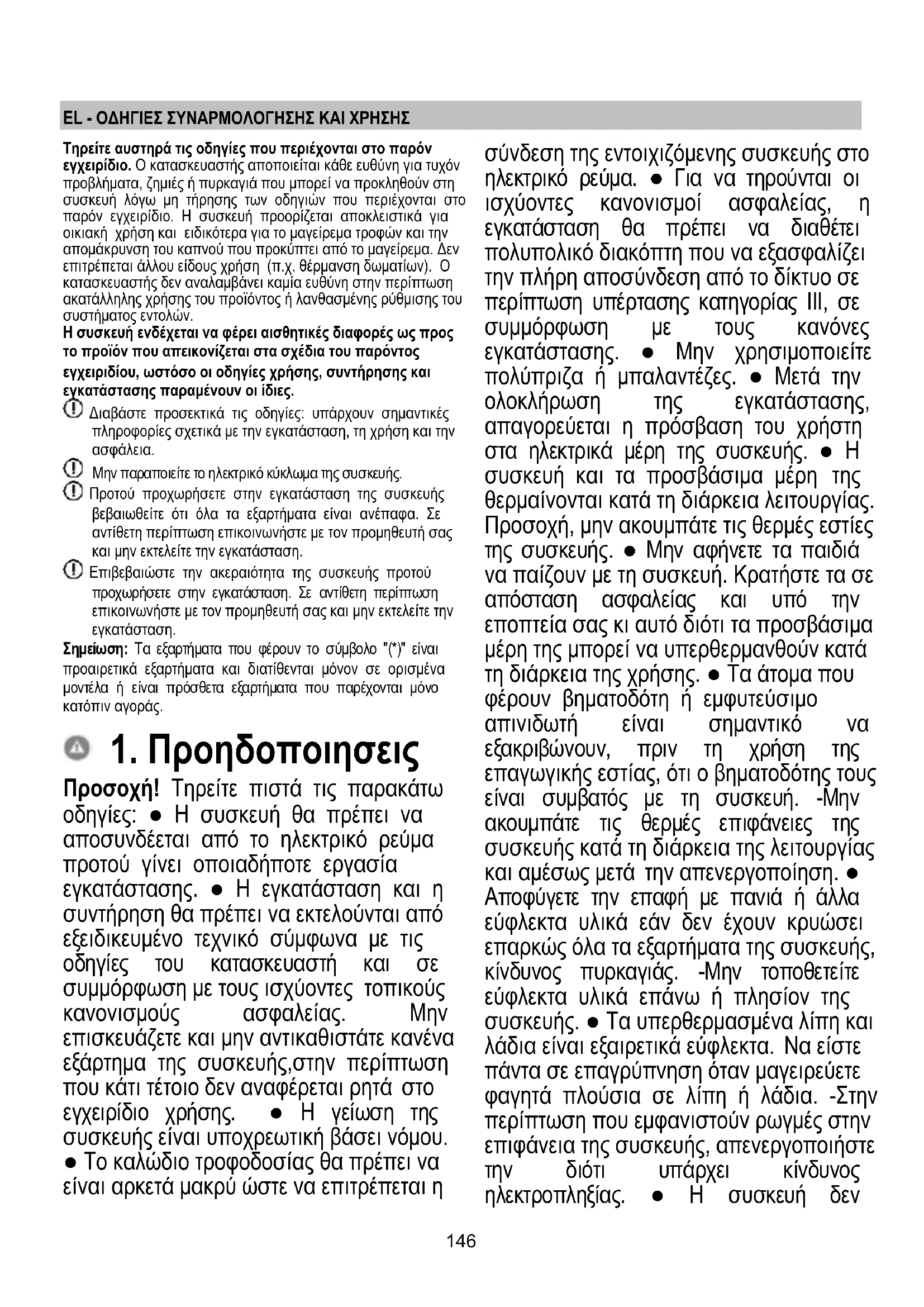 Se, após as verificações acima, o problema persistir, entrar em contacto com o Serviço de Assistência mais próximo.146 EL - ΟΔΗΓΙΕΣ ΣΥΝΑΡΜΟΛΟΓΗΣΗΣ ΚΑΙ ΧΡΗΣΗΣ Τηρείτε αυστηρά τις οδηγίες που περιέχονται στο παρόν εγχειρίδιο. Ο κατασκευαστής αποποιείται κάθε ευθύνη για τυχόν προβλήματα, ζημιές ή πυρκαγιά που μπορεί να προκληθούν στη συσκευή λόγω μη τήρησης των οδηγιών που περιέχονται στο παρόν εγχειρίδιο. Η συσκευή προορίζεται αποκλειστικά για οικιακή χρήση και ειδικότερα για το μαγείρεμα τροφών και την απομάκρυνση του καπνού που προκύπτει από το μαγείρεμα. Δεν επιτρέπεται άλλου είδους χρήση (π.χ. θέρμανση δωματίων). Ο κατασκευαστής δεν αναλαμβάνει καμία ευθύνη στην περίπτωση ακατάλληλης χρήσης του προϊόντος ή λανθασμένης ρύθμισης του συστήματος εντολών. Η συσκευή ενδέχεται να φέρει αισθητικές διαφορές ως προς το προϊόν που απεικονίζεται στα σχέδια του παρόντος εγχειριδίου, ωστόσο οι οδηγίες χρήσης, συντήρησης και εγκατάστασης παραμένουν οι ίδιες. Διαβάστε προσεκτικά τις οδηγίες: υπάρχουν σημαντικές πληροφορίες σχετικά με την εγκατάσταση, τη χρήση και την
