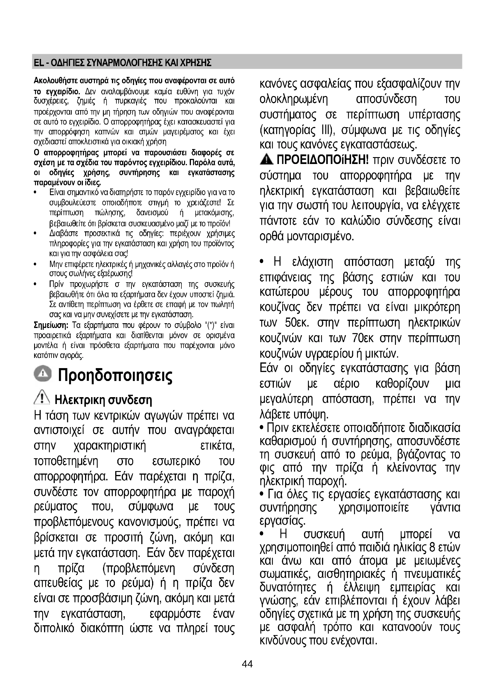 Προϊόν με μεγάλο βάρος. Η μετακίνηση και η εγκατάσταση του απορροφητήρα πρέπει να γίνει τουλάχιστον από δύο ή περισσότερους ανθρώπους.47