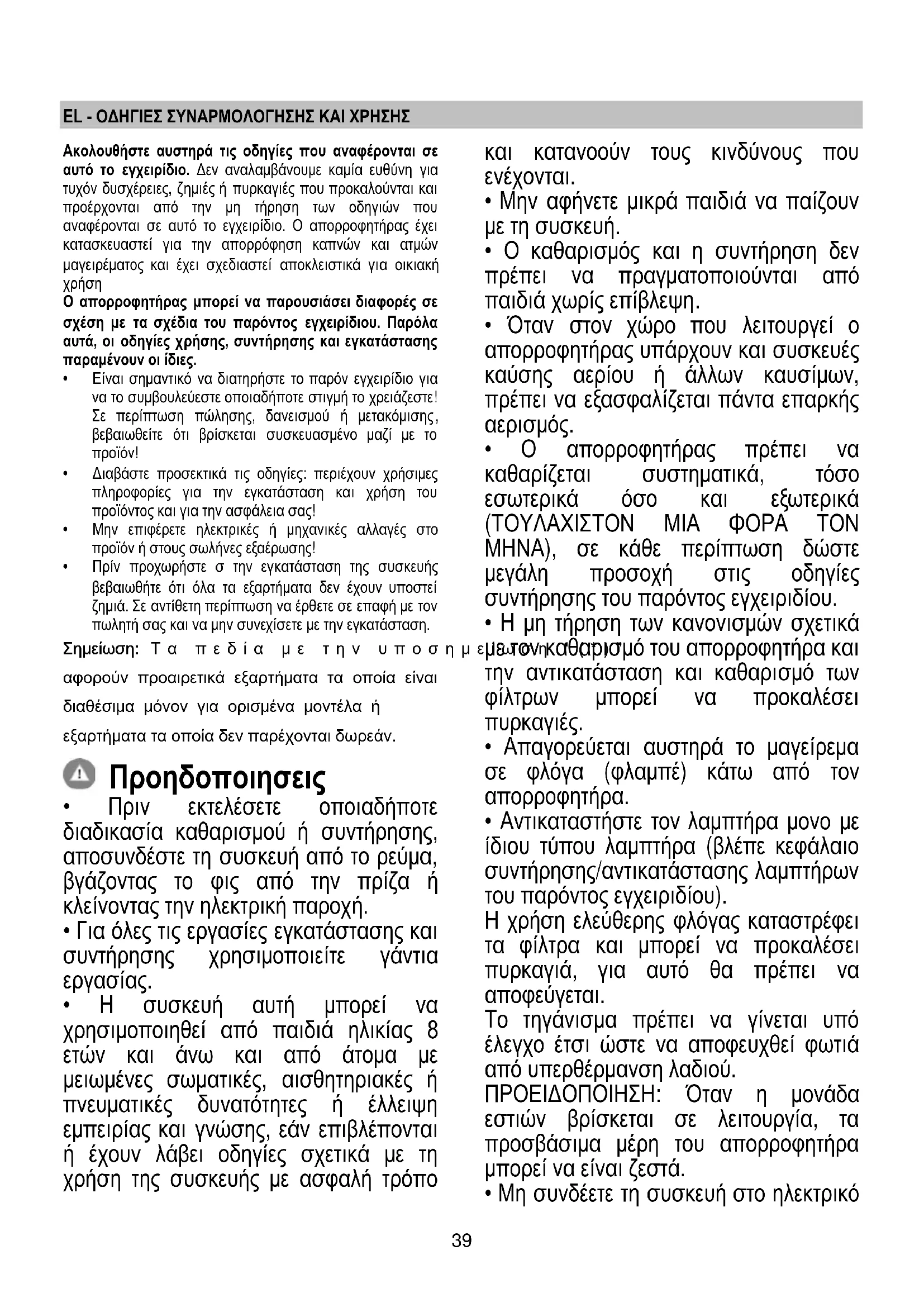 - Ο καθαρισμός και η συντήρηση δεν πρέπει να πραγματοποιούνται από παιδιά χωρίς επίβλεψη.