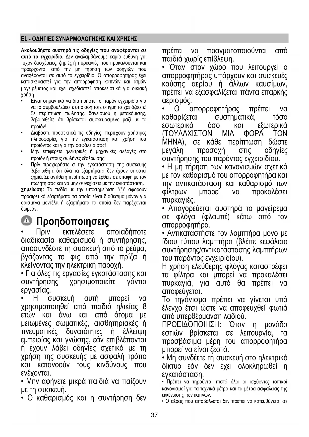- Μη χρησιμοποιείτε ή μην αφήνετε τον απορροφητήρα χωρίς λάμπες σωστά τοποθετημένες, εξαιτίας ενδεχόμενου κινδύνου ηλεκτροπληξίας.