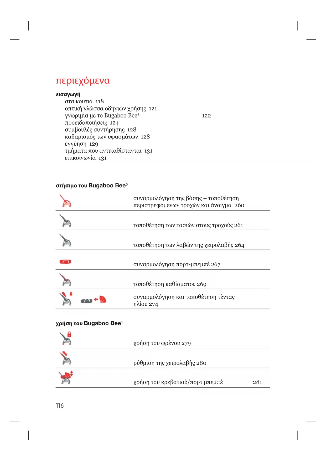 συναρμολόγηση της βάσης – τοποθέτηση περιστρεφόμενων τροχών και άνοιγμα 260 τοποθέτηση των τασιών στους τροχούς 261 τοποθέτηση των λαβών της χειρολαβής 264 συναρμολόγηση πορτ-μπεμπέ 267 τοποθέτηση καθίσματος 269 συναρμολόγηση και τοποθέτηση τέντας ηλίου 274 χρήση του Bugaboo Bee