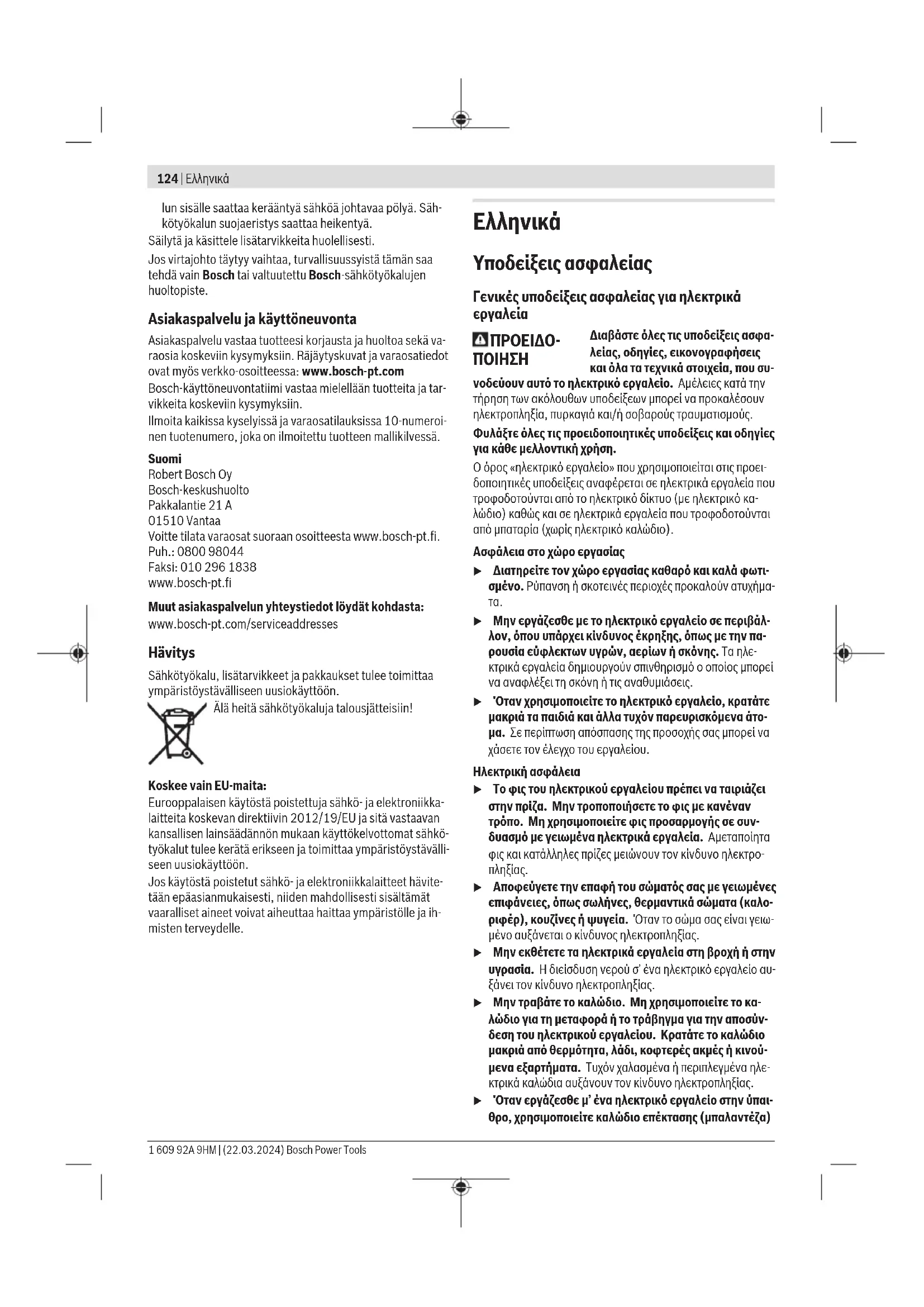 u Σε περίπτωση εμπλοκής του δίσκου ή όταν διακοπεί μια κοπή για οποιονδήποτε λόγο, απενεργοποιήστε το ηλε- κτρικό εργαλείο και κρατήστε το ακίνητο, μέχρι να στα- ματήσει εντελώς ο δίσκος. Μην επιχειρήσετε ποτέ να Bosch Power Tools 1 609 92A 9HM | (22.03.2024)128 | Ελληνικά αφαιρέσετε τον δίσκο κοπής από την κοπή, όταν ο δί- σκος κινείται, διαφορετικά μπορεί να προκύψει ανάκρουση. Ερευνήστε και λάβετε διορθωτικά μέτρα για να εξαλείψετε την αιτία της εμπλοκής του δίσκου. u Μην επανεκκινήσετε τη διαδικασία κοπής μέσα στο επεξεργαζόμενο κομμάτι. Αφήστε το δίσκο να φθάσει στην πλήρη ταχύτητα και εισάγετε ξανά το δίσκο προσε- κτικά μέσα στην κοπή. Ο δίσκος μπορεί να παρουσιάσει εμπλοκή, αναπήδηση ή ανάκρουση, όταν το ηλεκτρικό ερ- γαλείο επανεκκινηθεί μέσα στο επεξεργαζόμενο κομμάτι. u Στηρίζετε τις πλάκες ή τα υπερμεγέθη επεξεργαζόμενα κομμάτια, για να ελαχιστοποιηθεί ο κίνδυνος εμπλοκής του δίσκου και ανάκρουσης. Τα μεγάλα επεξεργαζόμενα κομμάτια τείνουν να παρουσιάζουν κάμψη προς τα κάτω λόγω του βάρους τους. Πρέπει να τοποθετούνται στηρίγμα- τα κάτω από το επεξεργαζόμενο κομμάτι κοντά στη γραμμή κοπής και κοντά στην άκρη του επεξεργαζόμενου κομμα- τιού και από τις δύο πλευρές του δίσκου. u Προσέχετε ιδιαίτερα, όταν κάνετε μια κοπή «θύλακα» σε υπάρχοντες τοίχους ή σε τυφλές περιοχές. Ο δίσκος που προεξέχει μπορεί να κόψει σωλήνες παροχής αερίου ή νερού, ηλεκτρικά καλώδια ή αντικείμενα, τα οποία μπορεί να προκαλέσουν ανάκρουση. u Μην προσπαθήσετε να κάνετε καμπύλη κοπή. Η υπερ- βολική πίεση στον δίσκο αυξάνει το φορτίο και την ευαι- σθησία σε συστροφή ή εμπλοκή του δίσκου μέσα στην κοπή και την πιθανότητα ανάκρουσης ή θραύσης του δίσκου, πράγμα που μπορεί να οδηγήσει σε σοβαρό τραυματισμό. Προειδοποιήσεις ασφάλειας ειδικά για εργασίες τριψίματος: u Χρησιμοποιείτε δίσκους γυαλόχαρτου κατάλληλου με- γέθους. Ακολουθείτε τις συστάσεις του κατασκευαστή, όταν επιλέγετε γυαλόχαρτο. Ένα μεγάλο γυαλόχαρτο που προεξέχει πολύ πιο πέρα από τον δίσκο στήριξης κινδυνεύει να σχιστεί και μπορεί να προκαλέσει σκάλωμα, σχίσιμο του δίσκου ή ανάκρουση. Προειδοποιήσεις ασφάλειας ειδικά για εργασίες με χρήση συρματόβουρτσας: u Έχετε υπόψη σας, ότι οι συρμάτινες τρίχες εκτινάσσο- νται από τη βούρτσα ακόμη και κατά τη διάρκεια κανο- νικής λειτουργίας. Μην πιέζετε υπερβολικά τα σύρμα- τα, εφαρμόζοντας υπερβολικό φορτίο στη βούρτσα Οι συρμάτινες τρίχες μπορούν εύκολα να διαπεράσουν ελα- φρά ρούχα και/ή το δέρμα. u Εάν καθορίζεται η χρήση ενός προφυλακτήρα για τη χρήση συρματόβουρτσας, δεν επιτρέπεται καμία παρε- μπόδιση του συρμάτινου τροχού ή της βούρτσας από τον προφυλακτήρα. Η διάμετρος ενός συρμάτινου τροχού ή βούρτσας μπορεί να αυξηθεί από το φορτίο εργασίας και τις φυγόκεντρες δυνάμεις. Πρόσθετες υποδείξεις ασφάλειας Φοράτε προστατευτικά γυαλιά. Ο προφυλακτήρας δεν επιτρέπεται να χρησι- μοποιηθεί για κοπή. Με ένα κατάλληλο προ- σάρτημα, ο προφυλακτήρας μπορεί να χρησιμο- ποιηθεί επίσης για κοπή. Κρατάτε το ηλεκτρικό εργαλείο κατά την ερ- γασία σταθερά με τα δύο σας χέρια και φρο- ντίζετε για μια ασφαλή στάση. Το ηλεκτρικό εργαλείο οδηγείται ασφαλέστερα, όταν το κρα- τάτε και με τα δυο σας χέρια. u Στα εξαρτήματα με εσωτερικό σπείρωμα όπως βούρ- τσες και διαμαντοκορώνες πρέπει να προσέξετε το μέγ. μήκος σπειρώματος του άξονα λείανσης. Η άκρη του άξονα δεν επιτρέπεται να ακουμπ