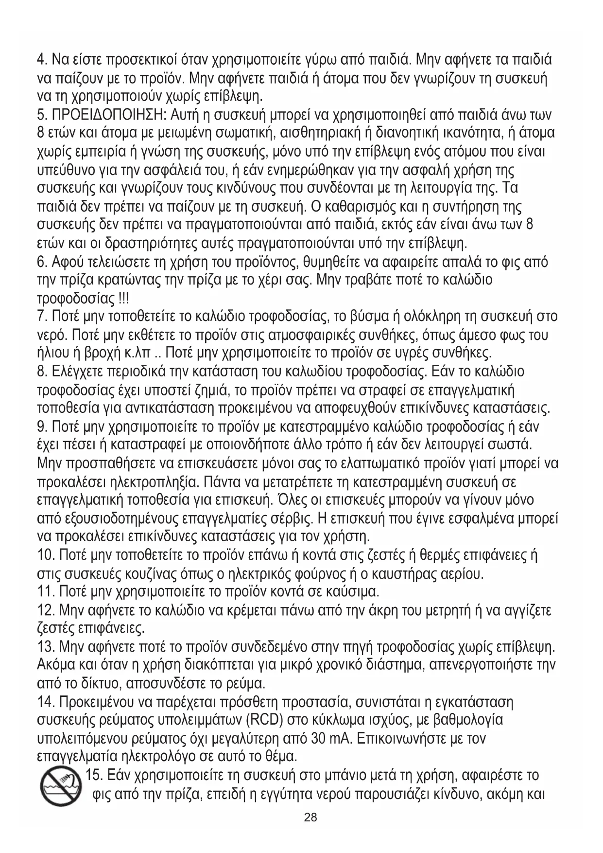 8 ετών και άτομα με μειωμένη σωματική, αισθητηριακή ή διανοητική ικανότητα, ή άτομα χωρίς εμπειρία ή γνώση της συσκευής, μόνο υπό την επίβλεψη ενός ατόμου που είναι υπεύθυνο για την ασφάλειά του, ή εάν ενημερώθηκαν για την ασφαλή χρήση της συσκευής και γνωρίζουν τους κινδύνους που συνδέονται με τη λειτουργία της. Τα παιδιά δεν πρέπει να παίζουν με τη συσκευή. Ο καθαρισμός και η συντήρηση της συσκευής δεν πρέπει να πραγματοποιούνται από παιδιά, εκτός εάν είναι άνω των 8 ετών και οι δραστηριότητες αυτές πραγματοποιούνται υπό την επίβλεψη.