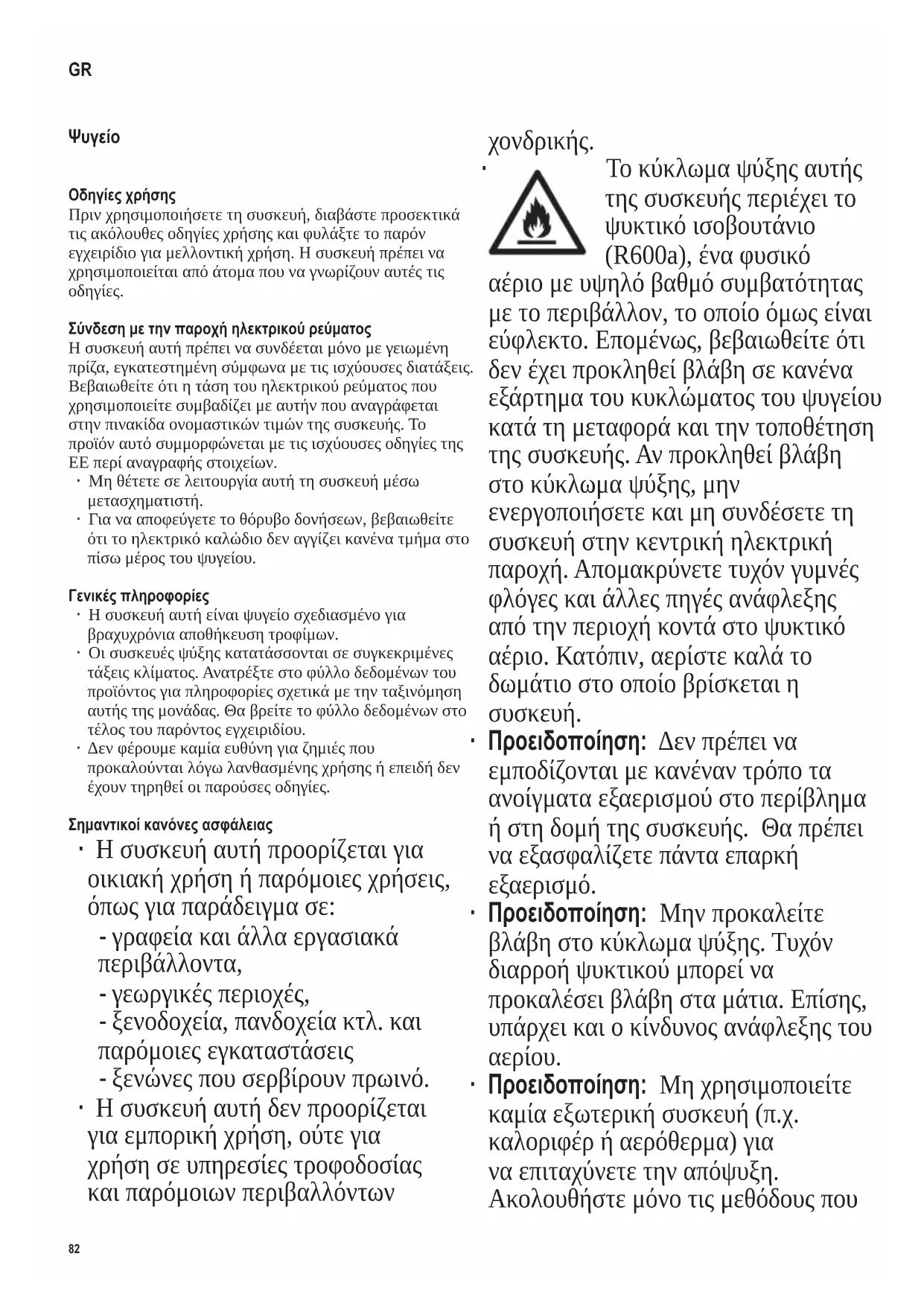 καθώς και στο ψυκτικό R600a. Για επιπρόσθετες πληροφορίες σχετικά με τη σωστή ανακύκλωση, ανατρέξτε στην παράγραφο «Απόρριψη». ∙ Για να τηρείτε τους κανόνες ασφαλείας και να αποφεύγετε πιθανούς κίνδυνους, να φροντίζετε οποιεσδήποτε επισκευές ή τροποποιήσεις αυτής της συσκευής, αλλά και η αντικατάσταση του ηλεκτρικού καλωδίου, να γίνονται από ειδικευμένους τεχνικούς. ∙ Η συσκευή αυτή μπορεί να χρησιμοποιηθεί από παιδιά (τουλάχιστον 8 ετών) και από άτομα με μειωμένες φυσικές, αισθητήριες ή διανοητικές ικανότητες ή χωρίς πείρα και γνώσεις, με την προϋπόθεση ότι επιτηρούνται ή τους έχουν δοθεί οδηγίες σχετικά με τη χρήση της συσκευής και κατανοούν πλήρως όλους τους εμπλεκόμενους κίνδυνους και προφυλάξεις για την ασφάλεια. ∙ Παιδιά από 3 έως 8 ετών επιτρέπεται να φορτώσουν και να ξεφορτώσουν το ψυγείο/καταψύκτη. ∙ Τα παιδιά δεν πρέπει να επιτρέπεται να παίζουν με τη συσκευή. ∙ Δεν πρέπει να επιτρέπεται στα παιδιά να εκτελούν οποιαδήποτε εργασία καθαρισμού ή συντήρησης στη συσκευή εκτός αν επιτηρούνται. ∙ Για συχνό καθαρισμό, συνιστούμε να χρησιμοποιείτε ζεστό νερό με λίγο ήπιο απορρυπαντικό. Πρέπει να πλένετε τυχόν εξαρτήματα ξεχωριστά, με σαπουνόνερο. Μην τα βάζετε σε πλυντήριο πιάτων. Για να αποφύγετε την μόλυνση του φαγητού ακολουθήστε τις παρακάτω84 142 x 208 mm