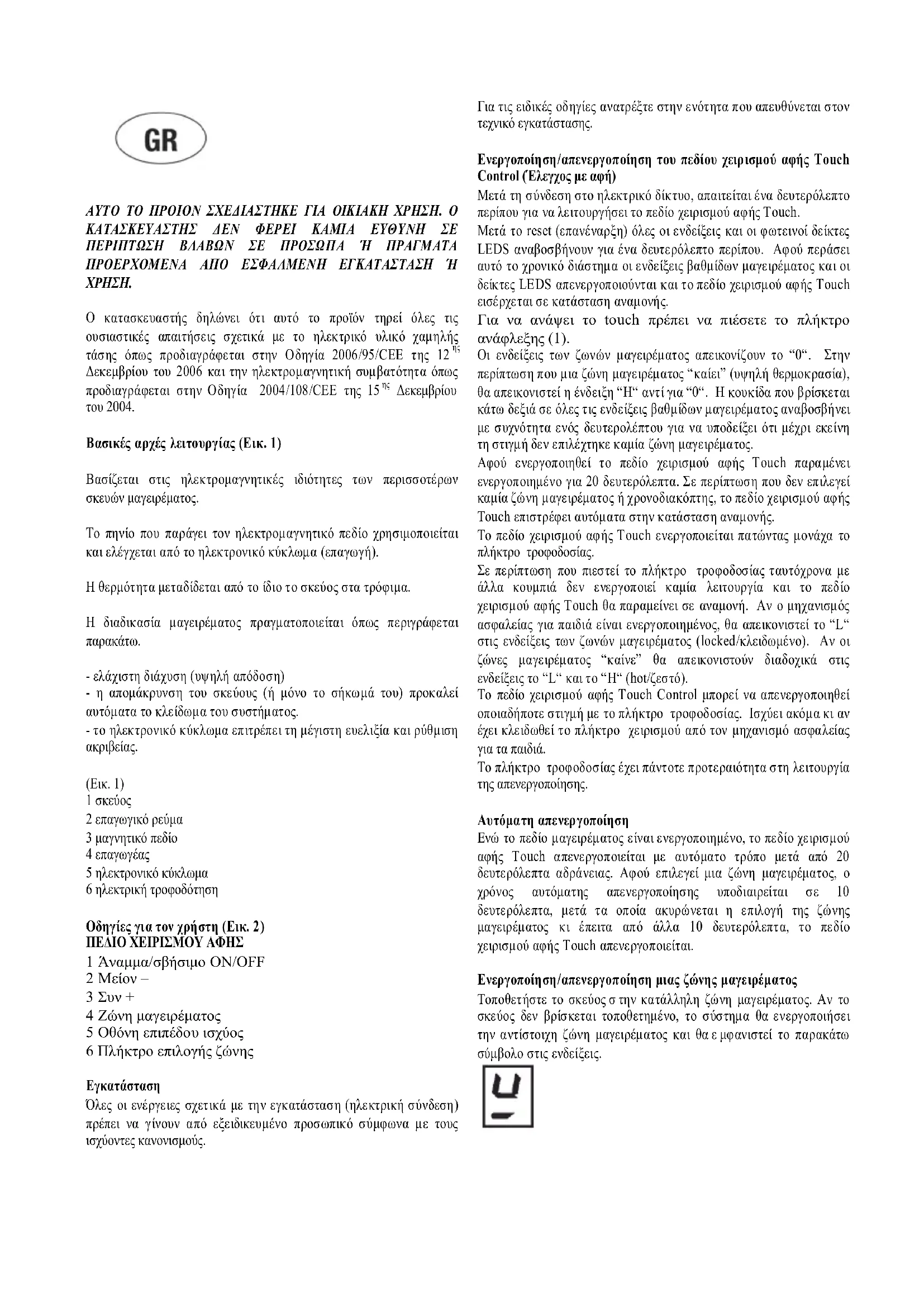 (Εικ. 1) 1 σκεύος 2 επαγωγικό ρε ύµα 3 µαγνητικό πεδίο 4 επαγωγέας 5 ηλεκτρονικό κύκλωµα 6 ηλεκτρική τροφοδότηση Οδηγίες για τον χρήστη (Εικ. 2) ΠΕΔΙΟ ΧΕΙΡΙΣΜΟΥ ΑΦΗΣ 1 Άναµµα/σβήσιµο ON/OFF 2 Μείον – 3 Συν + 4 Ζώνη µαγειρέµατος 5 Οθόνη επιπέδου ισχύος 6 Πλήκτρο επιλογής ζώνης Εγκατάσταση Όλες οι ενέργ ειες σχετικά µε την εγκατάσταση (ηλεκτρική σύνδεση) πρέπει να γίνουν από εξειδικευµένο προσωπικό σύµφωνα µε τους ισχύοντες κανονισµούς. Για τις ειδικές οδηγίες ανατρέξτε στην ενότητα που απευθύνεται στον τεχνικό εγκατάστασης. Ενεργοποίηση/απενεργοποίηση του πεδίου χειρισµού αφής Touch Control (Έλεγχος µε αφή) Μετά τη σύνδεση στο ηλεκτρικό δίκτυο, απαιτείται ένα δευτερόλεπτο περίπου για να λειτουργήσει το πεδίο χειρισµού αφής Τouch. Μετά το reset (επανέναρξη) όλες οι ενδεί ξεις και οι φωτεινοί δείκτες LEDS αναβοσβήνουν για ένα δευτερόλεπτο περίπου. Αφού περάσει αυτό το χρονικό διάστηµα οι ενδείξεις βαθµίδων µαγειρέµατος και οι δείκτες LEDS απενεργοποιούν ται κα ι το πεδίο χειρισµού αφή ς Τouch εισέρχεται σε κατάσταση αναµονής. Για να ανάψει το touch πρέπει να πιέσετε το πλήκτρο ανάφλεξης (1). Οι ενδείξεις των ζωνών µαγειρέµα τος απεικονίζουν το “0“. Στην περίπτωση που µια ζώνη µα γειρ έµατ ος “καίει” (υψηλή θερµοκρασία), θα απεικονιστεί η ένδειξη “H“ αντί για “0“. Η κο υκίδα που βρ ίσκεται κάτω δεξιά σε όλες τις ενδείξεις βαθµίδων µαγειρέµατος αναβοσβήνει µε συχνότητα ενός δευτερολέπτου για να υπο δείξει ότι µέχρι εκείνη τη στιγ µή δεν επιλέχτηκε καµία ζώνη µαγειρέµατο ς. Αφού ενεργοποιηθεί το πεδίο χειρισµού αφής Τouch παραµένει ενεργοποιηµένο για 20 δευτερόλεπτα. Σε περίπτωση που δεν επιλεγεί καµία ζώνη µαγειρέµατος ή χρονοδιακόπτης, το πεδίο χειρ ισµού αφής Τouch επιστρέφει αυτόµατα στην κατάσταση αναµονής. Το πεδίο χειρισµού αφής Τouch ενεργοποιείται πατώντας µονάχα το πλήκτρο τροφοδοσίας. Σε περίπτωση πο υ π ιεστεί το πλήκτρο τροφοδοσίας ταυτόχρο να µε άλλα κουµπιά δεν ενεργοποιεί καµία λειτουργία και το πεδίο χειρισµού αφής Τouch θα π αραµείνει σε αναµονή. Αν ο µηχανισµός ασφαλείας για παιδιά είναι ενερ γοποιηµένος, θα απεικ ονιστεί το “L“ στις ενδείξεις των ζωνών µαγειρέµατος (locked/κλειδωµένο). Αν οι ζώνες µαγειρέµατος “καίνε” θα απεικονιστούν διαδοχικά στις ενδείξεις το “L“ και το “H“ (hot/ζεστό). Το πεδίο χ ειρισµού αφής Τouch Control µπορεί να απενεργοποιη θεί οποιαδήποτε στιγµή µε το πλήκτρο τροφοδοσίας. Ισχύει ακόµα κι αν έχει κλειδωθεί το πλήκτρο χειρισµού από τον µηχανισµό ασφαλείας για τα παιδιά. Το πλήκτρο τροφοδοσίας έχει πάντοτε προτεραιότητα στ η λειτουργία της απενεργοποίησης. Αυτ όµατη απενεργοποίηση Εν ώ το πεδίο µαγειρέµατος είναι ενεργοποιηµένο, το πεδίο χ ειρισµού αφής Τouch απενεργοποιείται µε αυτόµατο τρόπο µετά από 20 δευτερόλεπτα αδράνειας. Αφού επι λεγεί µια ζώνη µαγειρέµατος, ο χρόνος αυτόµατης απενεργοποίησης υποδιαιρείται σε 10 δευτερόλεπτα, µετά τα οποία ακυρώνεται η επιλογή της ζώνης µαγειρέµατος κι έπειτα από άλλα 10 δευτερόλεπτα, το πεδίο χειρισµού αφής Τouch απενεργοποιείται. Ενεργοποίηση/απενεργοποίηση µιας ζώνης µαγειρέµατος Τοποθετήστε το σκεύος σ την κατάλληλη ζώνη µαγειρέµατος. Αν το σκεύος δεν βρίσκεται τοποθετηµένο, το σύστηµα θα ενεργοποιήσει την αντί στοιχη ζώνη µαγειρέµατο ς και θα ε µφανιστεί το παρακά τω σύµβολο στις ενδείξεις.Με το πεδίο χειρισµού αφής ενεργοποιηµένο, η επιλογή της ζώνης µαγειρέµατος είναι δυνατή πιέζ