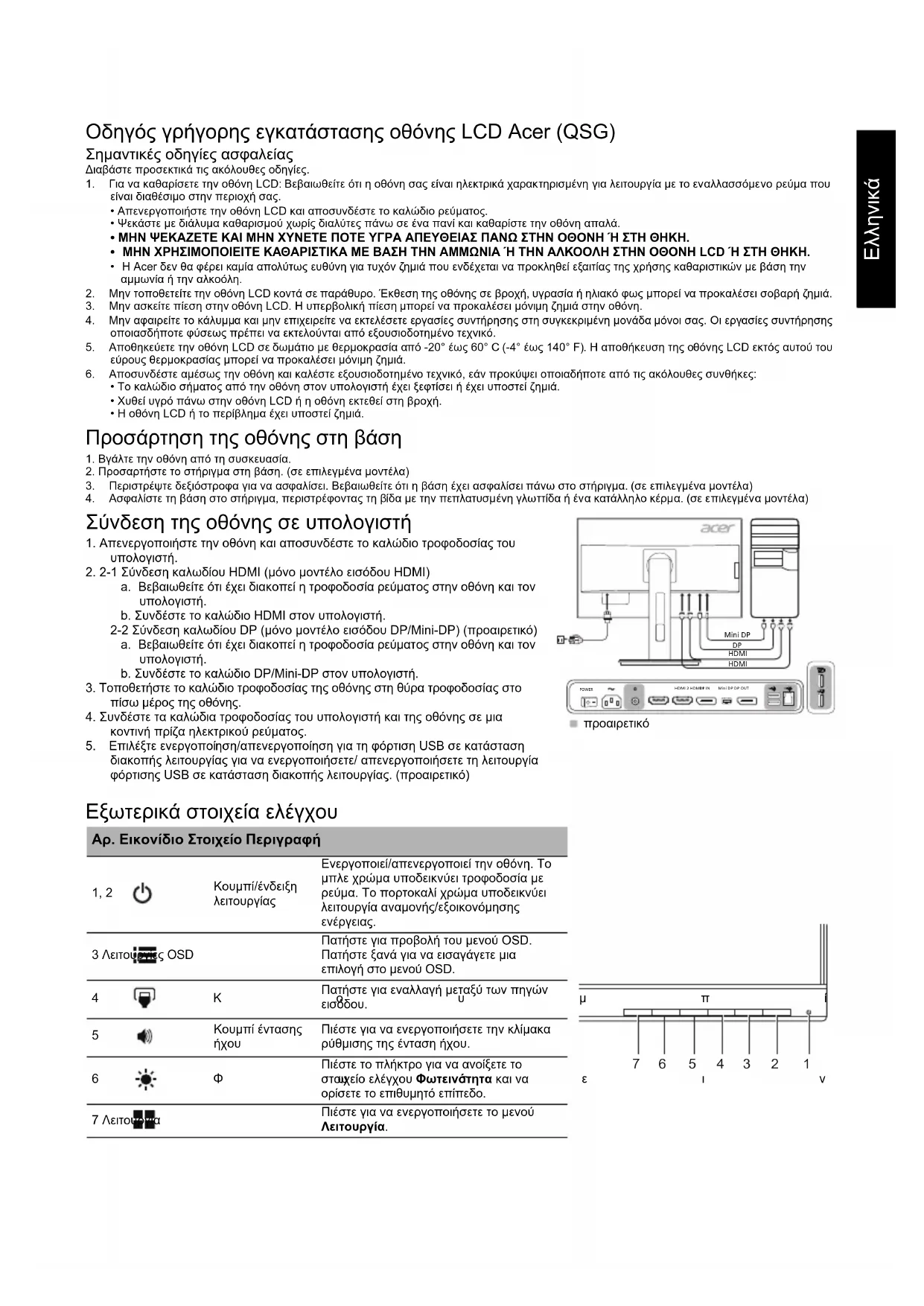 Mini DPPOWERHDMI 2 HDMI 1 DP INMini DP DP OUT προαιρετικό 1234567Ελληνικά Κανονισμοί και ειδοποιήσεις ασφαλείας Ειδοποίηση της FCC Αυτή η συσκευή έχει ελεγχθεί και διαπιστώθηκε ότι συμμορφώνεται με τα όρια για μια ψηφιακή συσκευή κατηγορίας B, σύμφωνα με το Μέρος 15 των κανονισμών FCC. Αυτά τα όρια έχουν σχεδιαστεί ώστε να παρέχουν εύλογη προστασία έναντι επιβλαβών παρεμβολών σε μια οικιακή εγκατάσταση. Η παρούσα συσκευή παράγει, χρησιμοποιεί και μπορεί να εκπέμψει ενέργεια ραδιοσυχνοτήτων και, εάν δεν εγκατασταθεί και χρησιμοποιηθεί σύμφωνα με τις οδηγίες, μπορεί να επιφέρει επιβλαβείς παρεμβολές στις ραδιοεπικοινωνίες. Ωστόσο, δεν παρέχεται εγγύηση ότι δεν θα σημειωθούν παρεμβολές σε μια συγκεκριμένη εγκατάσταση. Εάν η παρούσα συσκευή προκαλεί επιβλαβείς παρεμβολές στη λήψη ραδιοφωνικού ή τηλεοπτικού σήματος, γεγονός που μπορεί να διαπιστωθεί με απενεργοποίηση και επανενεργοποίηση της συσκευής, ο χρήστης ενθαρρύνεται να δοκιμάσει να διορθώσει την παρεμβολή με ένα ή περισσότερα από τα ακόλουθα μέτρα: Αναπροσανατολίστε ή μετακινήστε την κεραία λήψης. Αυξήστε την απόσταση μεταξύ της συσκευής και του δέκτη. Συνδέστε τη συσκευή σε μια πρίζα που βρίσκεται σε διαφορετικό κύκλωμα από αυτό στο οποίο είναι συνδεδεμένος ο δέκτης. Συμβουλευτείτε τον αντιπρόσωπο ή έναν έμπειρο τεχνικό ραδιοφώνων/τηλεοράσεων για βοήθεια. Δήλωση Συμμόρφωσης CE Δια του παρόντος, η Acer Inc., δηλώνει ότι αυτή η οθόνη LCD συμμορφώνεται με τις βασικές απαιτήσεις και άλλες σχετικές διατάξεις της οδηγίας EMC 2014/30/ΕΕ, την Οδηγία Χαμηλής Τάσης 2014/35/ΕΕ, καθώς και την Οδηγία RoHS 2011/65/ΕΕ και την Οδηγία 2009/125/ΕΚ όσον αφορά τη θέσπιση ενός πλαισίου για τον καθορισμό απαιτήσεων οικολογικού σχεδιασμού για προϊόντα που σχετίζονται με την ενέργεια. Ειδοποίηση: Για να αποφευχθεί ενδεχόμενη ζημιά στην οθόνη, μην την σηκώνετε από τη βάση της. Ειδοποίηση: Θωρακισμένα καλώδια Όλες οι συνδέσεις με άλλες υπολογιστικές συσκευές πρέπει να γίνονται με θωρακισμένα καλώδια για να διατηρηθεί η συμμόρφωση με τους κανονισμούς EMC. Ειδοποίηση: Περιφερειακές συσκευές Μόνο περιφερειακές συσκευές (συσκευές εισόδου/εξόδου, τερματικά, εκτυπωτές κ.λπ.) που είναι πιστοποιημένες ως προς τη συμμόρφωση με τα όρια της κατηγορίας B μπορούν να συνδεθούν σε αυτόν τον εξοπλισμό. Λειτουργία με μη πιστοποιημένα περιφερειακά είναι πιθανό να οδηγήσει σε παρεμβολές στη λήψη ραδιοφωνικού και τηλεοπτικού σήματος.