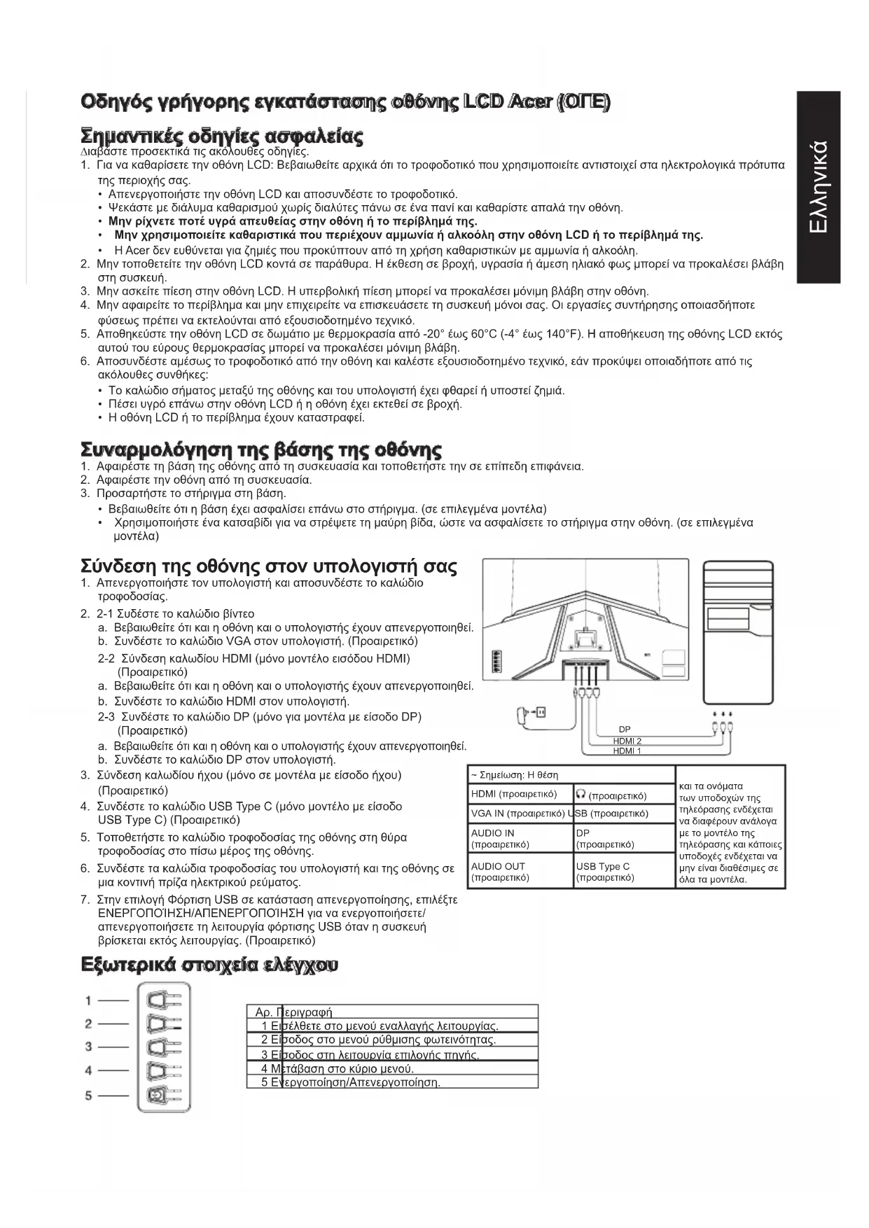 Οποιεσδήποτε αλλαγές ή τροποποιήσεις που δεν έχουν εγκριθεί ρητά από τον κατασκευαστή ενδέχεται να ακυρώσουν την άδεια του χρήστη να χρησιμοποιεί αυτό το προϊόν. Συνθήκες λειτουργίας Η συσκευή συμμορφώνεται με το Μέρος 15 των Κανόνων της FCC. H λειτουργία υπόκειται στις ακόλουθες δύο συνθήκες: (1) αυτή η συσκευή δεν μπορεί να προκαλέσει επιβλαβή παρεμβολή και (2) αυτή η συσκευή πρέπει να δέχεται οποιαδήποτε παρεμβολή που λαμβάνει, συμπεριλαμβανομένων των παρεμβολών που ενδέχεται να προκαλέσουν ανεπιθύμητη λειτουργία. Σημείωση: Για Καναδούς χρήστες Αυτή η ψηφιακή συσκευή κατηγορίας Β συμμορφώνεται με το καναδικό πρότυπο ICES-003. Remarque à I'intention des utilisateurs canadiens Cet appareil numrique de la classe B est conforme à la norme NMB-003 du Canada Επεξηγηματική σημείωση σχετικά με τους "Κανονισμούς για τη διαχείριση των αποβλήτων ηλεκτρικών και ηλεκτρονικών προϊόντων - Ανακύκλωση και διάθεση" Για τη βέλτιστη φροντίδα και προστασία του πλανήτη μας, όταν δεν χρειάζεστε πλέον αυτό το προϊόν ή κατά το τέλος της ζωής του, παρακαλούμε να συμμορφώνεστε με τους εθνικούς νόμους και κανονισμούς για την ανακύκλωση αποβλήτων ηλεκτρικών και ηλεκτρονικών προϊόντων και να το ανακυκλώνετε μέσω τοπικών κατασκευαστών με αναγνωρισμένες σε εθνικό επίπεδο εγκαταστάσεις ανακύκλωσης. Απόρριψη οικιακού εξοπλισμού στην Ευρωπαϊκή Ένωση Αυτό το σύμβολο πάνω στο προϊόν ή πάνω στη συσκευασία υποδεικνύει ότι αυτό το προϊόν δεν πρέπει να απορρίπτεται μαζί με τα υπόλοιπα οικιακά απορρίμματα. Αντί γι' αυτό, είναι δική σας ευθύνη να απορρίπτετε τον άχρηστο εξοπλισμό παραδίδοντάς τον σε ένα καθορισμένο σημείο συλλογής για την ανακύκλωση αποβλήτων ηλεκτρικού και ηλεκτρονικού εξοπλισμού. Η χωριστή συλλογή και ανακύκλωση του άχρηστου εξοπλισμού κατά τη στιγμή της απόρριψης θα βοηθήσει στη διατήρηση των φυσικών πόρων και θα διασφαλίσει ότι ανακυκλώνονται κατά τρόπο που προστατεύεται η ανθρώπινη υγεία και το περιβάλλον. Επικοινωνήστε με τις τοπικές αρχές για πληροφορίες σχετικά με τα κέντρα ανακύκλωσης στην περιοχή σας. Δήλωση συμμόρφωσης CE Δια της παρούσης, η Acer Inc. δηλώνει ότι η συγκεκριμένη οθόνη LCD είναι σύμμορφη με τις βασικές προϋποθέσεις και άλλες σχετικές διατάξεις της Οδηγίας EMC 2014/30/EU, την Οδηγία περί Χαμηλής Τάσης 2014/35/EU και την Οδηγία RoHS 2011/65/ΕU, καθώς επίσης και την Οδηγία 2009/125/ΕΚ σε ό,τι αφορά στη θέσπιση πλαισίου για τη ρύθμιση των προϋποθέσεων οικολογικού σχεδιασμού για προϊόντα που σχετίζονται με την ενέργεια. Η οθόνη Acer προορίζεται για την οπτική προβολή πληροφοριών που λαμβάνονται από ηλεκτρονικές συσκευές.Ελληνικά ΠΡΟΔΙΑΓΡΑΦΕΣ Πλαίσιο LCD Σύστημα οδήγησης Έγχρωμη TFT LCD Μέγεθος 31,5”W (80 cm) Βήμα Pixel 0,364 mm (Ο) x 0,364 mm (Κ) Φωτεινότητα 300 cd/m