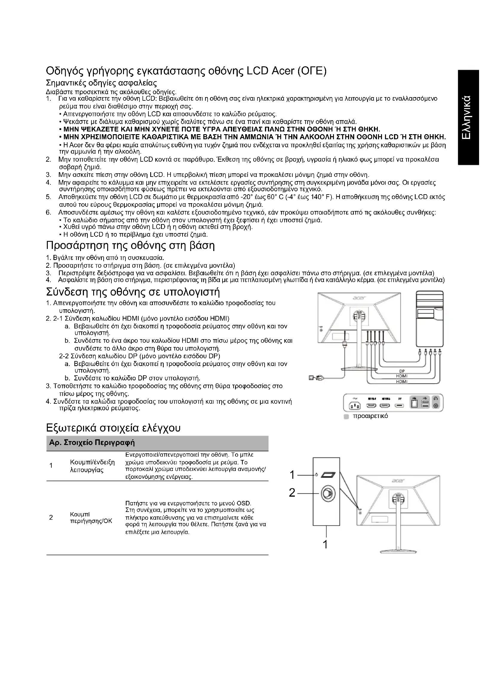 2Ελληνικά Κανονισμοί και ειδοποιήσεις ασφαλείας Ειδοποίηση της FCC Αυτή η συσκευή έχει ελεγχθεί και διαπιστώθηκε ότι συμμορφώνεται με τα όρια για μια ψηφιακή συσκευή κατηγορίας B, σύμφωνα με το Μέρος 15 των κανονισμών FCC. Αυτά τα όρια έχουν σχεδιαστεί ώστε να παρέχουν εύλογη προστασία έναντι επιβλαβών παρεμβολών σε μια οικιακή εγκατάσταση. Η παρούσα συσκευή παράγει, χρησιμοποιεί και μπορεί να εκπέμψει ενέργεια ραδιοσυχνοτήτων και, εάν δεν εγκατασταθεί και χρησιμοποιηθεί σύμφωνα με τις οδηγίες, μπορεί να επιφέρει επιβλαβείς παρεμβολές στις ραδιοεπικοινωνίες. Ωστόσο, δεν παρέχεται εγγύηση ότι δεν θα σημειωθούν παρεμβολές σε μια συγκεκριμένη εγκατάσταση. Εάν η παρούσα συσκευή προκαλεί επιβλαβείς παρεμβολές στη λήψη ραδιοφωνικού ή τηλεοπτικού σήματος, γεγονός που μπορεί να διαπιστωθεί με απενεργοποίηση και επανενεργοποίηση της συσκευής, ο χρήστης ενθαρρύνεται να δοκιμάσει να διορθώσει την παρεμβολή με ένα ή περισσότερα από τα ακόλουθα μέτρα: Αναπροσανατολίστε ή μετακινήστε την κεραία λήψης. Αυξήστε την απόσταση μεταξύ της συσκευής και του δέκτη. Συνδέστε τη συσκευή σε μια πρίζα που βρίσκεται σε διαφορετικό κύκλωμα από αυτό στο οποίο είναι συνδεδεμένος ο δέκτης. Συμβουλευτείτε τον αντιπρόσωπο ή έναν έμπειρο τεχνικό ραδιοφώνων/τηλεοράσεων για βοήθεια. Δήλωση Συμμόρφωσης CE Δια του παρόντος, η Acer Inc., δηλώνει ότι αυτή η οθόνη LCD συμμορφώνεται με τις βασικές απαιτήσεις και άλλες σχετικές διατάξεις της οδηγίας EMC 2014/30/ΕΕ, την Οδηγία Χαμηλής Τάσης 2014/35/ΕΕ, καθώς και την Οδηγία RoHS 2011/65/ΕΕ και την Οδηγία 2009/125/ΕΚ όσον αφορά τη θέσπιση ενός πλαισίου για τον καθορισμό απαιτήσεων οικολογικού σχεδιασμού για προϊόντα που σχετίζονται με την ενέργεια. Ειδοποίηση: Για να αποφευχθεί ενδεχόμενη ζημιά στην οθόνη, μην την σηκώνετε από τη βάση της. Ειδοποίηση: Θωρακισμένα καλώδια Όλες οι συνδέσεις με άλλες υπολογιστικές συσκευές πρέπει να γίνονται με θωρακισμένα καλώδια για να διατηρηθεί η συμμόρφωση με τους κανονισμούς EMC. Ειδοποίηση: Περιφερειακές συσκευές Μόνο περιφερειακές συσκευές (συσκευές εισόδου/εξόδου, τερματικά, εκτυπωτές κ.λπ.) που είναι πιστοποιημένες ως προς τη συμμόρφωση με τα όρια της κατηγορίας B μπορούν να συνδεθούν σε αυτόν τον εξοπλισμό. Λειτουργία με μη πιστοποιημένα περιφερειακά είναι πιθανό να οδηγήσει σε παρεμβολές στη λήψη ραδιοφωνικού και τηλεοπτικού σήματος.