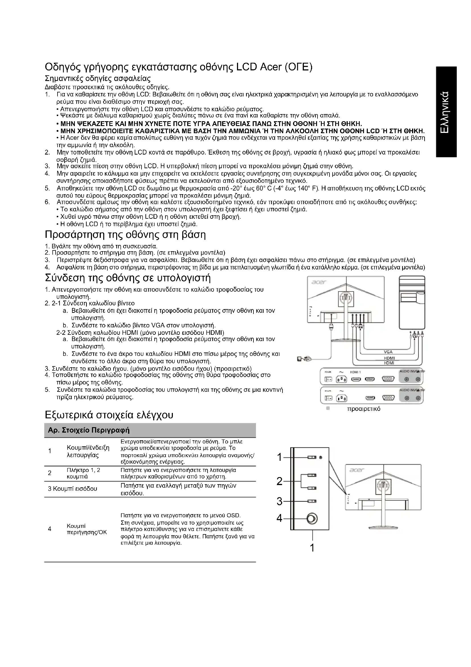 Αλλαγές ή τροποποιήσεις που δεν έχουν εγκριθεί ρητά από τον κατασκευαστή ενδέχεται να ακυρώσουν την άδεια του χρήστη, η οποία χορηγείται από την Ομοσπονδιακή Επιτροπή Επικοινωνιών, για τον χειρισμό αυτού του προϊόντος. Συνθήκες λειτουργίας Αυτή η συσκευή συμμορφώνεται με το Μέρος 15 των κανονισμών FCC. Η λειτουργία της υπόκειται στις ακόλουθες δύο συνθήκες: (1) αυτή η συσκευή δεν μπορεί να προκαλέσει επιβλαβή παρεμβολή και (2) αυτή η συσκευή πρέπει να δέχεται οποιαδήποτε παρεμβολή που λαμβάνει, συμπεριλαμβανομένων των παρεμβολών που ενδέχεται να προκαλέσουν ανεπιθύμητη λειτουργία. Ειδοποίηση: Καναδοί χρήστες Αυτή η ψηφιακή συσκευή κατηγορίας Β συμμορφώνεται με το πρότυπο CAN ICES-003(B)/NMB-003(B). Remarque à l'intention des utilisateurs canadiens Cet appareil numérique de la classe B est conforme à la norme NMB-003 du Canada. Απόρριψη άχρηστου εξοπλισμού από χρήστες σε ιδιωτικά νοικοκυριά στην Ευρωπαϊκή Ένωση Αυτό το σύμβολο πάνω στο προϊόν ή πάνω στη συσκευασία υποδεικνύει ότι αυτό το προϊόν δεν πρέπει να απορρίπτεται μαζί με τα υπόλοιπα οικιακά απορρίμματα. Αντί γι' αυτό, είναι δική σας ευθύνη να απορρίπτετε τον άχρηστο εξοπλισμό παραδίνοντάς τον σε ένα καθορισμένο σημείο συλλογής για την ανακύκλωση αποβλήτων ηλεκτρικού και ηλεκτρονικού εξοπλισμού. Η χωριστή συλλογή και ανακύκλωση του άχρηστου εξοπλισμού κατά τη στιγμή της απόρριψης θα βοηθήσει στη διατήρηση των φυσικών πόρων και θα διασφαλίσει ότι ανακυκλώνονται κατά τρόπο που προστατεύεται η ανθρώπινη υγεία και το περιβάλλον. Για περισσότερες πληροφορίες σχετικά με το πού μπορείτε να απορρίψετε τον άχρηστο εξοπλισμό σας για ανακύκλωση, επικοινωνήστε με το τοπικό γραφείο της πόλης σας, την υπηρεσία διάθεσης οικιακών απορριμμάτων ή το κατάστημα από όπου αγοράσατε το προϊόν.Ελληνικά ΠΡΟΔΙΑΓΡΑΦΕΣ Βρείτε τα εγχειρίδια και τη λοιπή τεκμηρίωση για το προϊόν Acer στην επίσημη ιστοσελίδα υποστήριξης της Acer. Οθόνη LCD Σύστημα οδήγησης Έγχρωμη οθόνη LCD TFT Μέγεθος 23,8”W (60 cm) Βήμα pixel 0,2745 mm (Ο) x 0,2745 mm (Κ) Φωτεινότητα 250 cd/m