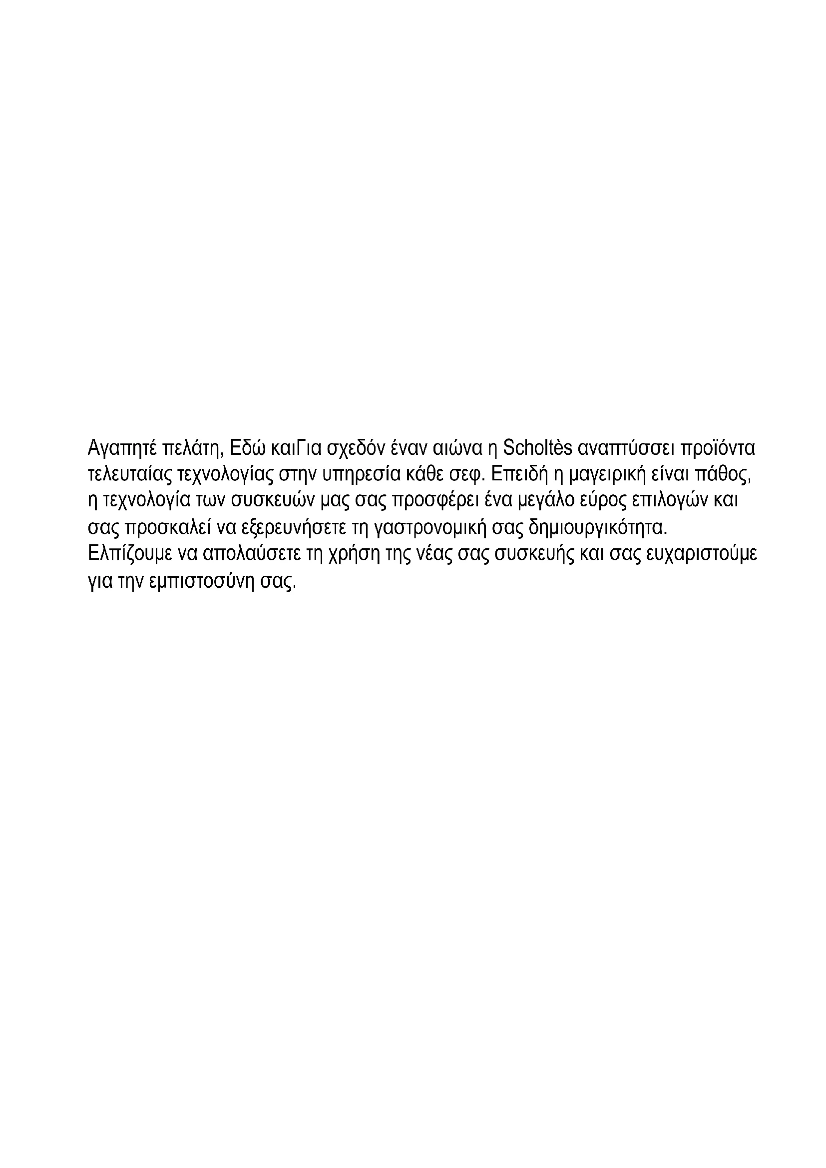 MILIEUΑγαπητέ πελάτη, Εδώ καιΓια σχεδόν έναν αιώνα η Scholtès αναπτύσσει προϊόντα τελευταίας τεχνολογίας στην υπηρεσία κάθε σεφ. Επειδή η μαγειρική είναι πάθος, η τεχνολογία των συσκευών μας σας προσφέρει ένα μεγάλο εύρος επιλογών και σας προσκαλεί να εξερευνήσετε τη γαστρονομική σας δημιουργικότητα. Ελπίζουμε να απολαύσετε τη χρήση της νέας σας συσκευής και σας ευχαριστούμε για την εμπιστοσύνη σας.ΠΕΡΙΕΧΟΜΕΝΑ