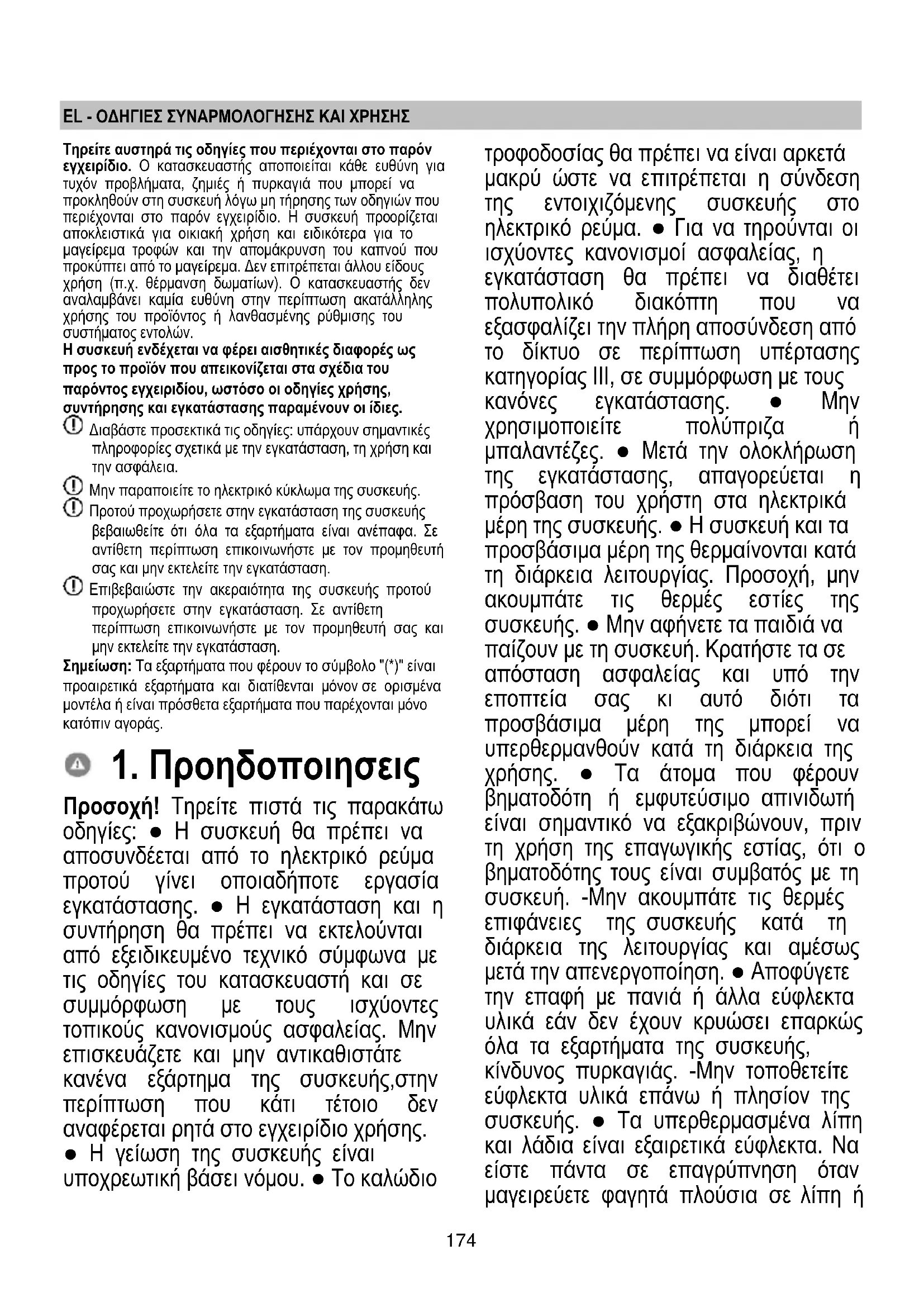 Se, após as verificações acima, o problema persistir, entrar em contacto com o Serviço de Assistência mais próximo.174 EL - ΟΔΗΓΙΕΣ ΣΥΝΑΡΜΟΛΟΓΗΣΗΣ ΚΑΙ ΧΡΗΣΗΣ Τηρείτε αυστηρά τις οδηγίες που περιέχονται στο παρόν εγχειρίδιο. Ο κατασκευαστής αποποιείται κάθε ευθύνη για τυχόν προβλήματα, ζημιές ή πυρκαγιά που μπορεί να προκληθούν στη συσκευή λόγω μη τήρησης των οδηγιών που περιέχονται στο παρόν εγχειρίδιο. Η συσκευή προορίζεται αποκλειστικά για οικιακή χρήση και ειδικότερα για το μαγείρεμα τροφών και την απομάκρυνση του καπνού που προκύπτει από το μαγείρεμα. Δεν επιτρέπεται άλλου είδους χρήση (π.χ. θέρμανση δωματίων). Ο κατασκευαστής δεν αναλαμβάνει καμία ευθύνη στην περίπτωση ακατάλληλης χρήσης του προϊόντος ή λανθασμένης ρύθμισης του συστήματος εντολών. Η συσκευή ενδέχεται να φέρει αισθητικές διαφορές ως προς το προϊόν που απεικονίζεται στα σχέδια του παρόντος εγχειριδίου, ωστόσο οι οδηγίες χρήσης, συντήρησης και εγκατάστασης παραμένουν οι ίδιες. Διαβάστε προσεκτικά τις οδηγίες: υπάρχουν σημαντικές πληροφορίες σχετικά με την εγκατάσταση, τη χρήση και την ασφάλεια. Μην παραποιείτε το ηλεκτρικό κύκλωμα της συσκευής. Προτού προχωρήσετε στην εγκατάσταση της συσκευής βεβαιωθείτε ότι όλα τα εξαρτήματα είναι ανέπαφα. Σε αντίθετη περίπτωση επικοινωνήστε με τον προμηθευτή σας και μην εκτελείτε την εγκατάσταση. Επιβεβαιώστε την ακεραιότητα της συσκευής προτού προχωρήσετε στην εγκατάσταση. Σε αντίθετη περίπτωση επικοινωνήστε με τον προμηθευτή σας και μην εκτελείτε την εγκατάσταση. Σημείωση: Τα εξαρτήματα που φέρουν το σύμβολο "(*)" είναι προαιρετικά εξαρτήματα και διατίθενται μόνον σε ορισμένα μοντέλα ή είναι πρόσθετα εξαρτήματα που παρέχονται μόνο κατόπιν αγοράς.