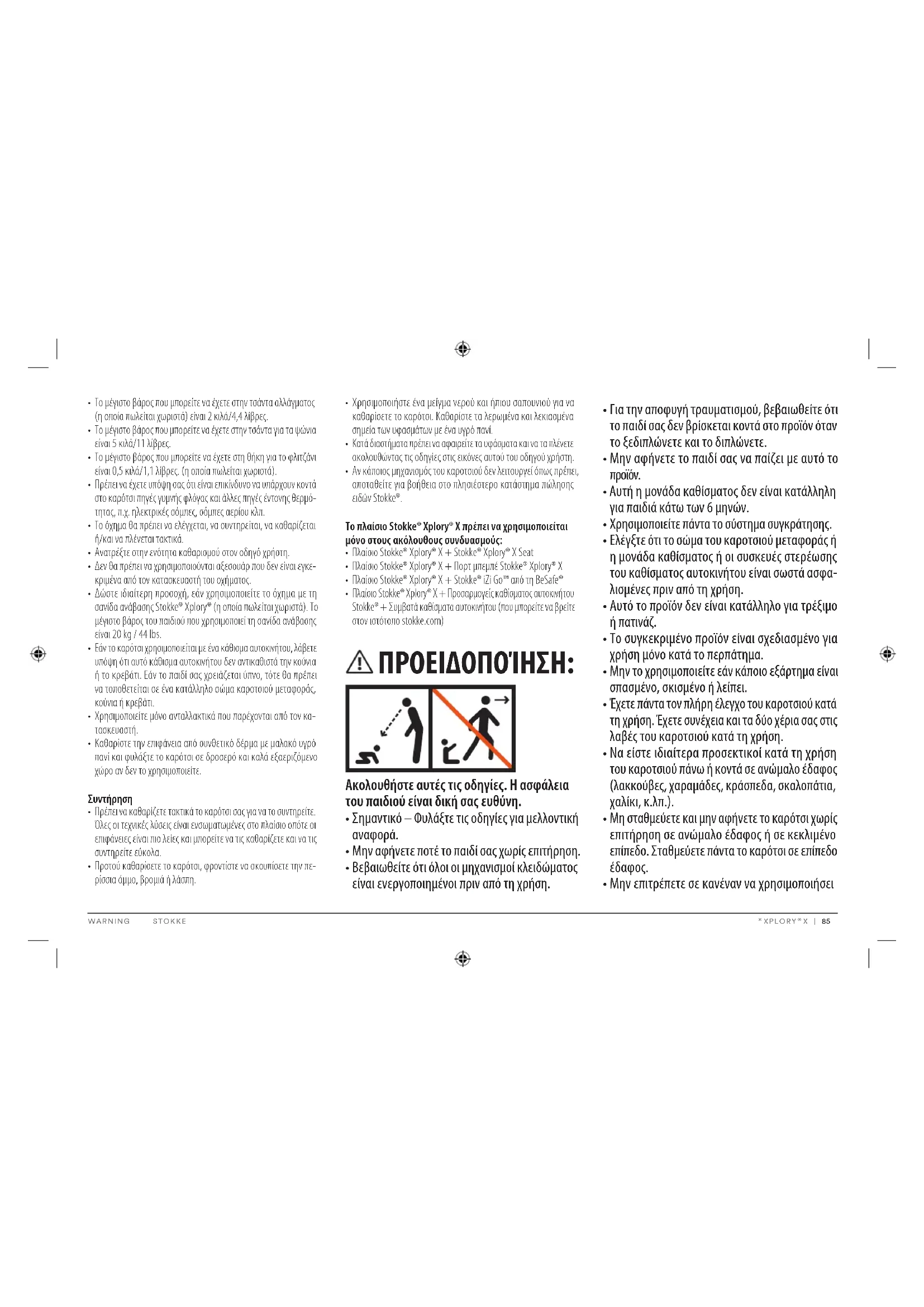 - Πρέπει να χρησιμοποιείτε το καρότσι μόνο για 1 παιδί κάθε φορά, εκτός αν χρησιμοποιείτε τροχοσανίδα για το αδελφάκι του οπότε επιτρέπεται να μεταφέρετε 2 παιδιά (1 στο κάθισμα και 1 στην τροχοσανίδα).WARNING STOKKE