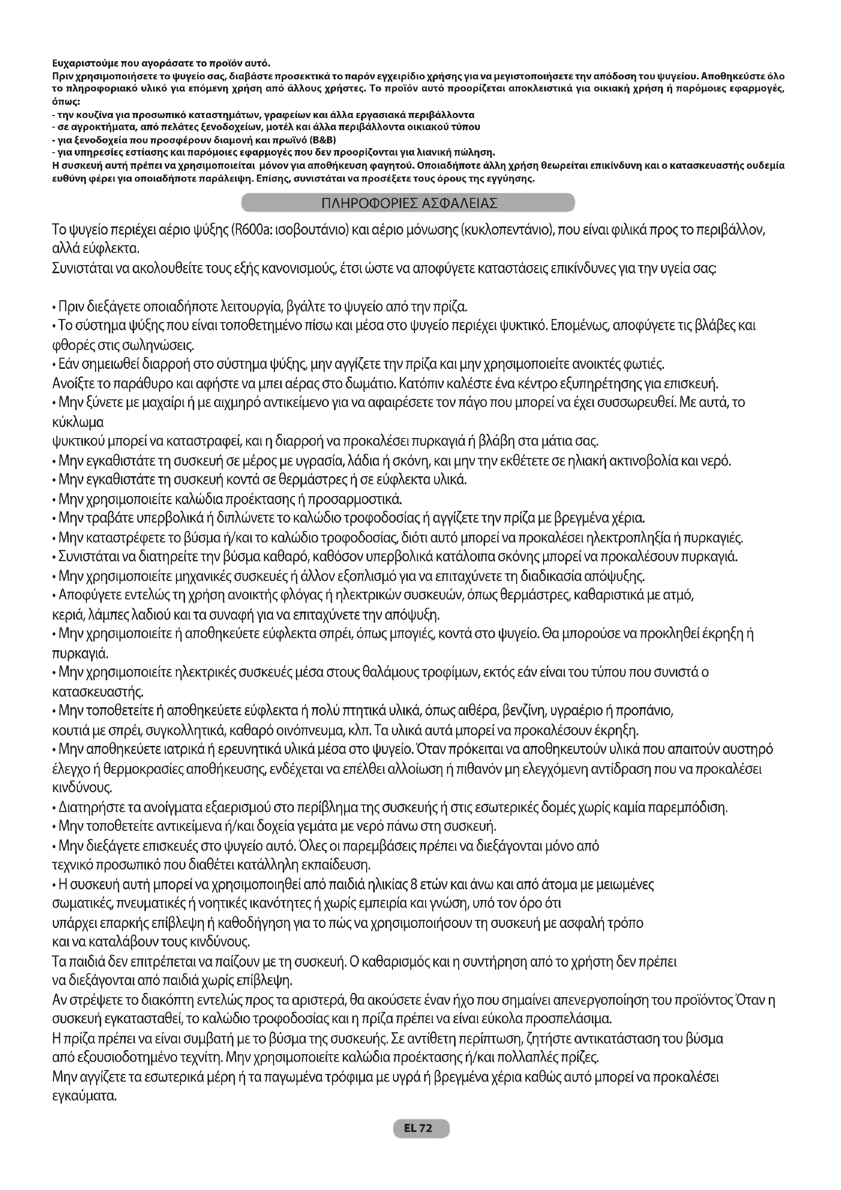 - Vergewis u ervan dat er stroom is in de woning. ALS U HET PROBLEEM NIET HEBT OPGELOST, NEEM CONTACT OP MET HET SERVICECENTRUM. VERMELD DE AARD VAN DE STORING EN DE INFORMATIE OP HET TYPEPLAATJE BINNENIN HET KOELGEDEELTE:EL ΠΕΡΙΕΧΟΜΕΝΑ EL 71 ΠΛΗΡΟΦΟΡΙΕΣ ΑΣΦΑΛΕΙΑΣ........................................................ 72--72 ΕΓΚΑΤΑΣΤΑΣΗ .............................................................................. 73--73 ΛΕΙΤΟΥΡΓΙΑ .................................................................................. 73--73 ΔΙΑΤΗΡΗΣΗ .................................................................................. 74--74 ΚΑΤΑΨΥΞΗ.................................................................................... 75--75 ΑΠΟΨΥΞΗ...................................................................................... 75--75 ΣΥΝΤΗΡΗΣΗ ΚΑΙ ΚΑΘΑΡΙΣΜΟΣ .................................................. 76--76 ΕΞΟΙΚΟΝΟΜΗΣΗ ΕΝΕΡΓΕΙΑΣ ...................................................... 76--76 ΑΘΟΡΥΒΗ ΛΕΙΤΟΥΡΓΙΑ ................................................................ 76--76 ΑΝΤΙΣΤΡΟΦΗ ΤΗΣ ΠΟΡΤΑΣ ........................................................ 76--77 ΔΙΑΣΤΑΣΕΙΣ ΠΡΟΪΟΝΤΟΣ ΚΑΙ ΕΝΣΩΜΑΤΩΜΕΝΟΣ ΘΑΛΑΜΟΣ .................................................................................... 77--78 ΤΟΠΟΘΕΤΗΣΗ ΤΗΣ ΣΥΣΚΕΥΗΣ ΣΤΗ ΣΤΗΛΗ ΕΓΚΑ ΤΑΣΤΑΣΗΣ .................................................................................... 78--78 ΕΝΩΣΗ ΤΩΝ ΘΥΡΩΝ ΤΟΥ ΨΥΓΕΙΟΥ ΜΕ ΤΙΣ ΠΟΡΤΕΣ ΤΟΥ ΕΠΙΠΛΟΥ .......................................................... 79--79 ΠΡΟΦΥΛΑΞΕΙΣ ΓΙΑ ΤΗ ΣΩΣΤΗ ΛΕΙΤΟΥΡΓΙΑ................................ 79--79 ΠΑΡΑΤΕΤΑΜΕΝΗ ΑΝΑΣΤΟΛΗ ΛΕΙΤΟΥΡΓΙΑΣ.............................. 79--79 ΑΝΤΙΜΕΤΩΠΙΣΗ ΠΡΟΒΛΗΜΑΤΩΝ .............................................. 80--80EL 72 Ευχαριστούμε που αγοράσατε το προϊόν αυτό. Πριν χρησιμοποιήσετε το ψυγείο σας, διαβάστε προσεκτικά το παρόν εγχειρίδιο χρήσης για να μεγιστοποιήσετε την απόδοση του ψυγείου. Αποθηκεύστε όλο το πληροφοριακό υλικό για επόμενη χρήση από άλλους χρήστες. Το προϊόν αυτό προορίζεται αποκλειστικά για οικιακή χρήση ή παρόμοιες εφαρμογές,