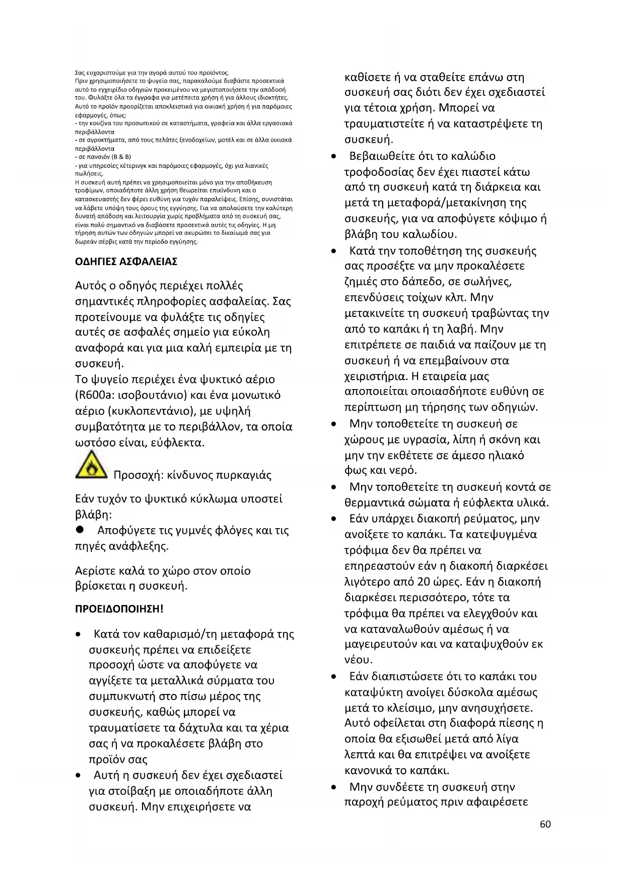 Το ψυγείο περιέχει ένα ψυκτικό αέριο (R600a: ισοβουτάνιο) και ένα μονωτικό αέριο (κυκλοπεντάνιο), με υψηλή συμβατότητα με το περιβάλλον, τα οποία ωστόσο είναι, εύφλεκτα. Προσοχή: κίνδυνος πυρκαγιάς Εάν τυχόν το ψυκτικό κύκλωμα υποστεί