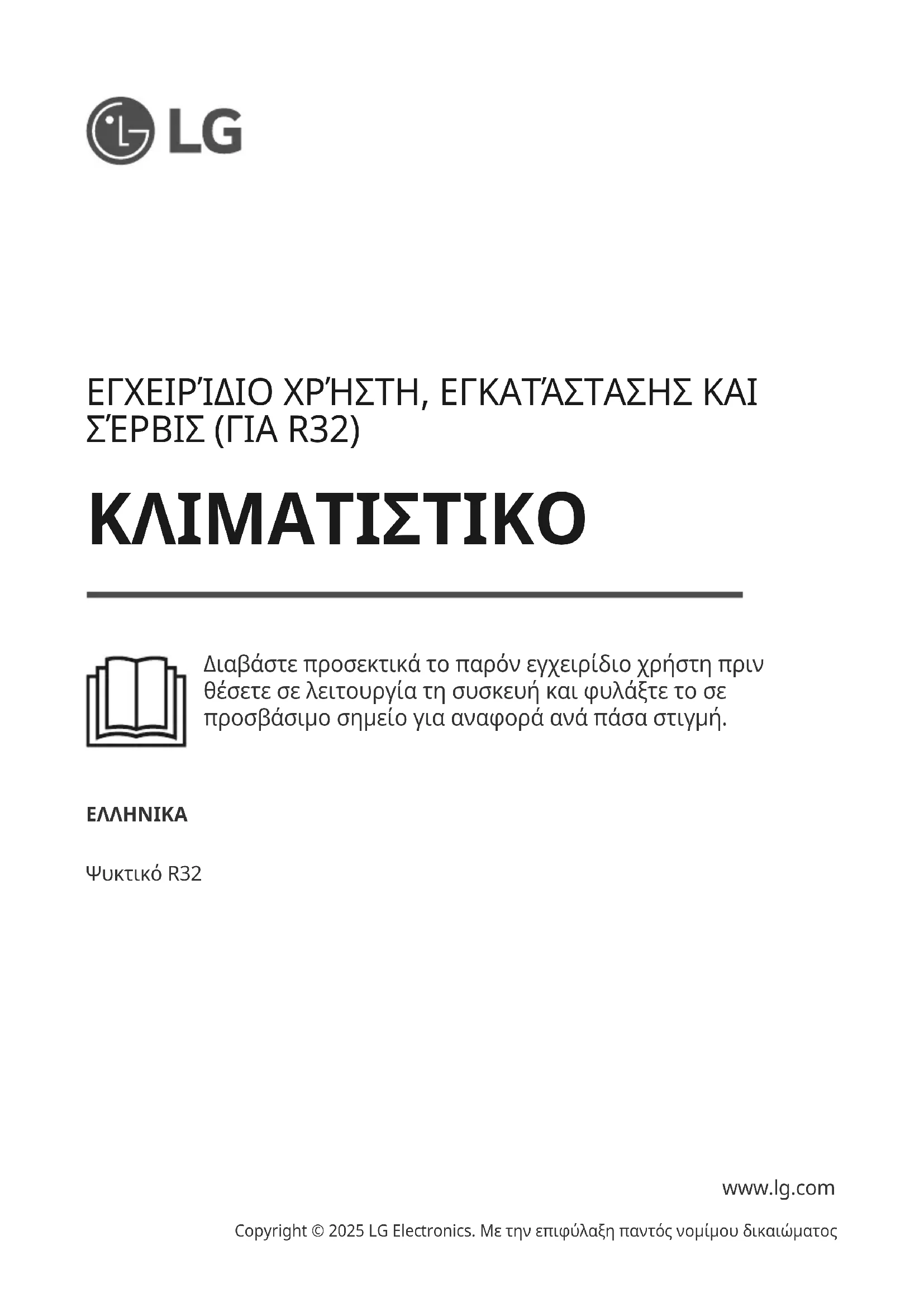 - Ψυκτικό R32 www.lg.com Copyright © 2025 LG Electronics. Με την επιφύλαξη παντός νομίμου δικαιώματοςΠΙΝΑΚΑΣ ΠΕΡΙΕΧΟΜΕΝΩΝ Το εγχειρίδιο αυτό μπορεί να περιέχει εικόνες ή περιεχόμενο διαφορετικό από το μοντέλο που αγοράσατε. Το εγχειρίδιο υπόκειται σε αναθεώρηση από τον κατασκευαστή. ΟΔΗΓΙΕΣ ΑΣΦΑΛΕΙΑΣ ΔΙΑΒΑΣΤΕ ΟΛΕΣ ΤΙΣ ΟΔΗΓΙΕΣ ΠΡΙΝ ΤΗ ΧΡΗΣΗ p. 3