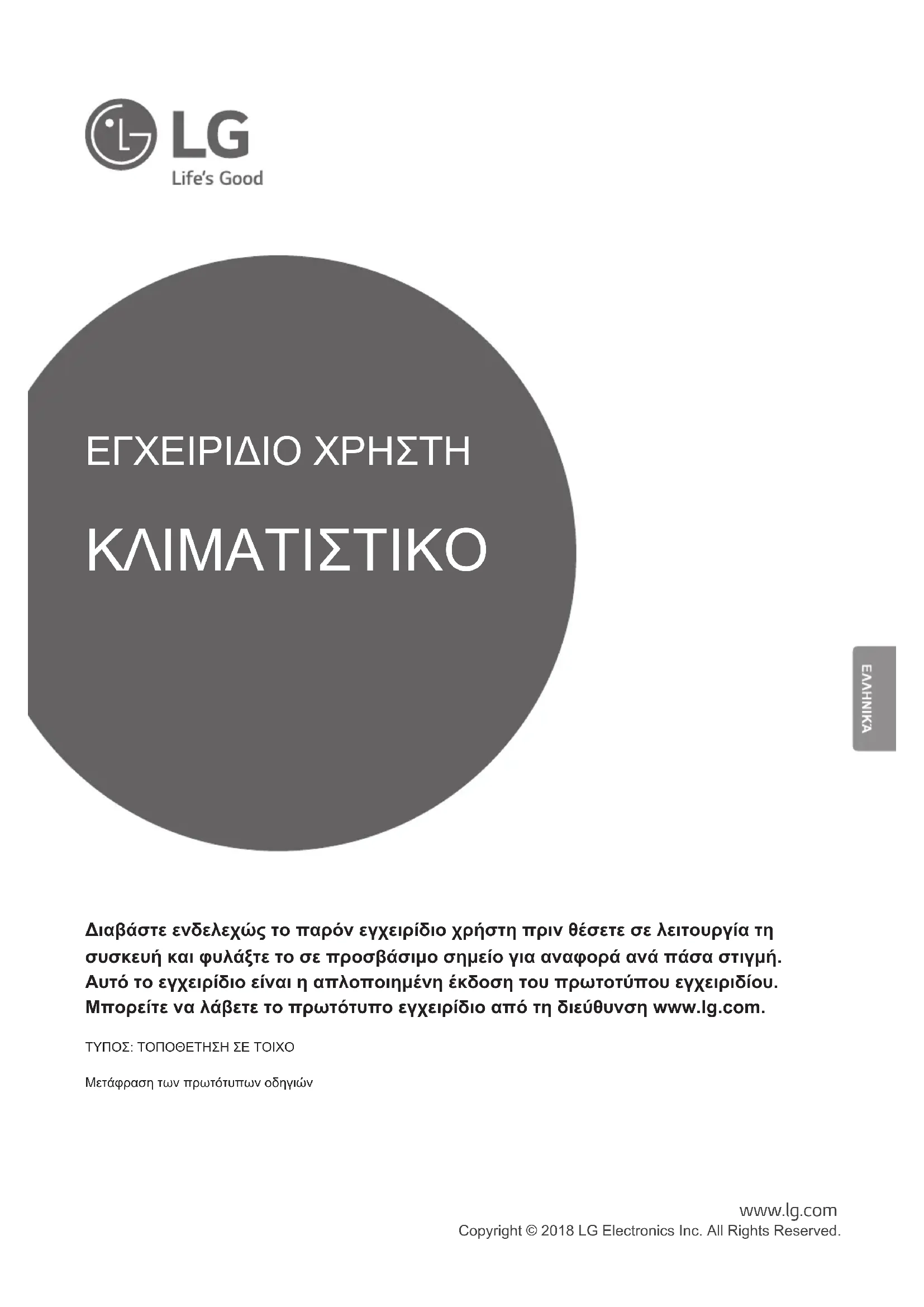 - Drücken Sie die Schaltfläche SET/CANCEL, um die ausgewählte FUNC zu steuern.ΕΓΧΕΙΡΙΔΙΟ ΧΡΗΣΤΗ ΚΛΙΜΑΤΙΣΤΙΚΟ Διαβάστε ενδελεχώς το παρόν εγχειρίδιο χρήστη πριν θέσετε σε λειτουργία τη συσκευή και φυλάξτε το σε προσβάσιμο σημείο για αναφορά ανά πάσα στιγμή. Αυτό το εγχειρίδιο είναι η απλοποιημένη έκδοση του πρωτοτύπου εγχειριδίου. Μπορείτε να λάβετε το πρωτότυπο εγχειρίδιο από τη διεύθυνση www.lg.com. ΤΥΠΟΣ: ΤΟΠΟΘΕΤΗΣΗ ΣΕ ΤΟΙΧΟΜετάφραση των πρωτότυπων οδηγιών www.lg.com Copyright © 2018 LG Electronics Inc. All Rights Reserved.ΠΙΝΑΚΑΣ ΠΕΡΙΕΧΟΜΕΝΩΝ Το εγχειρίδιο παράγεται για μία ομάδα προϊόντων και μπορεί να περιέχει εικόνες ή περιεχόμενο διαφορετικό από το μοντέλο που αγοράσατε. Το εγχειρίδιο υπόκειται σε αναθεώρηση από τον κατασκευαστή. ΟΔΗΓΙΕΣ ΑΣΦΑΛΕΙΑΣ ............................................ 3 ΣΗΜΑΝΤΙΚΕΣ ΟΔΗΓΙΕΣ ΑΣΦΑΛΕΙΑΣ .................................................... 4 ΛΕΙΤΟΥΡΓΙΑ ............................................................. 9 Σημειώσεις για λειτουργία ........................................................................ 9 Εξαρτήματα και λειτουργίες