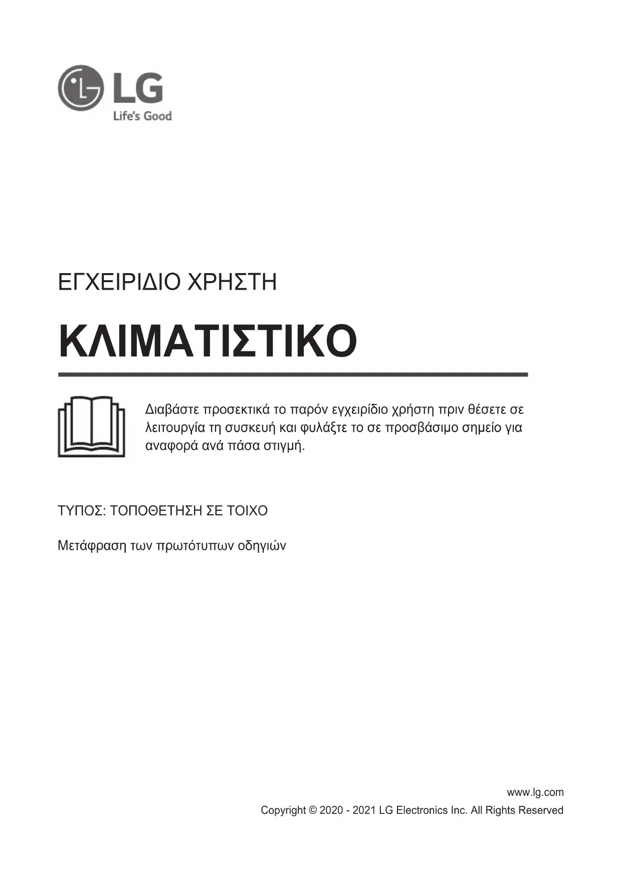 - Certaines fonctions peuvent ne pas être prises en charge en fonction du modèle.www.lg.com ΚΛΙΜΑΤΙΣΤΙΚΟ Copyright © 2020 - 2021 LG Electronics Inc. All Rights Reserved ΤΥΠΟΣ: ΤΟΠΟΘΕΤΗΣΗ ΣΕ ΤΟΙΧΟ Μετάφραση των πρωτότυπων οδηγιών ΕΓΧΕΙΡΙΔΙΟ ΧΡΗΣΤΗ Διαβάστε προσεκτικά το παρόν εγχειρίδιο χρήστη πριν θέσετε σε λειτουργία τη συσκευή και φυλάξτε το σε προσβάσιμο σημείο για αναφορά ανά πάσα στιγμή.ΠΙΝΑΚΑΣ ΠΕΡΙΕΧΟΜΕΝΩΝ Το εγχειρίδιο αυτό μπορεί να περιέχει εικόνες ή περιεχόμενο διαφορετικό από το μοντέλο που αγοράσατε. Το εγχειρίδιο υπόκειται σε αναθεώρηση από τον κατασκευαστή. ΟΔΗΓΙΕΣ ΑΣΦΑΛΕΙΑΣ ...................................................................3 ΣΗΜΑΝΤΙΚΕΣ ΟΔΗΓΙΕΣ ΑΣΦΑΛΕΙΑΣ ..............................................................4 ΛΕΙΤΟΥΡΓΙΑ ................................................................................. 11 Σημειώσεις για λειτουργία ...............................................................................11 Εξαρτήματα και λειτουργίες ............................................................................. 11 Ασύρματο Τηλεχειριστήριο ..............................................................................12 Αυτόματη επανεκκίνηση του Κλιματιστικού .....................................................17 Χρήση του Τρόπου λειτουργίας .......................................................................17 Χρήση του Τρόπου λειτουργίας Πίδακα ..........................................................20 Χρήση της Λειτουργίας Ταχύτητας Ανεμιστήρα ...............................................21 Χρήση της Λειτουργίας Κατεύθυνσης Ροής Αέρα ............................................21 Ρύθμιση του Χρονοδιακόπτη Ενεργοποίησης/Απενεργοποίησης ...................22 Χρήση της Λειτουργίας Ύπνου (Προαιρετικό) .................................................23 Χρήση της Λειτουργίας Απλού Χρονοδιακόπτη (Προαιρετικό) ........................23 Χρήση της Λειτουργίας Προβολής Ενέργειας (Προαιρετικό) ...........................24 Χρήση της Λειτουργίας Σβήσιμου Φωτός (Προαιρετικό) .................................24 Χρήση της Λειτουργίας Αέρα Άνεσης (Προαιρετικό) ........................................24 Χρήση της Λειτουργίας Ελέγχου Ενέργειας (Προαιρετικό) ..............................25 Τρόπος χρήσης Καθαρισμού Αέρα .................................................................25 Έλεγχος συνολικής ποιότητας αέρα ................................................................26 Χρήση ειδικών λειτουργιών .............................................................................28 ΕΞΥΠΝΕΣ ΛΕΙΤΟΥΡΓΙΕΣ ..............................................................29 Εφαρμογή LG ThinQ .......................................................................................29 Smart Diagnosis .............................................................................................. 31 ΣΥΝΤΗΡΗΣΗ ................................................................................. 32 Αντικατάσταση και καθαρισμός του φίλτρου Micro Dust .................................34 Αντικατάσταση του Τριπλού φίλτρου (Προαιρετικό) ........................................35 Καθαρίστε τον αισθητήρα PM1,0 ....................................................................36 ΕΠΙΛΥΣΗ ΠΡΟΒΛΗΜΑΤΩΝ ..........................................................373