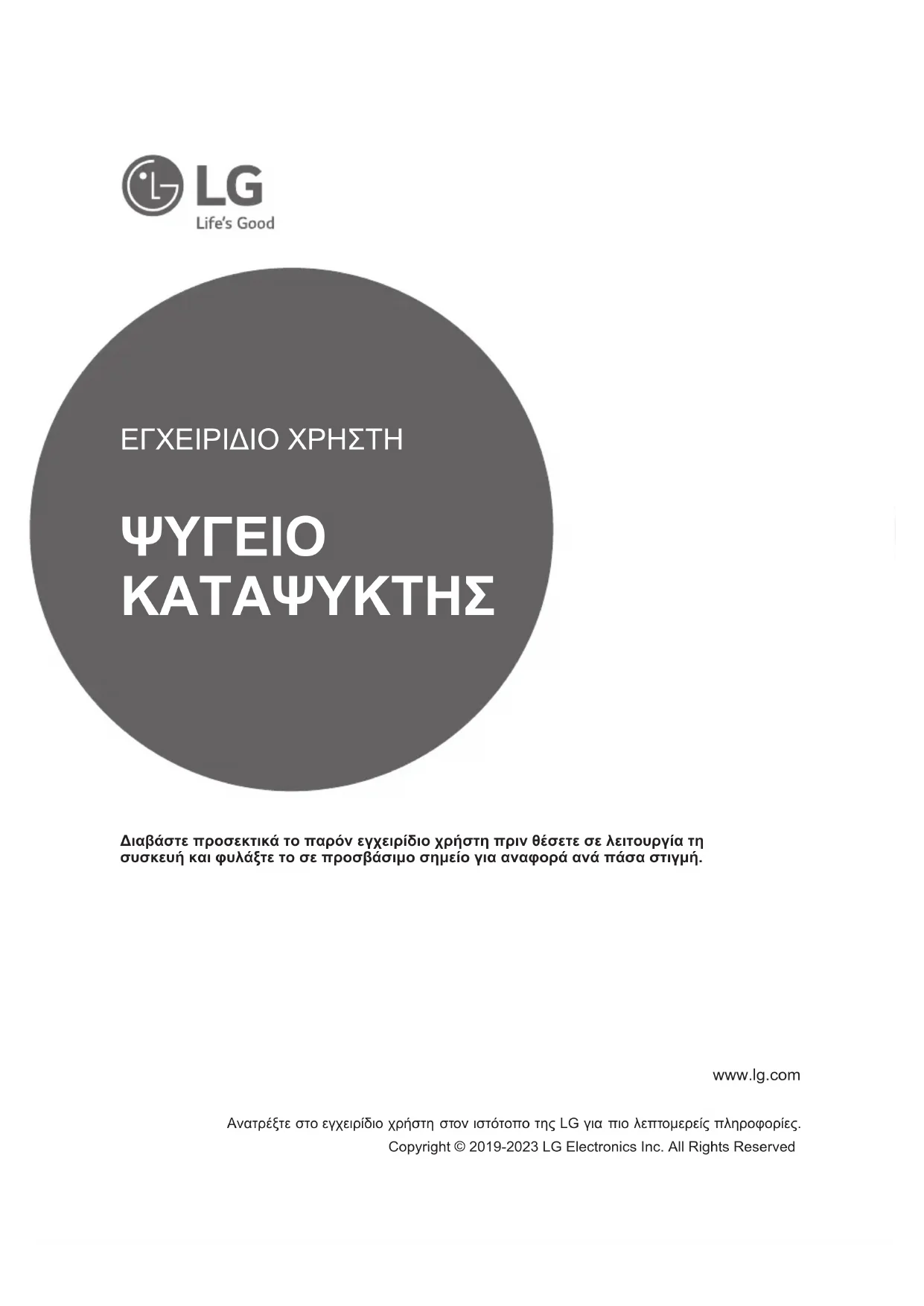 Διαβάστε προσεκτικά το παρόν εγχειρίδιο χρήστη πριν θέσετε σε λειτουργία τη συσκευή και φυλάξτε το σε προσβάσιμο σημείο για αναφορά ανά πάσα στιγμή. Ανατρέξτε στο εγχειρίδιο χρήστη στον ιστότοπο της LG για πιο λεπτομερείς πληροφορίες. Copyright © 2019-2023 LG Electronics Inc. All Rights ReservedΠΙΝΑΚΑΣ ΠΕΡΙΕΧΟΜΕΝΩΝ Το εγχειρίδιο αυτό μπορεί να περιέχει εικόνες ή περιεχόμενο διαφορετικό από το μοντέλο που αγοράσατε. Το εγχειρίδιο υπόκειται σε αναθεώρηση από τον κατασκευαστή. ΟΔΗΓΙΕΣ ΑΣΦΑΛΕΙΑΣ ............................................................3 ΣΗΜΑΝΤΙΚΕΣ ΟΔΗΓΙΕΣ ΑΣΦΑΛΕΙΑΣ ....................................................... 3 ΕΓΚΑΤΑΣΤΑΣΗ .......................................................................10 Διαστάσεις και Αποστάσεις .......................................................................10 Θερμοκρασία Περιβάλλοντος ...................................................................10 ΛΕΙΤΟΥΡΓΙΑ ...........................................................................11 Σημειώσεις για λειτουργία .........................................................................11 Μετατροπέας φρέσκου ( * )....................................................................... Συρτάρι φρέσκων λαχανικών ( * ) ............................................................. 13 ΕΞΥΠΝΕΣ ΛΕΙΤΟΥΡΓΙΕΣ ......................................................17 Eφαρμογής LG ThinQ ................. ............................................................ 17 ΣΥΝΤΗΡΗΣΗ ...........................................................................19 ΕΠΙΛΥΣΗ ΠΡΟΒΛΗΜΑΤΩΝ ..............................................20 Σημειώσεις σχετικά με το καθάρισμα ........................................................ 19 Απόρριψη της παλιάς σας συσκευής ........................................................19