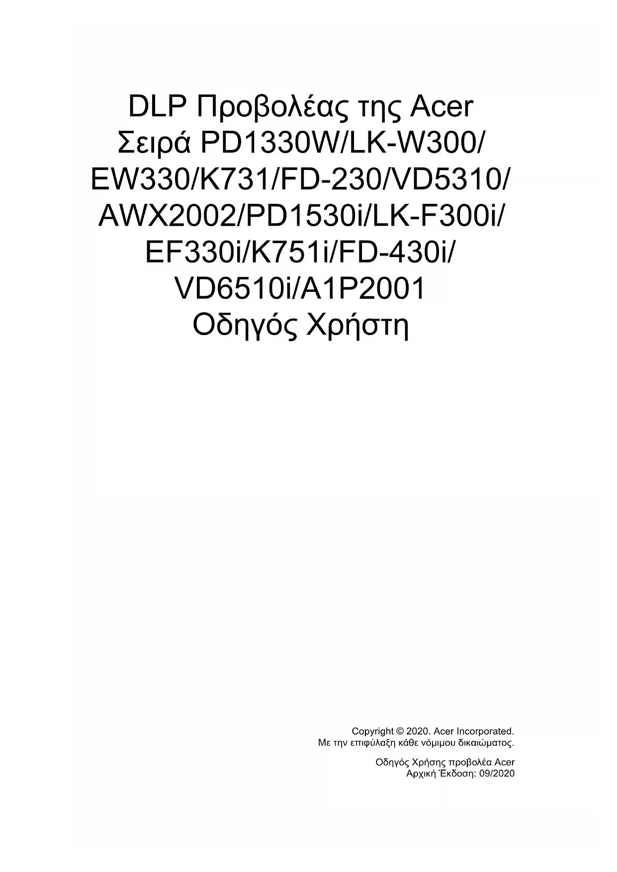 DLP Προβολέας της Acer Σειρά PD1330W/LK-W300/ EW330/K731/FD-230/VD5310/ AWX2002/PD1530i/LK-F300i/ EF330i/K751i/FD-430i/ VD6510i/A1P2001 Οδηγός Χρήστη Copyright © 2020. Acer Incorporated. Με την επιφύλαξη κάθε νόμιμου δικαιώματος. Οδηγός Χρήσης προβολέα Acer Αρχική Έκδοση: 09/2020Μπορεί περιοδικά να γίνονται αλλαγές στις πληροφορίες σε αυτήν την έκδοση δίχως την υποχρέωση να ειδοποιηθεί οποιοδήποτε πρόσωπο για αυτές τις αναθεωρήσεις ή αλλαγές. Τέτοι ο υ είδους αλλαγές θα ενσωματώνονται σε νέες εκδόσεις αυτού του εγχειριδίου ή συμπληρωματικών εγγράφων και εκδόσεων. Η εταιρία δεν δίνει εγγυήσεις, είτε εκφραζόμενες είτε υπαινισσόμενες,