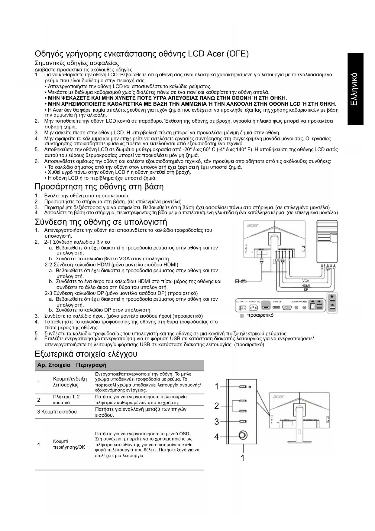 HDMI Feketeszint Gyorsindítás mód USB-töltés kikapcsolt állapotban Kijelzőinformációk Állítsa vissza az összes beállítást Kilépés A műszaki adatok típusonként és/vagy régiónként eltérőek lehetnek.Ελληνικά Οδηγός γρήγορης εγκατάστασης οθόνης LCD Acer (ΟΓΕ) Σημαντικές οδηγίες ασφαλείας ∆ιαβάστε προσεκτικά τις ακόλουθες οδηγίες. 1. Για να καθαρίσετε την οθόνη LCD: Βεβαιωθείτε ότι η οθόνη σας είναι ηλεκτρικά χαρακτηρισμένη για λειτουργία με το εναλλασσόμενο ρεύμα που είναι διαθέσιμο στην περιοχή σας.