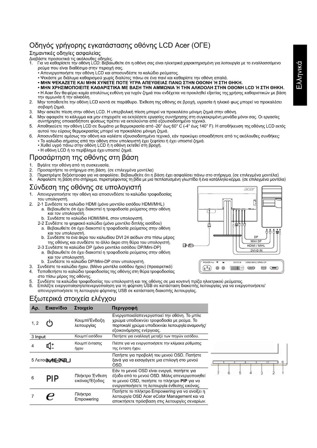 Empowering Πατήστε το πλήκτρο Empowering για να ανοίξει η λειτουργία OSD Acer eColor Management και να αποκτήσετε πρόσβαση στις λειτουργίες σεναρίων. POWERDVI-D INHDMI (MHL) DPMini DPMini DP DVI-D INHDMI / MHLPOWERDVI-D INHDMI (MHL) DPMini DPΕλληνικά Κανονισμοί και ειδοποιήσεις ασφαλείας Ειδοποίηση της FCC Αυτή η συσκευή έχει ελεγχθεί και διαπιστώθηκε ότι συμμορφώνεται με τα όρια για μια ψηφιακή συσκευή κατηγορίας B, σύμφωνα με το Μέρος 15 των κανονισμών FCC. Αυτά τα όρια έχουν σχεδιαστεί ώστε να παρέχουν εύλογη προστασία έναντι επιβλαβών παρεμβολών σε μια οικιακή εγκατάσταση. Η παρούσα συσκευή παράγει, χρησιμοποιεί και μπορεί να εκπέμψει ενέργεια ραδιοσυχνοτήτων και, εάν δεν εγκατασταθεί και χρησιμοποιηθεί σύμφωνα με τις οδηγίες, μπορεί να επιφέρει επιβλαβείς παρεμβολές στις ραδιοεπικοινωνίες. Ωστόσο, δεν παρέχεται εγγύηση ότι δεν θα σημειωθούν παρεμβολές σε μια συγκεκριμένη εγκατάσταση. Εάν ηπαρούσα συσκευή προκαλεί επιβλαβείς παρεμβολές στη λήψη ραδιοφωνικού ή τηλεοπτικού σήματος, γεγονός που μπορεί να διαπιστωθεί με απενεργοποίηση και επανενεργοποίηση της συσκευής, ο χρήστης ενθαρρύνεται να δοκιμάσει να διορθώσει την παρεμβολή με ένα ή περισσότερα από τα ακόλουθα μέτρα: Αναπροσανατολίστε ή μετακινήστε την κεραία λήψης. Αυξήστε την απόσταση μεταξύ της συσκευής και του δέκτη. Συνδέστε τη συσκευή σε μια πρίζα που βρίσκεται σε διαφορετικό κύκλωμα από αυτό στο οποίο είναι συνδεδεμένος ο δέκτης. Συμβουλευτείτε τον αντιπρόσωπο ή έναν έμπειρο τεχνικό ραδιοφώνων/τηλεοράσεων για βοήθεια. Δήλωση Συμμόρφωσης CE Δια του παρόντος, η Acer Inc., δηλώνει ότι αυτή η οθόνη LCD συμμορφώνεται με τις βασικές απαιτήσεις και άλλες σχετικές διατάξεις της οδηγίας EMC 2014/30/ΕΕ, την Οδηγία Χαμηλής Τάσης 2014/35/ΕΕ, καθώς και την Οδηγία RoHS 2011/65/ΕΕ και την Οδηγία 2009/125/ΕΚ όσον αφορά τη θέσπιση ενός πλαισίου για τον καθορισμό απαιτήσεων οικολογικού σχεδιασμού για προϊόντα που σχετίζονται με την ενέργεια. Ειδοποίηση: Για να αποφευχθεί ενδεχόμενη ζημιά στην οθόνη, μην την σηκώνετε από τη βάση της. Ειδοποίηση: Θωρακισμένα καλώδια Όλες οι συνδέσεις με άλλες υπολογιστικές συσκευές πρέπει να γίνονται με θωρακισμένα καλώδια για να διατηρηθεί η συμμόρφωση με τους κανονισμούς EMC. Ειδοποίηση: Περιφερειακές συσκευές Μόνο περιφερειακές συσκευές (συσκευές εισόδου/εξόδου, τερματικά, εκτυπωτές κ.λπ.) που είναι πιστοποιημένες ως προς τη συμμόρφωση με τα όρια της κατηγορίας B μπορούν να συνδεθούν σε αυτόν τον εξοπλισμό. Λειτουργία με μη πιστοποιημένα περιφερειακά είναι πιθανό να οδηγήσει σε παρεμβολές στη λήψη ραδιοφωνικού και τηλεοπτικού σήματος.
