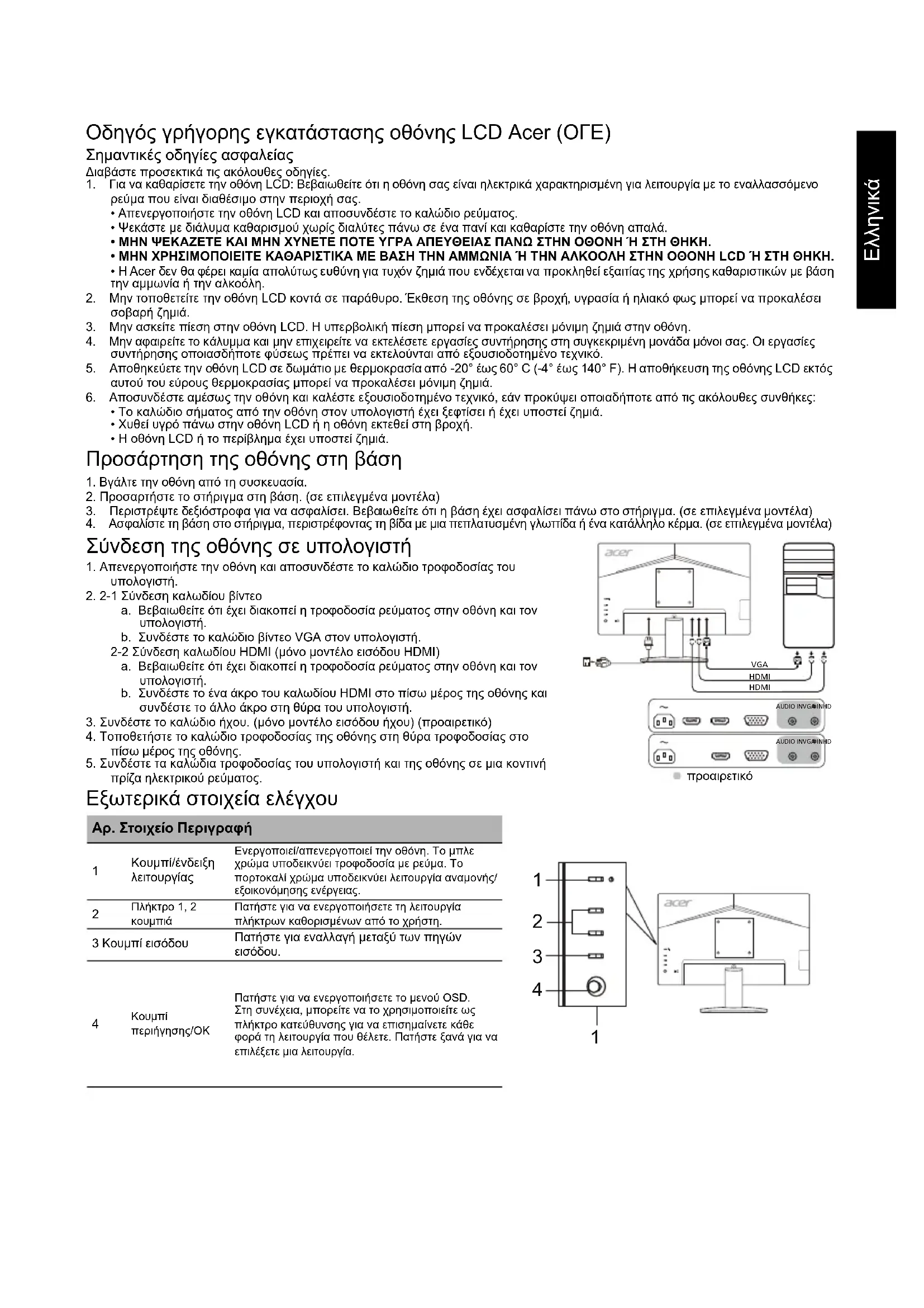 Αλλαγές ή τροποποιήσεις που δεν έχουν εγκριθεί ρητά από τον κατασκευαστή ενδέχεται να ακυρώσουν την άδεια του χρήστη, η οποία χορηγείται από την Ομοσπονδιακή Επιτροπή Επικοινωνιών, για τον χειρισμό αυτού του προϊόντος. Συνθήκες λειτουργίας Αυτή η συσκευή συμμορφώνεται με το Μέρος 15 των κανονισμών FCC. Η λειτουργία της υπόκειται στις ακόλουθες δύο συνθήκες: (1) αυτή η συσκευή δεν μπορεί να προκαλέσει επιβλαβή παρεμβολή και (2) αυτή η συσκευή πρέπει να δέχεται οποιαδήποτε παρεμβολή που λαμβάνει, συμπεριλαμβανομένων των παρεμβολών που ενδέχεται να προκαλέσουν ανεπιθύμητη λειτουργία. Ειδοποίηση: Καναδοί χρήστες Αυτή η ψηφιακή συσκευή κατηγορίας Β συμμορφώνεται με το καναδικό πρότυπο ICES-003. Remarque à l'intention des utilisateurs canadiens Cet appareil numérique de la classe B est conforme à la norme NMB-003 du Canada. Απόρριψη άχρηστου εξοπλισμού από χρήστες σε ιδιωτικά νοικοκυριά στην Ευρωπαϊκή Ένωση Αυτό το σύμβολο πάνω στο προϊόν ή πάνω στη συσκευασία υποδεικνύει ότι αυτό το προϊόν δεν πρέπει να απορρίπτεται μαζί με τα υπόλοιπα οικιακά απορρίμματα. Αντί γι' αυτό, είναι δική σας ευθύνη να απορρίπτετε τον άχρηστο εξοπλισμό παραδίνοντάς τον σε ένα καθορισμένο σημείο συλλογής για την ανακύκλωση αποβλήτων ηλεκτρικού και ηλεκτρονικού εξοπλισμού. Η χωριστή συλλογή και ανακύκλωση του άχρηστου εξοπλισμού κατά τη στιγμή της απόρριψης θα βοηθήσει στη διατήρηση των φυσικών πόρων και θα διασφαλίσει ότι ανακυκλώνονται κατά τρόπο που προστατεύεται η ανθρώπινη υγεία και το περιβάλλον. Για περισσότερες πληροφορίες σχετικά με το πού μπορείτε να απορρίψετε τον άχρηστο εξοπλισμό σας για ανακύκλωση, επικοινωνήστε με το τοπικό γραφείο της πόλης σας, την υπηρεσία διάθεσης οικιακών απορριμμάτων ή το κατάστημα από όπου αγοράσατε το προϊόν.Ελληνικά ΠΡΟΔΙΑΓΡΑΦΕΣ Βρείτε τα εγχειρίδια και τη λοιπή τεκμηρίωση για το προϊόν Acer στην επίσημη ιστοσελίδα υποστήριξης της Acer. Οθόνη LCD Σύστημα οδήγησης Έγχρωμη οθόνη LCD TFT Μέγεθος 23,8”W (60 cm) Βήμα pixel 0,2745 mm (Ο) x 0,2745 mm (Κ) Φωτεινότητα 250 cd/m