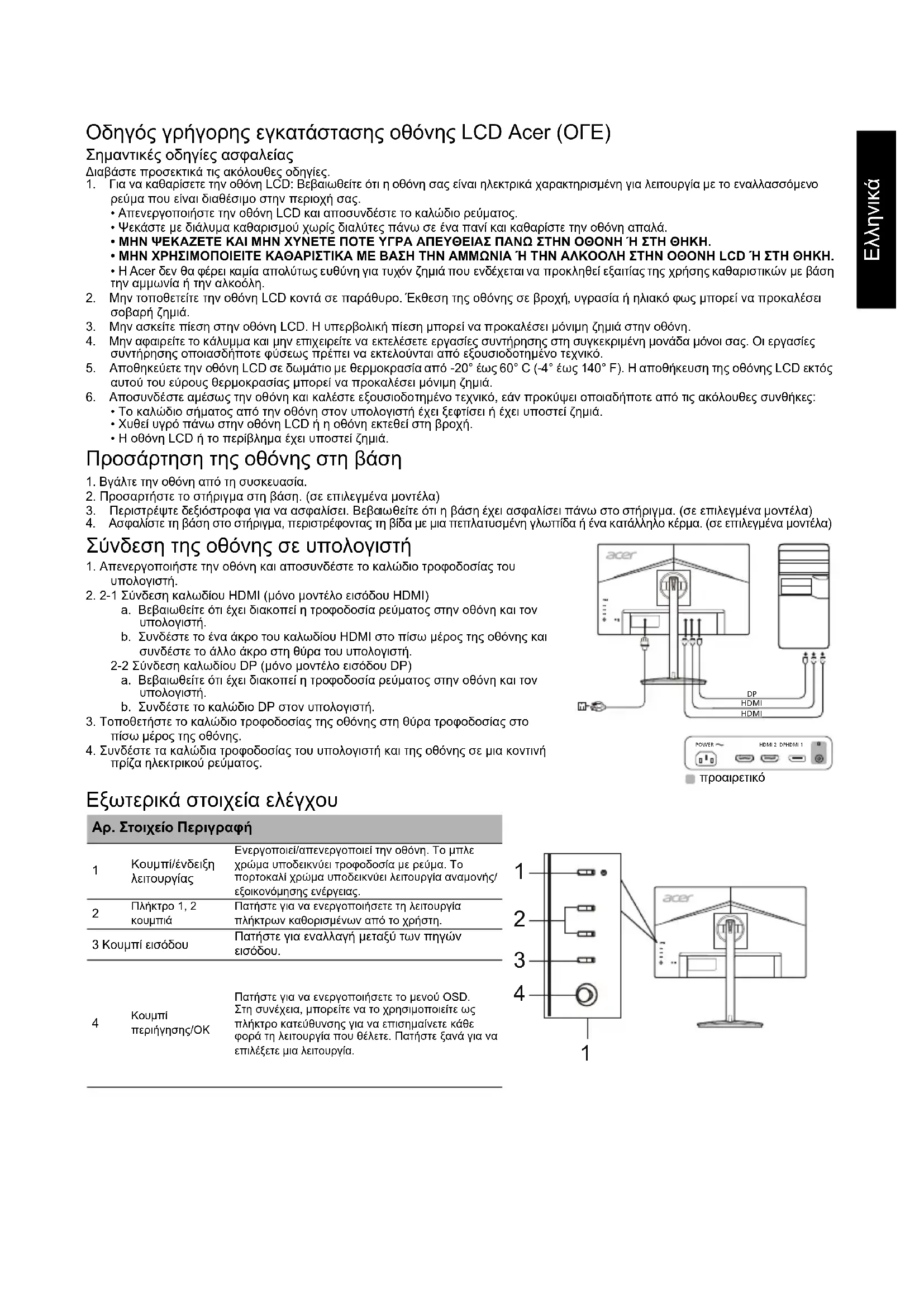 3. Περιστρέψτε δεξιόστροφα για να ασφαλίσει. Βεβαιωθείτε ότι η βάση έχει ασφαλίσει πάνω στο στήριγμα. (σε επιλεγμένα μοντέλα) 4. Ασφαλίστε τη βάση στο στήριγμα, περιστρέφοντας τη βίδα με μια πεπλατυσμένη γλωττίδα ή ένα κατάλληλο κέρμα. (σε επιλεγμένα μοντέλα) Σύνδεση της οθόνης σε υπολογιστή 1. Απενεργοποιήστε την οθόνη και αποσυνδέστε το καλώδιο τροφοδοσίας του υπολογιστή.2. 2-1 Σύνδεση καλωδίου HDMI (μόνο μοντέλο εισόδου HDMI) a. Βεβαιωθείτε ότι έχει διακοπεί η τροφοδοσία ρεύματος στην οθόνη και τον υπολογιστή.b. Συνδέστε το ένα άκρο του καλωδίου HDMI στο πίσω μέρος της οθόνης και συνδέστε το άλλο άκρο στη θύρα του υπολογιστή.2-2 Σύνδεση καλωδίου DP (μόνο μοντέλο εισόδου DP) a. Βεβαιωθείτε ότι έχει διακοπεί η τροφοδοσία ρεύματος στην οθόνη και τον υπολογιστή.b. Συνδέστε το καλώδιο DP στον υπολογιστή.3. Τοποθετήστε το καλώδιο τροφοδοσίας της οθόνης στη θύρα τροφοδοσίας στο πίσω μέρος της οθόνης.4. Συνδέστε τα καλώδια τροφοδοσίας του υπολογιστή και της οθόνης σε μια κοντινή πρίζα ηλεκτρικού ρεύματος. Εξωτερικά στοιχεία ελέγχου Αρ. Στοιχείο Περιγραφή