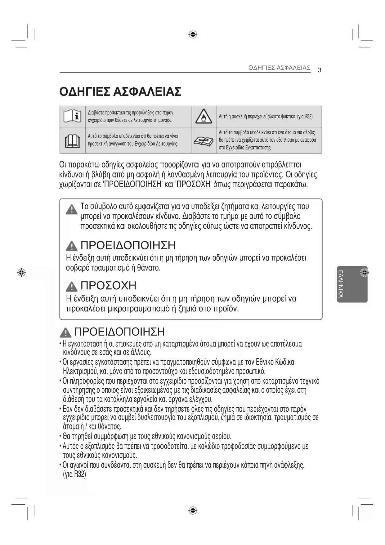 Διαβάστε προσεκτικά τις προφυλάξεις στο παρόν εγχειρίδιο πριν θέσετε σε λειτουργία τη μονάδα. Αυτή η συσκευή περιέχει εύφλεκτο ψυκτικό. (για R32) Αυτό το σύμβολο υποδεικνύει ότι θα πρέπει να γίνει προσεκτική ανάγνωση του Εγχειριδίου Λειτουργίας. Αυτό το σύμβολο υποδεικνύει ότι ένα άτομο για σέρβις θα πρέπει να χειρίζεται αυτό τον εξοπλισμό με αναφορά στο Εγχειρίδιο Εγκατάστασης Οι παρακάτω οδηγίες ασφαλείας προορίζονται για να αποτραπούν απρόβλεπτοι κίνδυνοι ή βλάβη από μη ασφαλή ή λανθασμένη λειτουργία του προϊόντος. Οι οδηγίες χωρίζονται σε 'ΠΡΟΕΙΔΟΠΟΙΗΣΗ' και 'ΠΡΟΣΟΧΗ' όπως περιγράφεται παρακάτω. ΠΡΟΕΙΔΟΠΟΙΗΣΗ Η ένδειξη αυτή υποδεικνύει ότι η μη τήρηση των οδηγιών μπορεί να προκαλέσει σοβαρό τραυματισμό ή θάνατο.