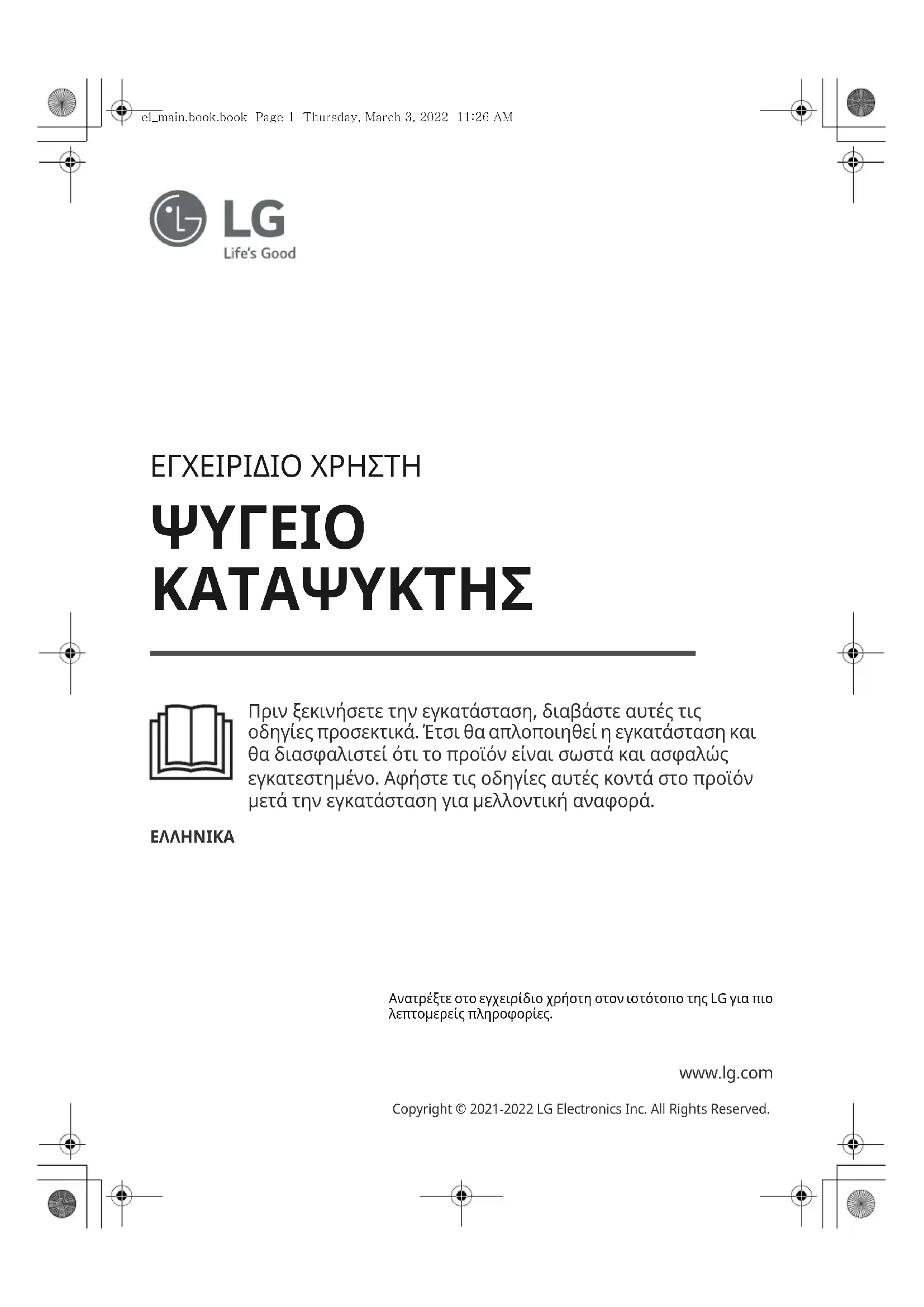- www.lg.com Copyright © 2021-2022 LG Electronics Inc. All Rights Reserved. Ανατρέξτε στο εγχειρίδιο χρήστη στον ιστότοπο της LG για πιο λεπτομερείς πληροφορίες. el_main.book.book Page 1 Thursday, March 3, 2022 11:26 AMΠΙΝΑΚΑΣ ΠΕΡΙΕΧΟΜΕΝΩΝ Το εγχειρίδιο αυτό μπορεί να περιέχει εικόνες ή περιεχόμενο διαφορετικό από το μοντέλο που αγοράσατε. Το εγχειρίδιο υπόκειται σε αναθεώρηση από τον κατασκευαστή. ΟΔΗΓΙΕΣ ΑΣΦΑΛΕΙΑΣ ΔΙΑΒΑΣΤΕ ΟΛΕΣ ΤΙΣ ΟΔΗΓΙΕΣ ΠΡΙΝ ΑΠΟ ΤΗ ΧΡΗΣΗ p. 3