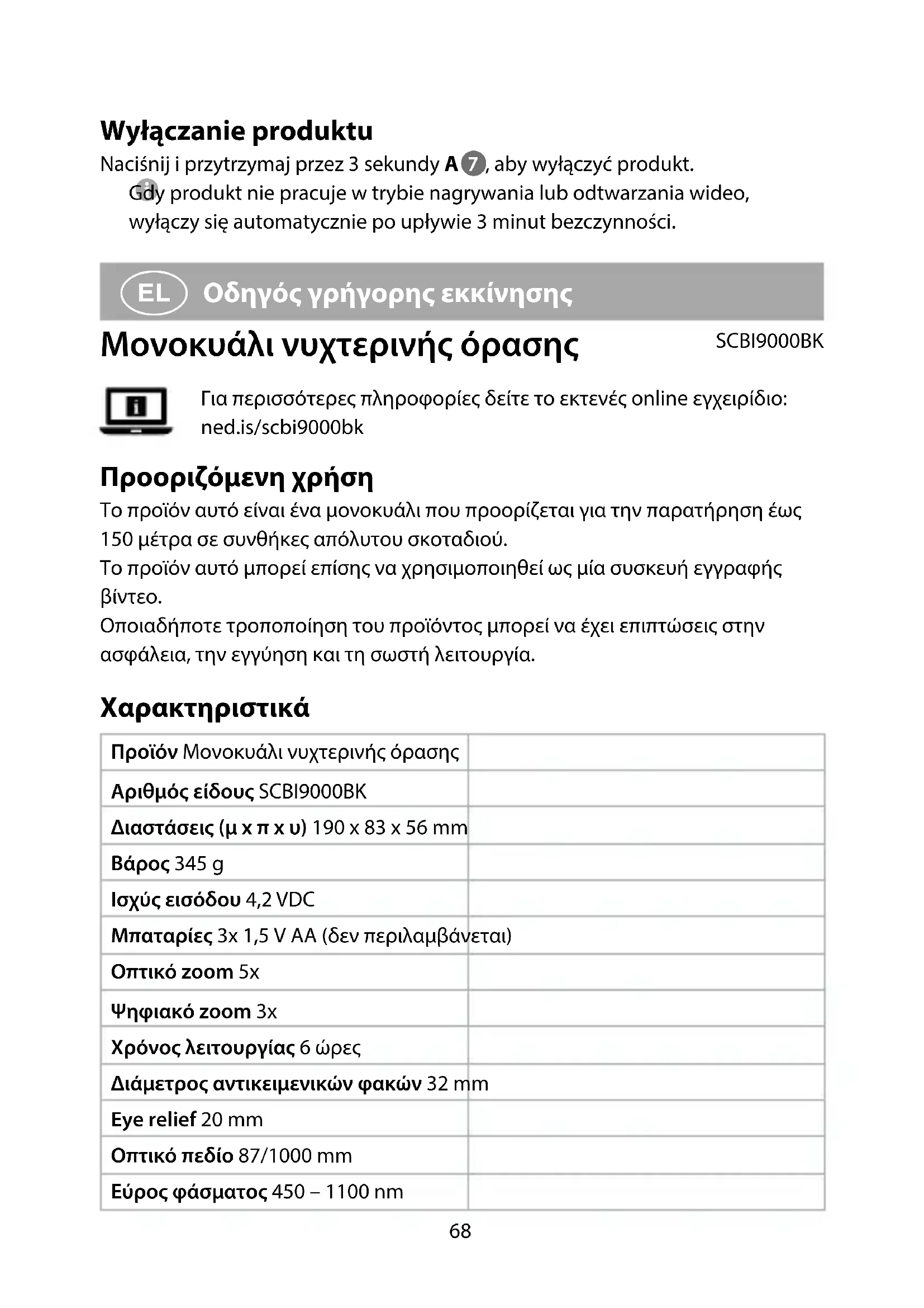 Οδηγός γρήγορης εκκίνησης Μονοκυάλι νυχτερινής όρασης SCBI9000BKΓια περισσότερες πληροφορίες δείτε το εκτενές online εγχειρίδιο: ned.is/scbi9000bk Προοριζόμενη χρήση Το προϊόν αυτό είναι ένα μονοκυάλι που προορίζεται για την παρατήρηση έως 150 μέτρα σε συνθήκες απόλυτου σκοταδιού.Το προϊόν αυτό μπορεί επίσης να χρησιμοποιηθεί ως μία συσκευή εγγραφής βίντεο.Οποιαδήποτε τροποποίηση του προϊόντος μπορεί να έχει επιπτώσεις στην ασφάλεια, την εγγύηση και τη σωστή λειτουργία. Χαρακτηριστικά Προϊόν Μονοκυάλι νυχτερινής όρασηςΑριθμός είδους SCBI9000BKΔιαστάσεις (μ x π x υ) 190 x 83 x 56 mmΒάρος 345 gΙσχύς εισόδου 4,2 VDCΜπαταρίες 3x 1,5 V AA (δεν περιλαμβάνεται)Οπτικό zoom 5xΨηφιακό zoom 3xΧρόνος λειτουργίας 6 ώρεςΔιάμετρος αντικειμενικών φακών 32 mmEye relief 20 mmΟπτικό πεδίο 87/1000 mmΕύρος φάσματος 450 – 1100 nm69 Απόσταση οπτικού πεδίου σε