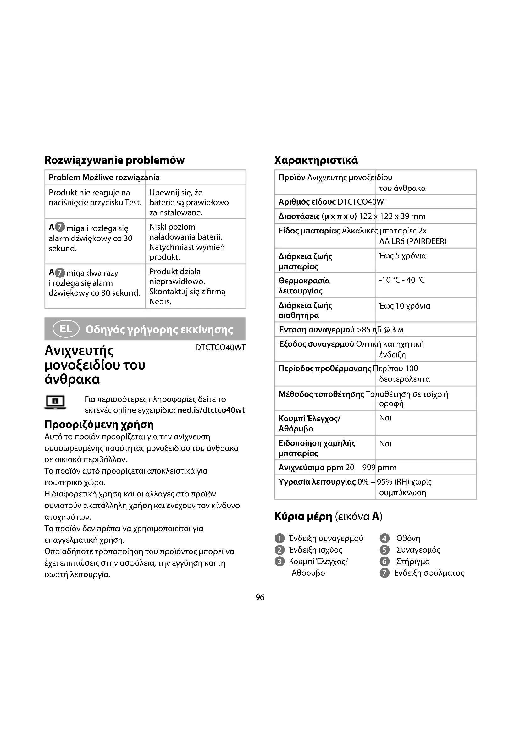 DTCTCO40WT Για περισσότερες πληροφορίες δείτε το εκτενές online εγχειρίδιο: ned.is/dtctco40wt Προοριζόμενη χρήση Αυτό το προϊόν προορίζεται για την ανίχνευση συσσωρευμένης ποσότητας μονοξειδίου του άνθρακα σε οικιακό περιβάλλον. Το προϊόν αυτό προορίζεται αποκλειστικά για εσωτερικό χώρο. Η διαφορετική χρήση και οι αλλαγές στο προϊόν συνιστούν ακατάλληλη χρήση και ενέχουν τον κίνδυνο ατυχημάτων. Το προϊόν δεν πρέπει να χρησιμοποιείται για επαγγελματική χρήση. Οποιαδήποτε τροποποίηση του προϊόντος μπορεί να έχει επιπτώσεις στην ασφάλεια, την εγγύηση και τη σωστή λειτουργία. Χαρακτηριστικά Προϊόν Ανιχνευτής μονοξειδίου του άνθρακα Αριθμός είδους DTCTCO40WT Διαστάσεις (μ x π x υ) 122 x 122 x 39 mm Είδος μπαταρίας Αλκαλικές μπαταρίες 2x AA LR6 (PAIRDEER) Διάρκεια ζωής