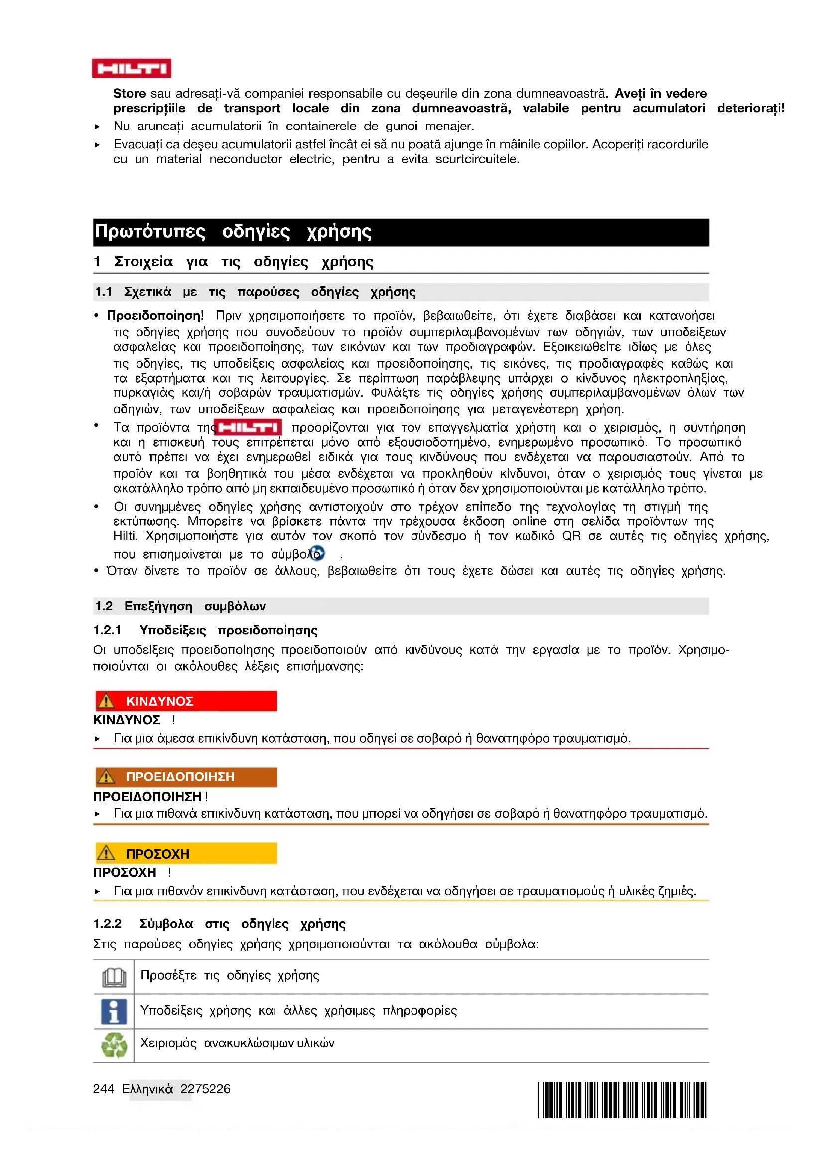 Στις παρούσες οδηγίες χρήσης χρησιμοποιούνται τα ακόλουθα σύμβολα: Προσέξτε τις οδηγίες χρήσης Υποδείξεις χρήσης και άλλες χρήσιμες πληροφορίες Χειρισμός ανακυκλώσιμων υλικών*2275226* 2275226 Ελληνικά 245 Μην πετάτε τα ηλεκτρικά εργαλεία και τις μπαταρίες στον κάδο οικιακών απορριμμάτων Hilti Επαναφορτιζόμενη μπαταρία LiIon Hilti Φορτιστής
