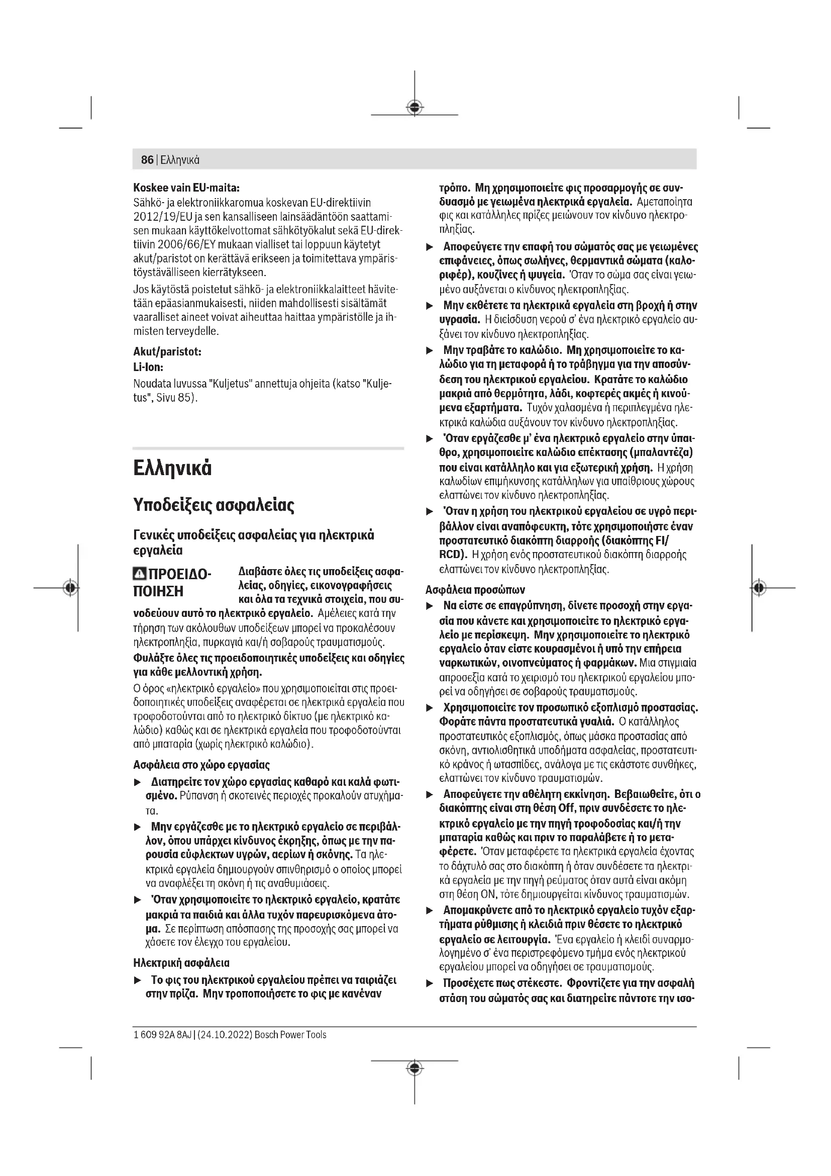 u Αποφεύγετε την επαφή του σώματός σας με γειωμένες επιφάνειες, όπως σωλήνες, θερμαντικά σώματα (καλο- ριφέρ), κουζίνες ή ψυγεία. Όταν το σώμα σας είναι γειω- μένο αυξάνεται ο κίνδυνος ηλεκτροπληξίας. u Μην εκθέτετε τα ηλεκτρικά εργαλεία στη βροχή ή στην υγρασία. Η διείσδυση νερού σ’ ένα ηλεκτρικό εργαλείο αυ- ξάνει τον κίνδυνο ηλεκτροπληξίας. u Μην τραβάτε το καλώδιο. Μη χρησιμοποιείτε το κα- λώδιο για τη μεταφορά ή το τράβηγμα για την αποσύν- δεση του ηλεκτρικού εργαλείου. Κρατάτε το καλώδιο μακριά από θερμότητα, λάδι, κοφτερές ακμές ή κινού- μενα εξαρτήματα. Τυχόν χαλασμένα ή περιπλεγμένα ηλε- κτρικά καλώδια αυξάνουν τον κίνδυνο ηλεκτροπληξίας. u Όταν εργάζεσθε μ’ ένα ηλεκτρικό εργαλείο στην ύπαι- θρο, χρησιμοποιείτε καλώδιο επέκτασης (μπαλαντέζα) που είναι κατάλληλο και για εξωτερική χρήση. Ηχρήση καλωδίων επιμήκυνσης κατάλληλων για υπαίθριους χώρους ελαττώνει τον κίνδυνο ηλεκτροπληξίας. u Όταν η χρήση του ηλεκτρικού εργαλείου σε υγρό περι- βάλλον είναι αναπόφευκτη, τότε χρησιμοποιήστε έναν προστατευτικό διακόπτη διαρροής (διακόπτηςFI/ RCD). Ηχρήση ενός προστατευτικού διακόπτη διαρροής ελαττώνει τον κίνδυνο ηλεκτροπληξίας. Ασφάλεια προσώπων u Να είστε σε επαγρύπνηση, δίνετε προσοχή στην εργα- σία που κάνετε και χρησιμοποιείτε το ηλεκτρικό εργα- λείο με περίσκεψη. Μην χρησιμοποιείτε το ηλεκτρικό εργαλείο όταν είστε κουρασμένοι ή υπό την επήρεια ναρκωτικών, οινοπνεύματος ή φαρμάκων. Μια στιγμιαία απροσεξία κατά το χειρισμό του ηλεκτρικού εργαλείου μπο- ρεί να οδηγήσει σε σοβαρούς τραυματισμούς. u Χρησιμοποιείτε τον προσωπικό εξοπλισμό προστασίας. Φοράτε πάντα προστατευτικά γυαλιά. Ο κατάλληλος προστατευτικός εξοπλισμός, όπως μάσκα προστασίας από σκόνη, αντιολισθητικά υποδήματα ασφαλείας, προστατευτι- κό κράνος ή ωτασπίδες, ανάλογα με τις εκάστοτε συνθήκες, ελαττώνει τον κίνδυνο τραυματισμών. u Αποφεύγετε την αθέλητη εκκίνηση. Βεβαιωθείτε, ότι ο διακόπτης είναι στη θέση Off, πριν συνδέσετε το ηλε- κτρικό εργαλείο με την πηγή τροφοδοσίας και/ή την μπαταρία καθώς και πριν το παραλάβετε ή το μετα- φέρετε. Όταν μεταφέρετε τα ηλεκτρικά εργαλεία έχοντας το δάχτυλό σας στο διακόπτη ή όταν συνδέσετε τα ηλεκτρι- κά εργαλεία με την πηγή ρεύματος όταν αυτά είναι ακόμη στη θέση ΟΝ, τότε δημιουργείται κίνδυνος τραυματισμών. u Απομακρύνετε από το ηλεκτρικό εργαλείο τυχόν εξαρ- τήματα ρύθμισης ή κλειδιά πριν θέσετε το ηλεκτρικό εργαλείο σε λειτουργία. Ένα εργαλείο ή κλειδί συναρμο- λογημένο σ’ ένα περιστρεφόμενο τμήμα ενός ηλεκτρικού εργαλείου μπορεί να οδηγήσει σε τραυματισμούς. u Προσέχετε πως στέκεστε. Φροντίζετε για την ασφαλή στάση του σώματός σας και διατηρείτε πάντοτε την ισο- 1 609 92A 8AJ | (24.10.2022) Bosch Power ToolsΕλληνικά | 87 ρροπία σας. Έτσι μπορείτε να ελέγξετε καλύτερα το ηλε- κτρικό εργαλείο σε περιπτώσεις απροσδόκητων περιστάσε-