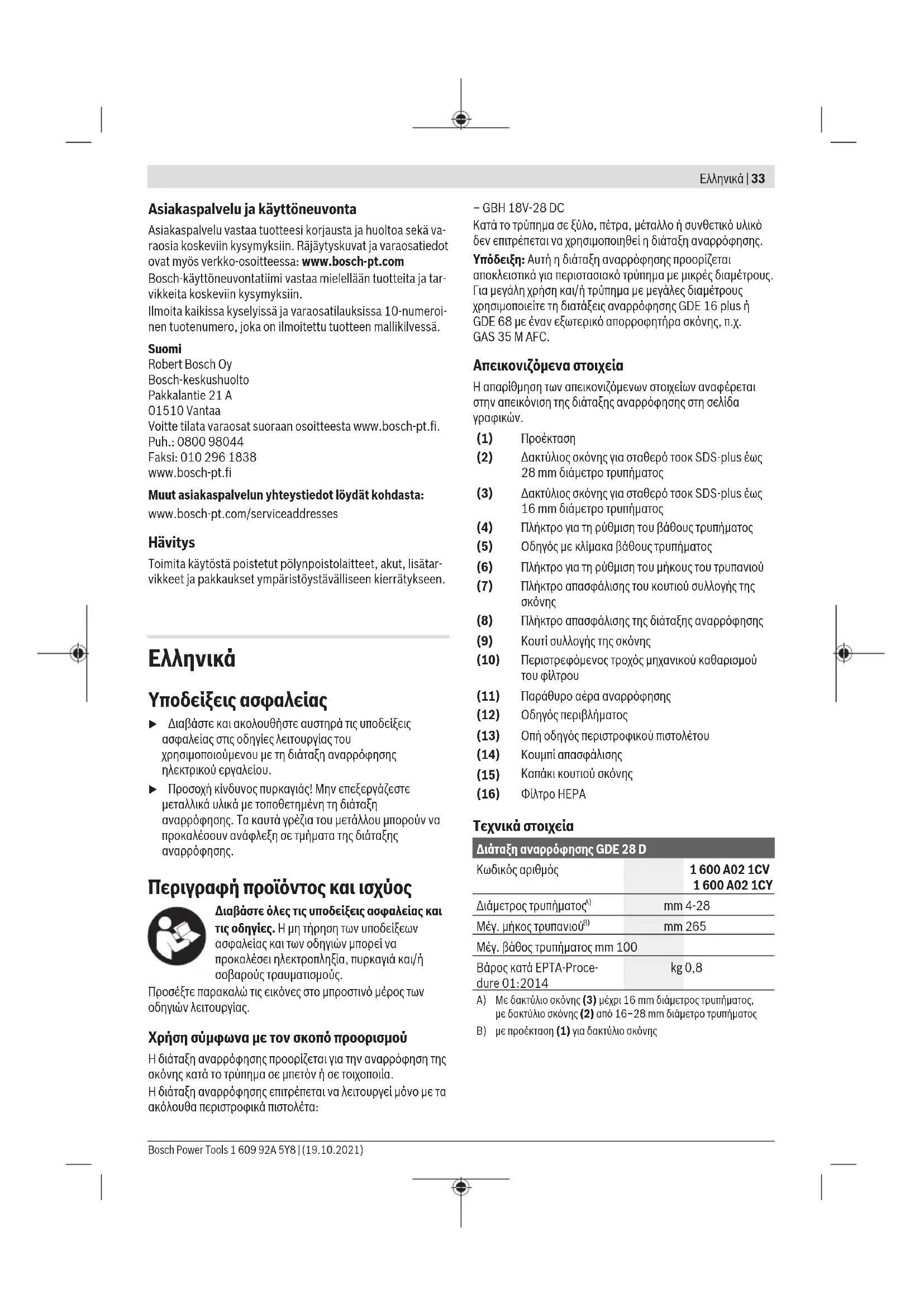 (8) Πλήκτρο απασφάλισης της διάταξης αναρρόφησης (9) Κουτί συλλογής της σκόνης (10) Περιστρεφόμενος τροχός μηχανικού καθαρισμού του φίλτρου (11) Παράθυρο αέρα αναρρόφησης (12) Οδηγός περιβλήματος (13) Οπή οδηγός περιστροφικού πιστολέτου (14) Κουμπί απασφάλισης (15) Καπάκι κουτιού σκόνης (16) Φίλτρο HEPA Τεχνικά στοιχεία Διάταξη αναρρόφησης GDE 28 D Κωδικός αριθμός 1 600 A02 1CV 1 600 A02 1CY Διάμετρος τρυπήματος