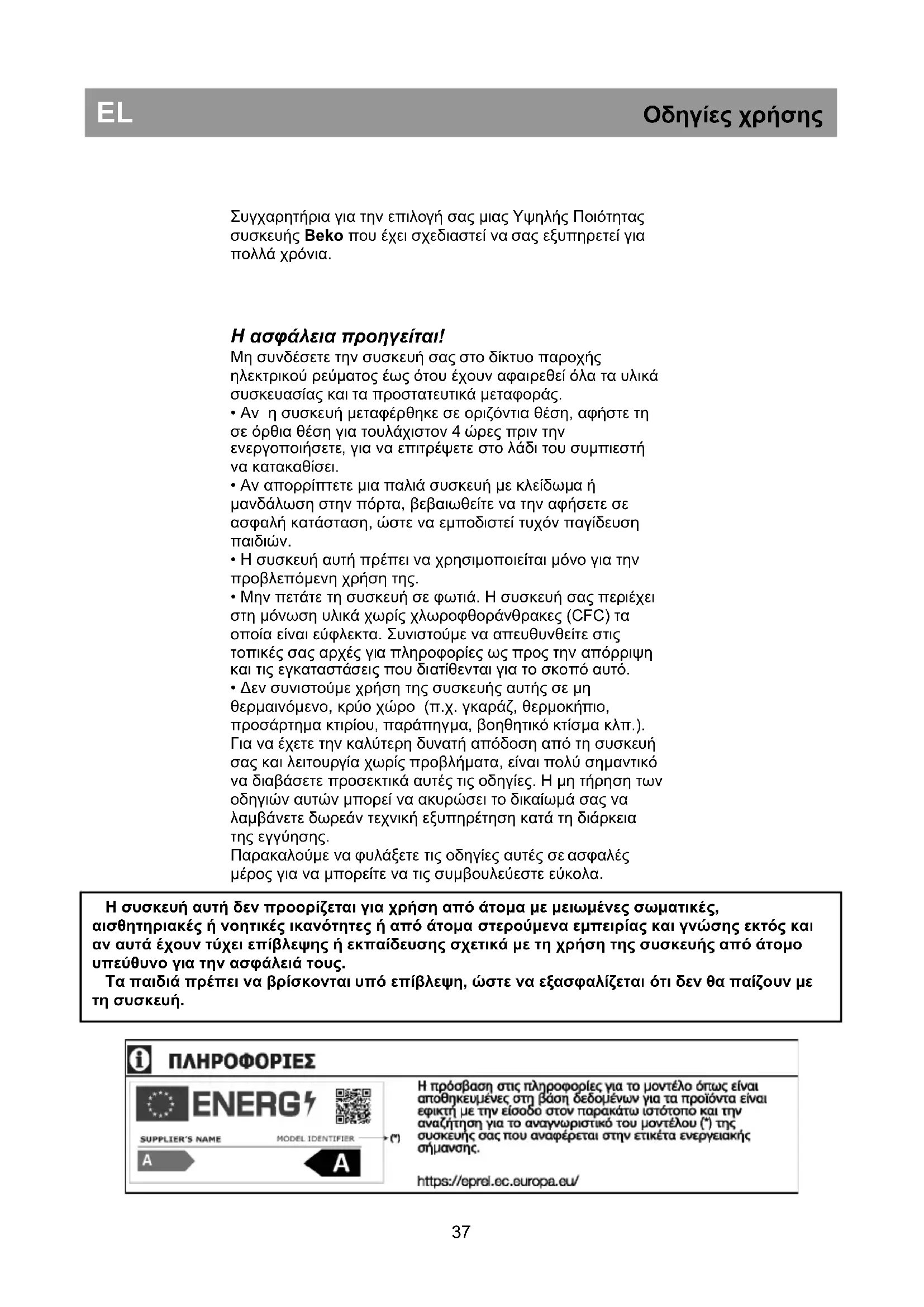 ste kupili proizvod.Συγχαρητήρια για την επιλογή σας μιας Υψηλής Ποιότητας συσκευής Beko που έχει σχεδιαστεί να σας εξυπηρετεί για πολλά χρόνια.