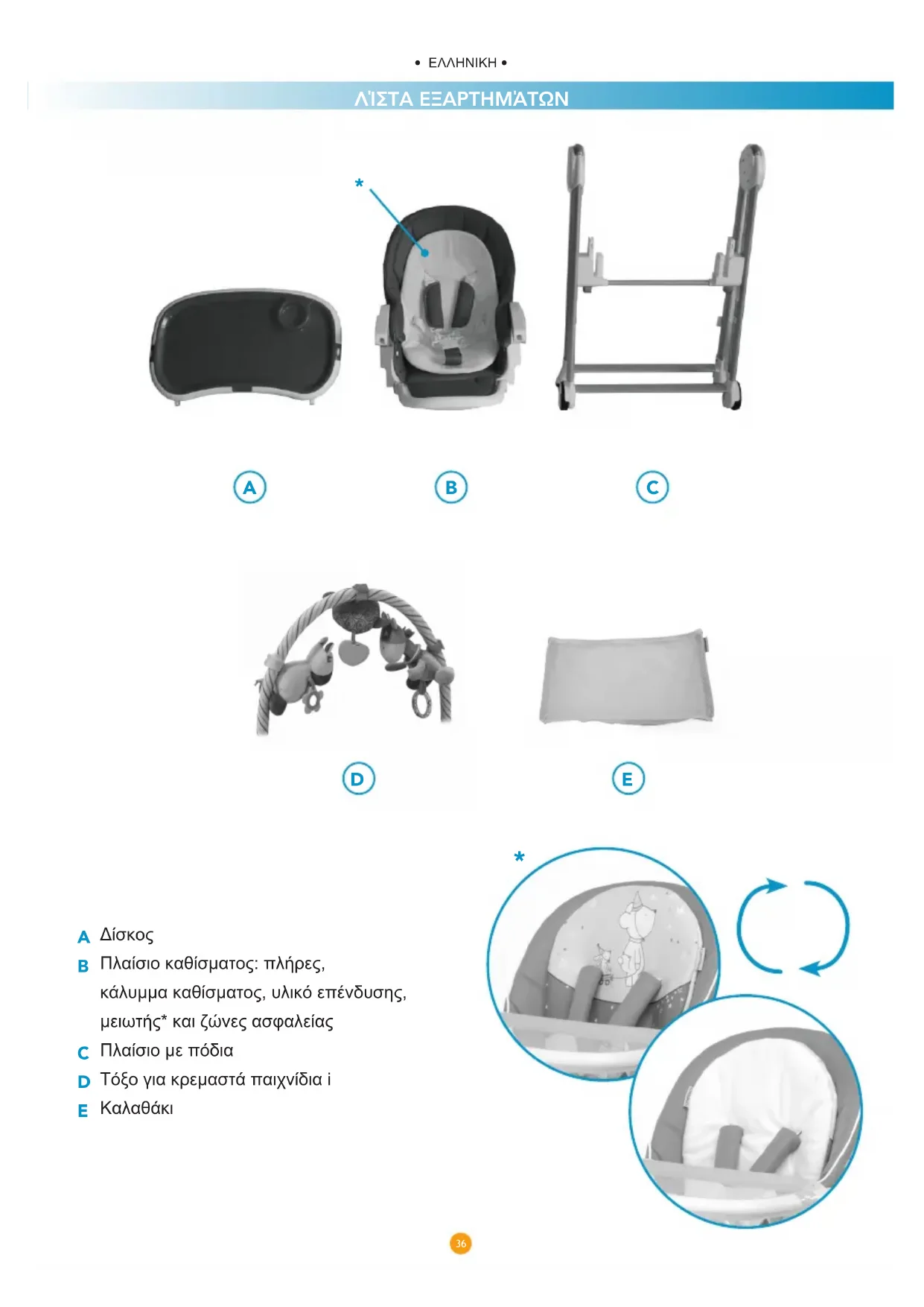 Πλαίσιο καθίσματος: πλήρες, κάλυμμα καθίσματος, υλικό επένδυσης, μειωτής* και ζώνες ασφαλείας Πλαίσιο με πόδια Τόξο για κρεμαστά παιχνίδια i