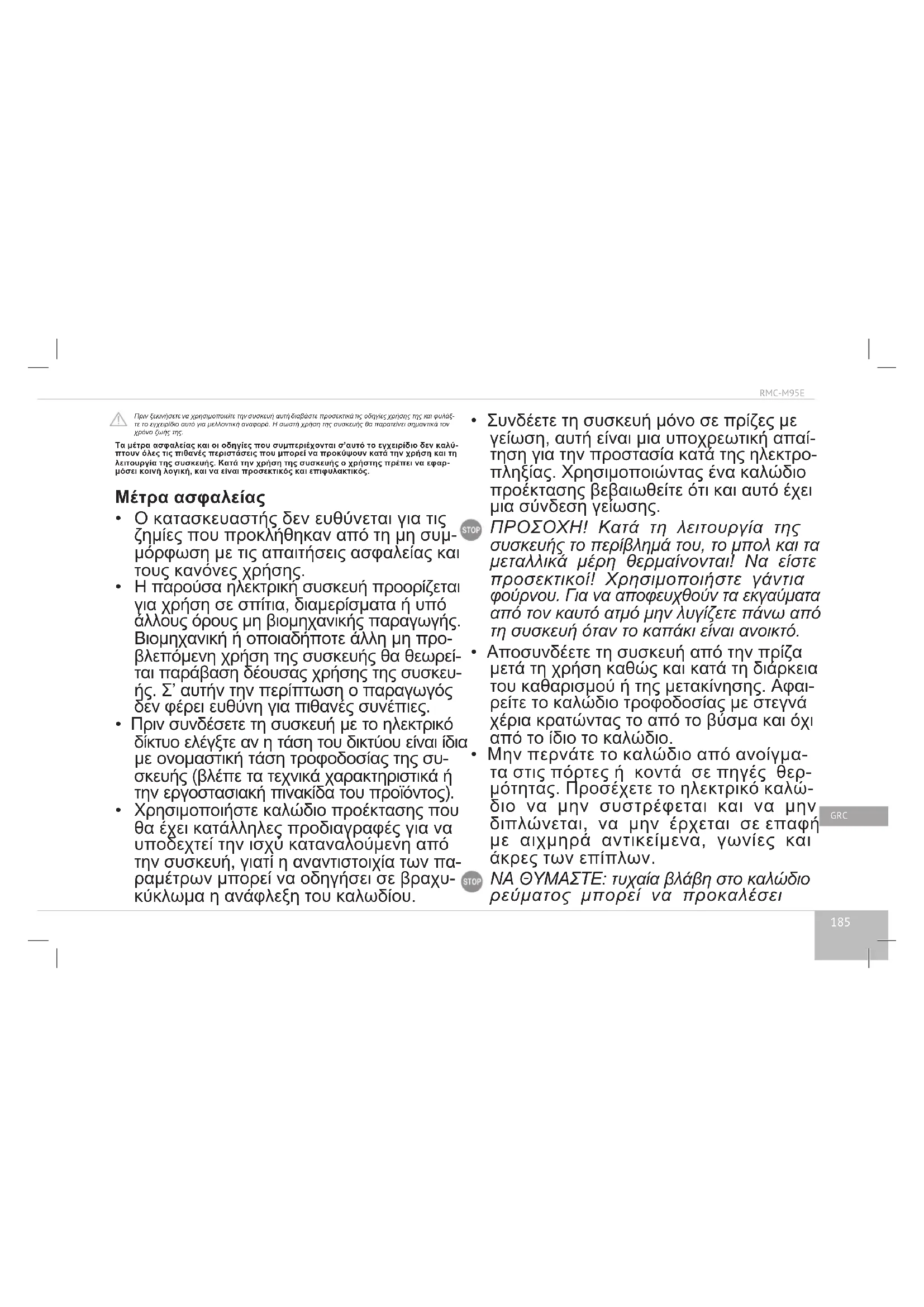 (Σελίδα 8) για τη διαδικασία καθαρισμού. Προσοχή! Για να αποφύγετε την παραμόρφωση της λαστιχένιας σφραγίδας βαλβίδων, μην το στρίβετε ή το τραβάτε έξω κατά την αφαίρεση, τον καθαρισμό και την εγκατάσταση. Αφαίρεση συμπυκνωμάτων Σε αυτό το μοντέλο, το συμπύκνωμα που συσσωρεύεται σε ειδική κοιλότητα για το σώμα της συσκευής γύρω από το μπολ και τις ροές μέσα στο ειδικό δοχείο που βρίσκεται στο πίσω μέρος της συσκευής. Για να καθαρίσε- τε το δοχείο, ξεπλύνετε το με τρεχούμενο νερό, σύμφωνα με τους παραπάνω κανόνες. Αφαιρέστε τυχόν υπολει- πόμενη συμπύκνωση στην κοιλότητα γύρω από το μπολ με ένα πανί κουζίνας. Καθαρισμός του θαλάμου εργασίας Σε αυστηρή συμμόρφωση με τις οδηγίες του παρόντος εγχειριδίου, η πιθανότητα εισόδου υγρών, σωματιδίων τροφίμων ή υπολειμμάτων στον θάλαμο εργασίας της συσκευής είναι ελάχιστη. Εάν έχει σημειωθεί σημαντική μόλυνση, οι επιφάνειες του θαλάμου εργασίας πρέπει να καθαρίζονται για να αποφεύγεται η εσφαλμένη λειτουργία ή βλάβη της συσκευής. Πριν από τον καθαρισμό του θαλάμου εργασίας της συσκευής, βεβαιωθείτε ότι η συσκευή είναι αποσυνδεδε- μένη και εντελώς ψύχεται! Τα πλευρικά τοιχώματα του θαλάμου εργασίας, η επιφάνεια του δίσκου θέρμανσης και το περίβλημα του αισθη- τήρα Κεντρικής θερμοκρασίας (βρίσκεται στη μέση του δίσκου θέρμανσης) μπορεί να καθαριστεί υγραίνεται (δεν είναι υγρό!) σφουγγάρι ή ύφασμα. Εάν χρησιμοποιείτε απορρυπαντικό, θα πρέπει προσεκτικά να αφαιρέσετε το υπόλειμμα για να αποφευχθεί η εμφάνιση ανεπιθύμητων οσμών κατά τη διάρκεια της μετέπειτα μαγείρεμα. Αν ξένων σωκάτων κέσα στην εσοχή γύρω από τον κεντρικό αισθητήρα θερμοκρασίας, αφαιρέστε τα προσεκτι- κά με τσιμπιδάκι, χωρίς να πιέζετε τον αισθητήρα κατοικίας. Εάν η επιφάνεια του δίσκου θέρμανσης είναι βρώμικη, επιτρέπεται να χρησιμοποιηθεί υγρός σπόγγος μέσης σκληρότητας ή συνθετική βούρτσα. Με την τακτική χρήση της συσκευής την πάροδο του χρόνου, το χρώμα του δίσκου θέρμανσης μπορεί να αλλάξει πλήρως ή εν μέρει. Αυτό δεν αποτελεί ένδειξη δυσλειτουργίας και δεν επηρεάζει τη σωστή λειτουργία της συσκευής. Μεταφορά και Αποθήκευση Πριν από τη συντήρηση και την επόμενη χρήση καθαρίστε και στεγνώστε όλα τα εξανθήματα της συσκευής. Αποθηκεύστε τη συσκευή σε ξηρό , αεριζόμενο χώρο, μακριά από τη θερμότητα και το άμεσο ηλιακό φως . Κατά τη μεταφορά και την αποθήκευση απαγορεύεται να εκθέτετε τη συσκευή σε μηχανική καταπόνηση , που μπορεί να οδηγήσει σε βλάβη της συσκευής ή / παραβίαση της ακεραιότητας της συσκευασίας . Είναι αναγκαίο να προστατεύετε τη συσκευασία της συσκευής από το νερό και άλλα υγρά.191 RMC-M95E GBR FRA DEU ITA ESP PRT DNK NOR SWE FIN ROU HUN BGR HRV CZE SVK SVN POL LTU LVA EST SRB GRC RUS UKR