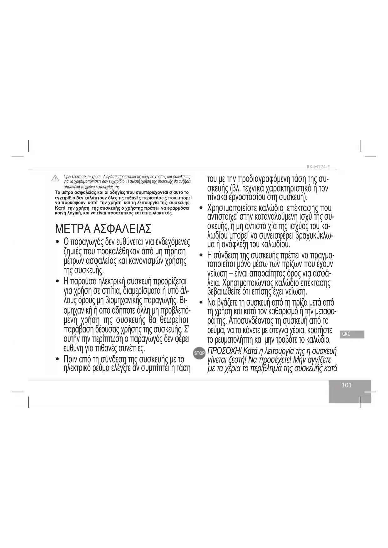 Η συσκευή μπορεί να χρησιμοποιείται από παιδιά της ηλικίας των 8 χρονών και άνω, και άτομα με μειωμένες ψυχοφυσικές ή νοητικές ικανότητες, ή με ανεπαρκή εμπειρία ή γνώση,103 RK-M124-E GBR FRA DEU NLD ITA ESP PRT DNK NOR SWE FIN LTU LVA EST ROU HUN BGR HRV SVK CZE POL GRС GRС TUR UKR KAZ μόνο αν επιβλέπονται ή τους παρέχονται οδη- γίες σχετικά με την ασφαλή χρήση της συσκευ- ής και τους κινδύνους της. Τα παιδιά δεν πρέ- πει να παίζουν με τη συσκευή. Ο καθαρισμός και η συντήρηση της συσκευής δεν πρέπει να γίνεται από τα παιδιά χωρίς επίβλεψη. Φυλάξ- τε τη συσκευή και το ηλεκτρικό καλώδιο στο χώρο μη προσβάσιμο από παιδιά κάτω 8 ετών.