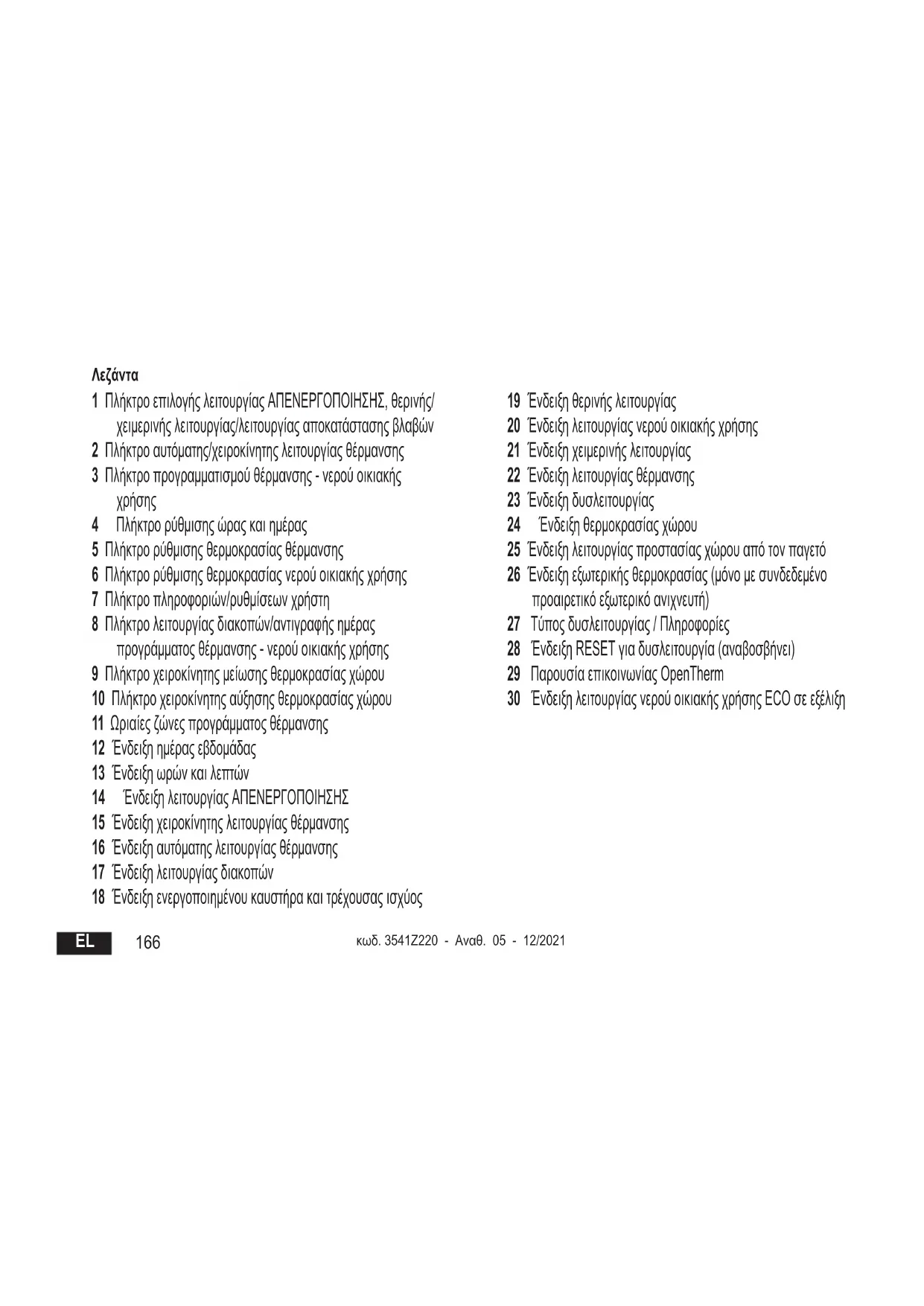 165Λεζάντα 1 ΠλήκτροεπιλογήςλειτουργίαςΑΠΕΝΕΡΓΟΠΟΙΗΣΗΣ,θερινής/ χειμερινήςλειτουργίας/λειτουργίαςαποκατάστασηςβλαβών 2 Πλήκτροαυτόματης/χειροκίνητηςλειτουργίαςθέρμανσης 3 Πλήκτροπρογραμματισμούθέρμανσης-νερούοικιακής
