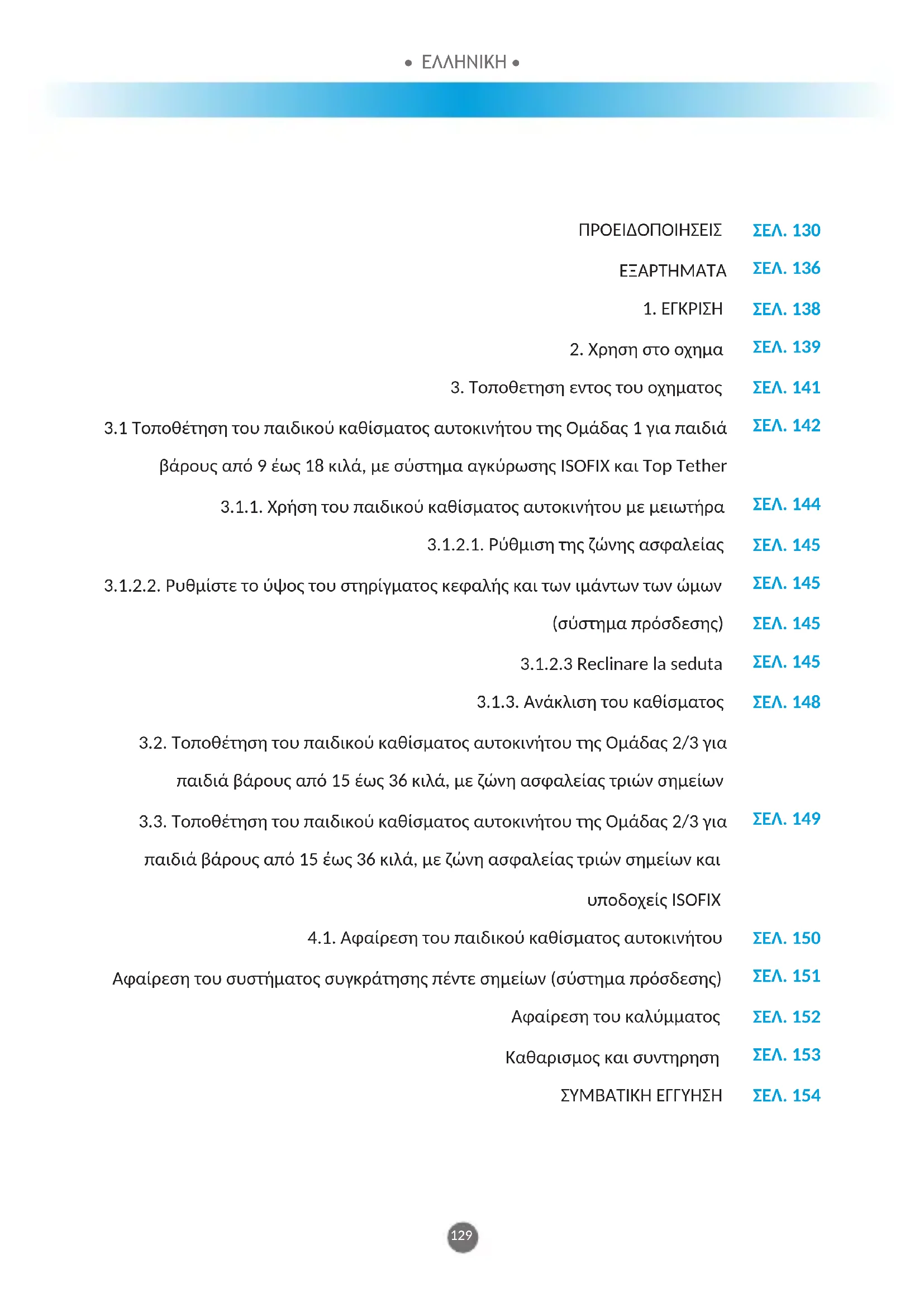 3.2. Τοποθέτηση του παιδικού καθίσματος αυτοκινήτου της Ομάδας 2/3 για παιδιά βάρους από 15 έως 36 κιλά, με ζώνη ασφαλείας τριών σημείων 3.3. Τοποθέτηση του παιδικού καθίσματος αυτοκινήτου της Ομάδας 2/3 για παιδιά βάρους από 15 έως 36 κιλά, με ζώνη ασφαλείας τριών σημείων και υποδοχείς ISOFIX 4.1. Αφαίρεση του παιδικού καθίσματος αυτοκινήτου Αφαίρεση του συστήματος συγκράτησης πέντε σημείων (σύστημα πρόσδεσης) Αφαίρεση του καλύμματος Καθαρισμος και συντηρηση ΣΥΜΒΑΤΙΚΗ ΕΓΓΥΗΣΗ• ΕΛΛΗΝΙΚΗ • • ΕΛΛΗΝΙΚΗ •