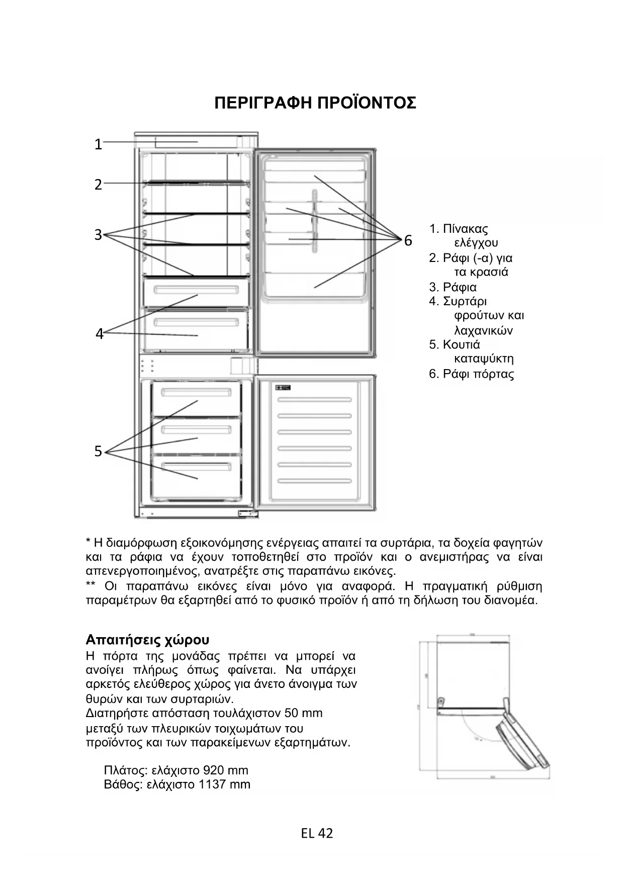 - Η διαμόρφωση εξοικονόμησης ενέργειας απαιτεί τα συρτάρια, τα δοχεία φαγητών και τα ράφια να έχουν τοποθετηθεί στο προϊόν και ο ανεμιστήρας να είναι απενεργοποιημένος, ανατρέξτε στις παραπάνω εικόνες. ** Οι παραπάνω εικόνες είναι μόνο για αναφορά. Η πραγματική ρύθμιση παραμέτρων θα εξαρτηθεί από το φυσικό προϊόν ή από τη δήλωση του διανομέα. Απαιτήσεις χώρου Η πόρτα της μονάδας πρέπει να μπορεί να ανοίγει πλήρως όπως φαίνεται. Να υπάρχει αρκετός ελεύθερος χώρος για άνετο άνοιγμα των θυρών και των συρταριών. Διατηρήστε απόσταση τουλάχιστον 50 mm μεταξύ των πλευρικών τοιχωμάτων του προϊόντος και των παρακείμενων εξαρτημάτων.Πλάτος: ελάχιστο 920 mmΒάθος: ελάχιστο 1137 mm1. Πίνακαςελέγχου2. Ράφι (-α) γιατα κρασιά3. Ράφια4. Συρτάριφρούτων καιλαχανικών5. Κουτιάκαταψύκτη6. Ράφι πόρτας