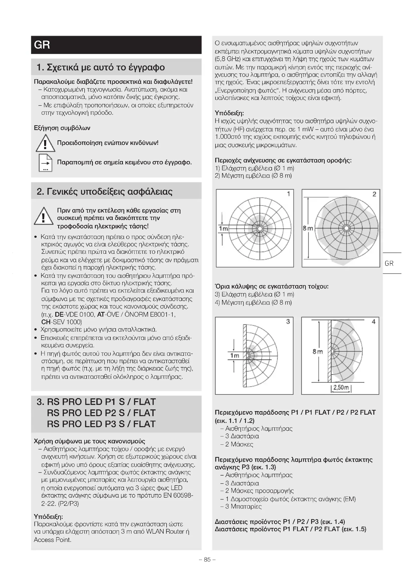 Feil Årsak Tiltak Grønn ladekontroll-LED lyser ikke ■ Nødlysmodulen er ikke smettet riktig på plass ■ Ingen spenning ■ Nødlys-LED-er defekt ■ Kontroller spenningen ■ Skift batterier ■ Kontroller at alle batterier er satt inn og ligger i riktig retning Grønn ladekontroll-LED PÅ, nødlys-LED-er tennes ikke med tasten ■ Batteriene er nesten tomme ■ Battericellen er defekt ■ Kontroller spenningen ■ Kontroller at batteriene ligger i riktig retning, sjekk ladetilstanden Grønn ladekontroll-LED AV, kobles inn sammen med nødlys-LED-ene ved trykk på tasten ■ Batteriet er satt feil eller ikke helt inn ■ Kontroller at alle batterier er satt inn og ligger i riktig retning Skift ev. batterier Nødlys LED-ene slukkes straks det tryk- kes på «Test»-tasten ■ Batteriene er tomme eller defekte ■ Kontroller nettilkoblingen for nød- lysmodulen, grønn ladekontroll-LED må lyse– 85 –Ο ενσωματωμένος αισθητήρας υψηλών συχνοτήτων εκπέμπει ηλεκτρομαγνητικά κύματα υψηλών συχνοτήτων (5,8GHz) και επιτυγχάνει τη λήψη της ηχούς των κυμάτων αυτών. Με την παραμικρή κίνηση εντός της περιοχής ανί-χνευσης του λαμπτήρα, ο αισθητήρας εντοπίζει την αλλαγή της ηχούς. Ένας μικροεπεξεργαστής δίνει τότε την εντολή „Ενεργοποίηση φωτός“. Η ανίχνευση μέσα από πόρτες, υαλοπίνακες και λεπτούς τοίχους είναι εφικτή.Υπόδειξη: H ισχύς υψηλής συχνότητας του αισθητήρα υψηλών συχνο-τήτων (HF) ανέρχεται περ. σε 1mW – αυτό είναι μόνο ένα 1.000στό της ισχύος εκπομπής ενός κινητού τηλεφώνου ή μιας συσκευής μικροκυμάτων.Περιοχές ανίχνευσης σε εγκατάσταση οροφής:1) Ελάχιστη εμβέλεια (Ø 1m)2) Mέγιστη εμβέλεια (Ø 8m)Όρια κάλυψης σε εγκατάσταση τοίχου:3) Ελάχιστη εμβέλεια (Ø 1m)4) Mέγιστη εμβέλεια (Ø 8m)Περιεχόμενο παράδοσης P1 / P1 FLAT / P2 / P2 FLAT (εικ.1.1 / 1.2) – Αισθητήριος λαμπτήρας – 3 Διαστάρια – 2 ΜάσκεςΠεριεχόμενο παράδοσης λαμπτήρα φωτός έκτακτης ανάγκης P3 (εικ.1.3) – Αισθητήριος λαμπτήρας – 3 Διαστάρια – 2 Μάσκες προσαρμογής – 1 Δομοστοιχείο φωτός έκτακτης ανάγκης (EM) – 3 Μπαταρίες Διαστάσεις προϊόντος P1 / P2 / P3 (εικ.1.4)Διαστάσεις προϊόντος P1 FLAT / P2 FLAT (εικ.1.5)